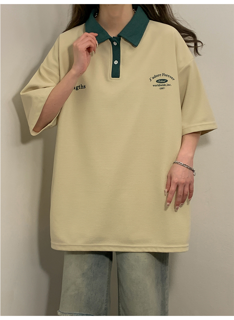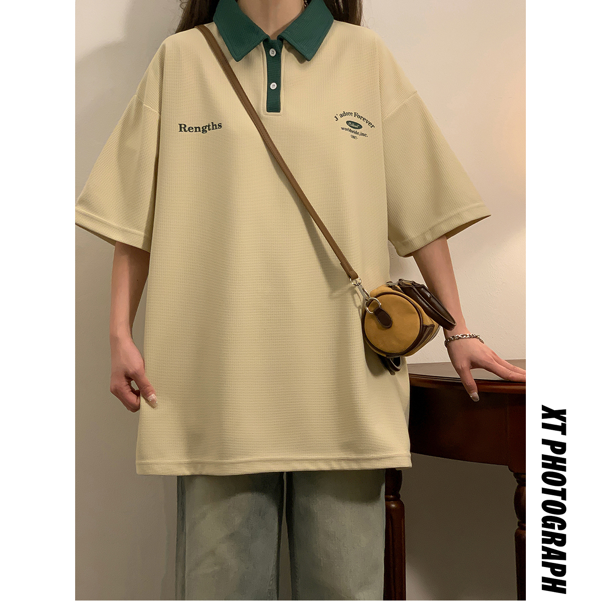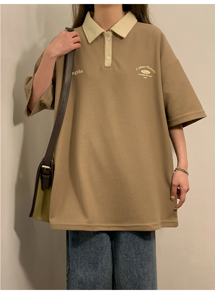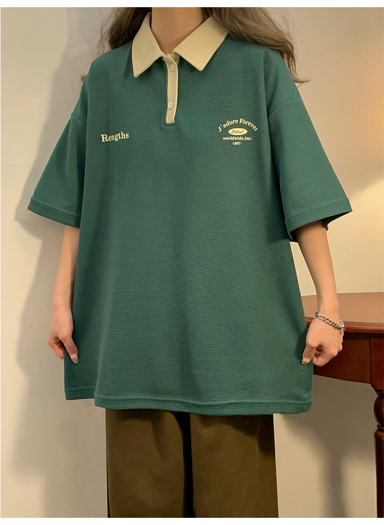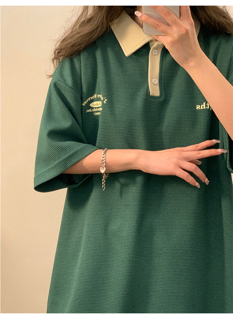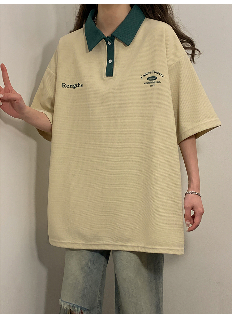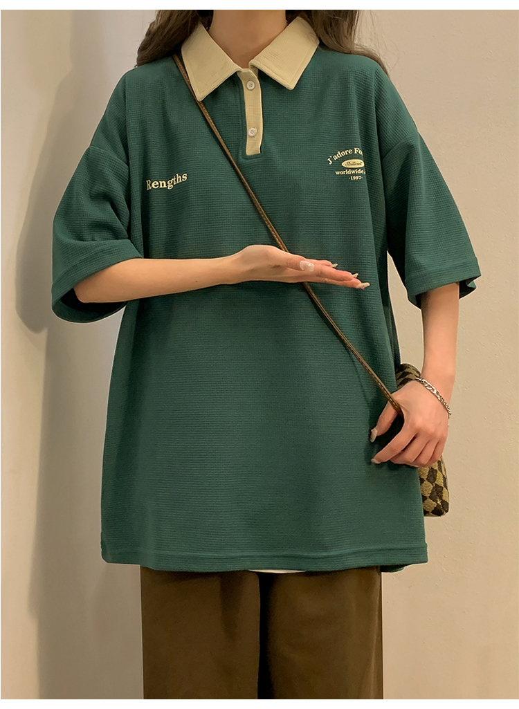 日系正肩Polo衫女夏季大尺碼美式短袖t恤2023新款T恤寬鬆半袖上衣