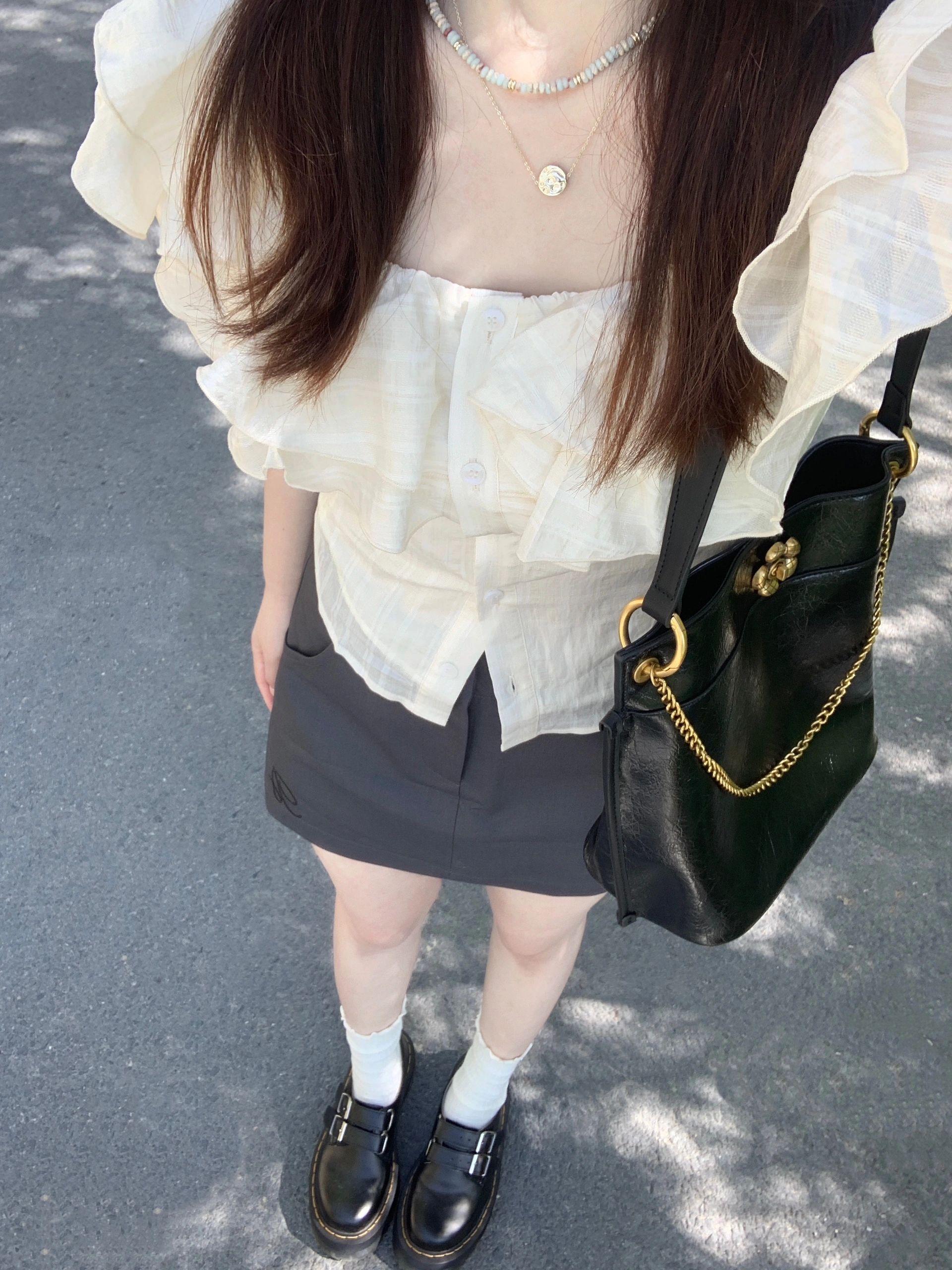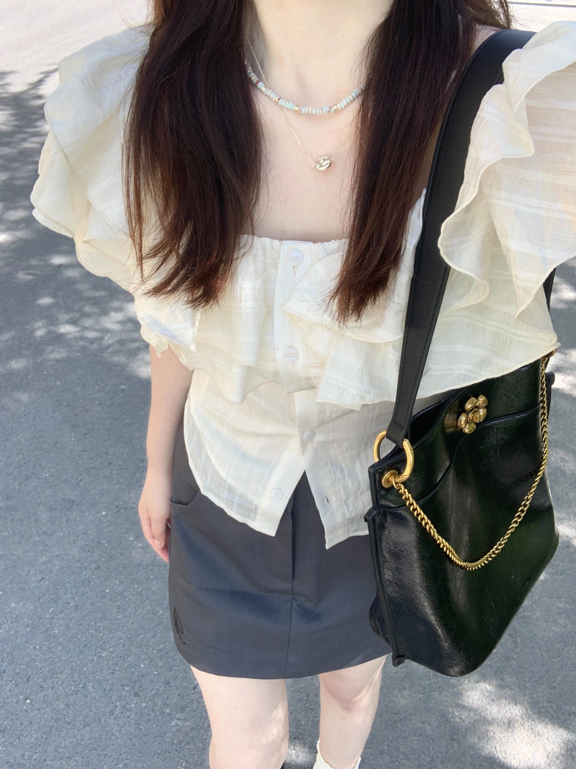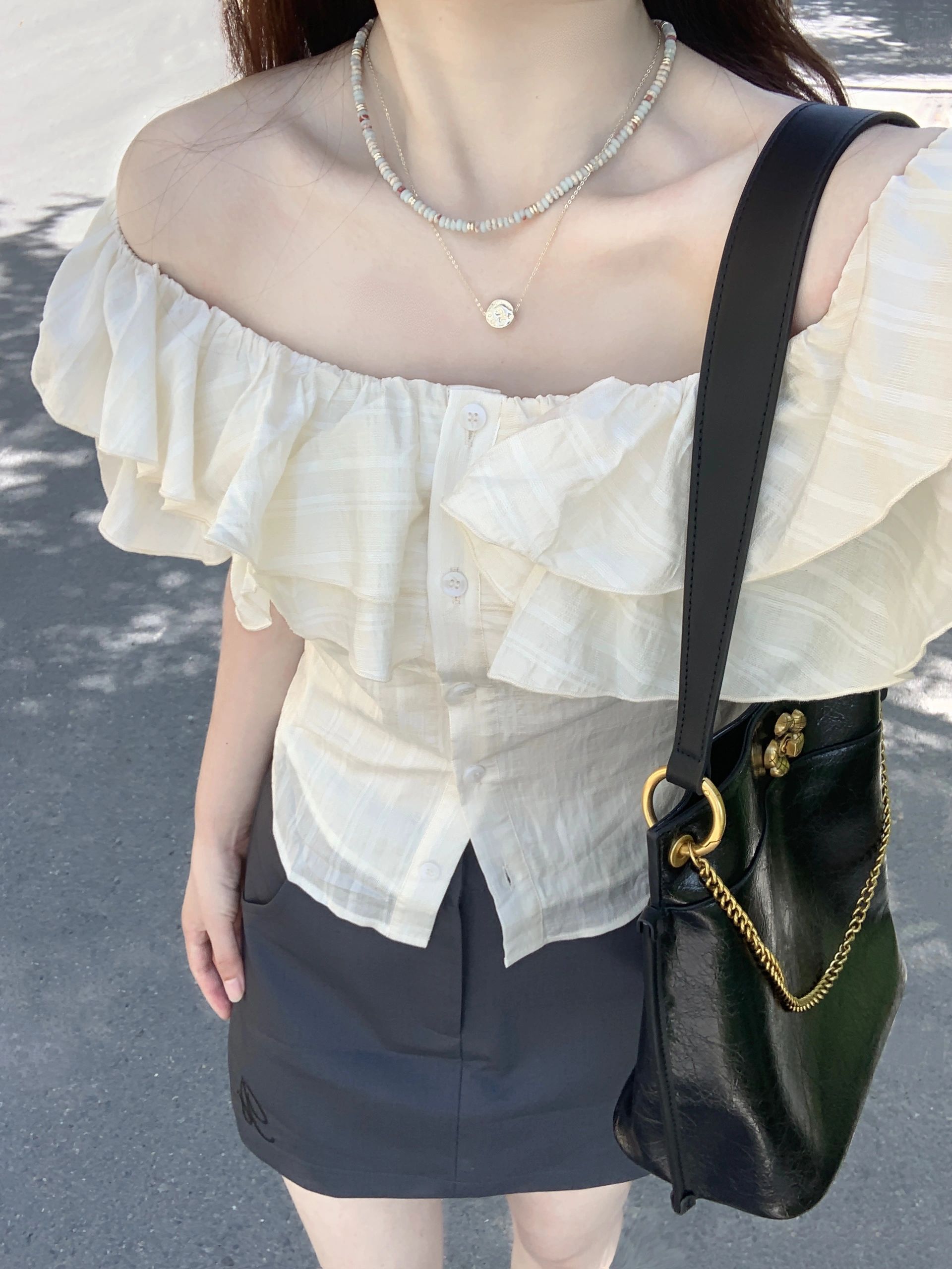 杏色法式短袖襯衫女2023新款夏季顯瘦荷葉邊一字肩上衣設計感小眾