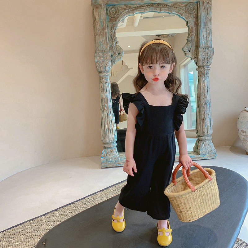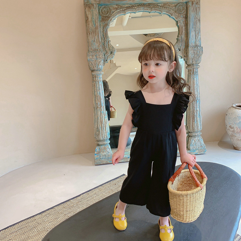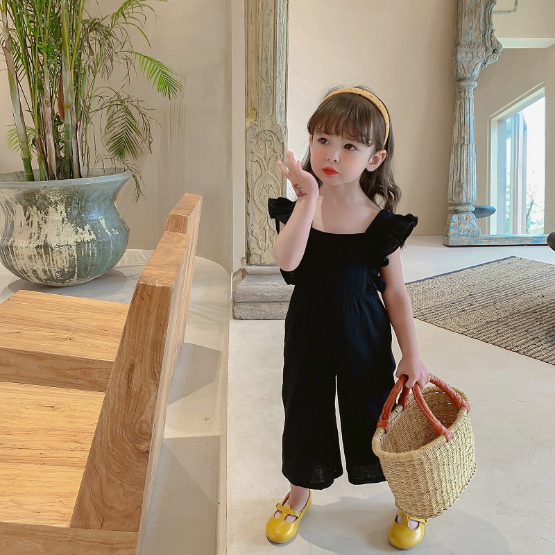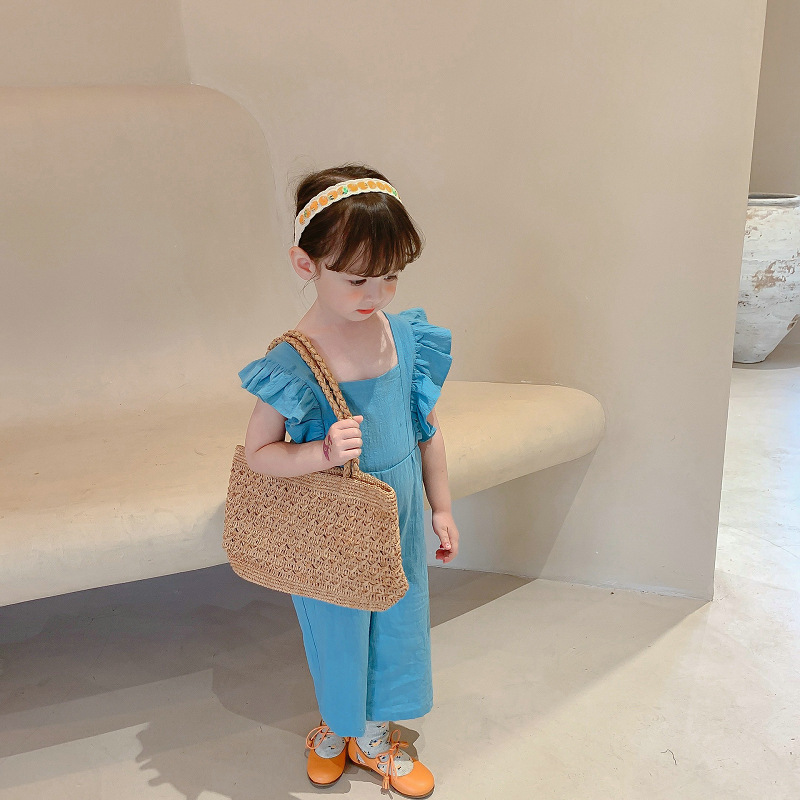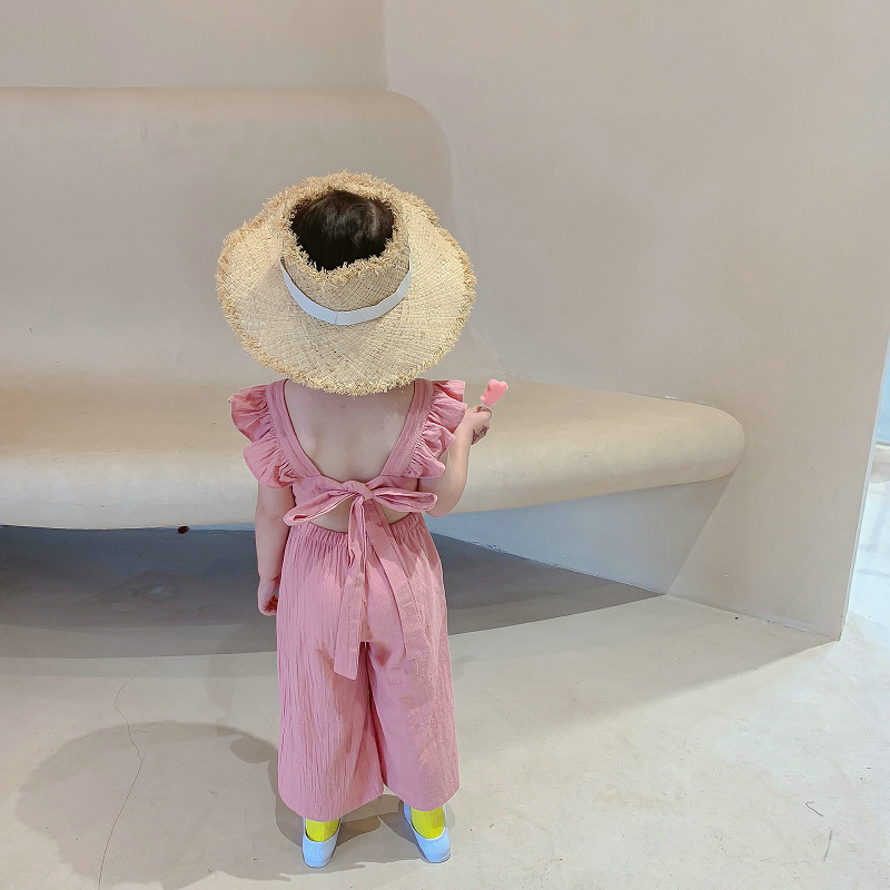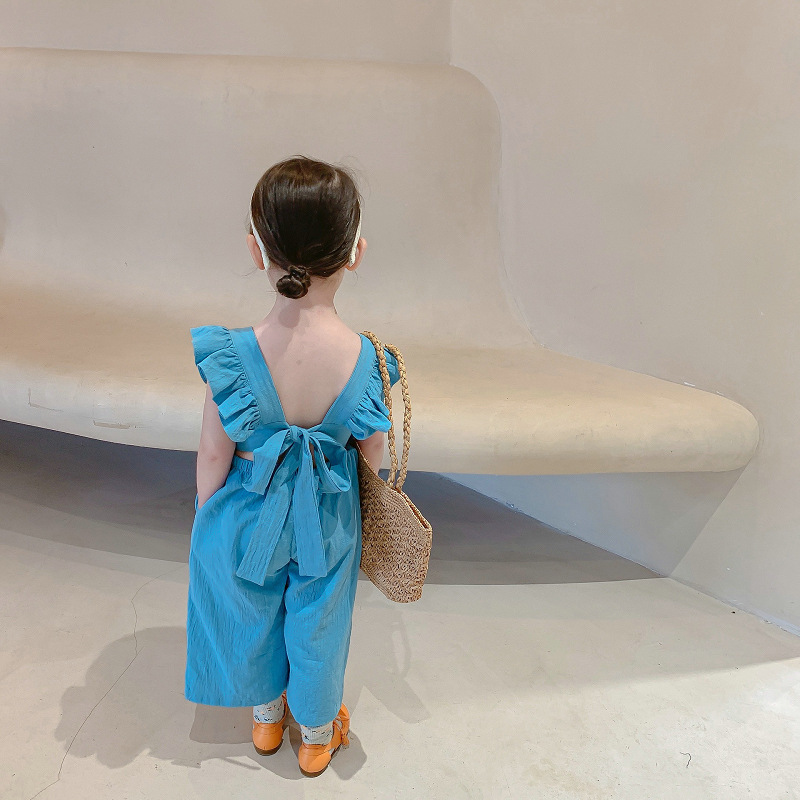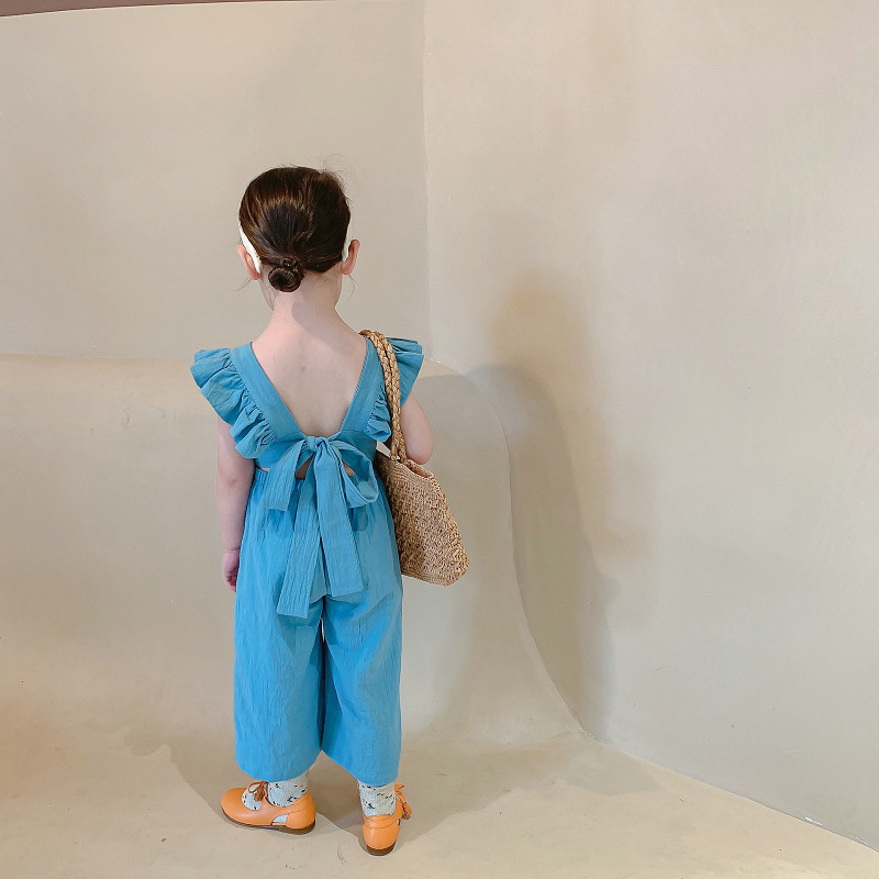 洋气童连体衣2023夏季新款棉质女童韩版气质飞袖露背蝴蝶结连体裤
