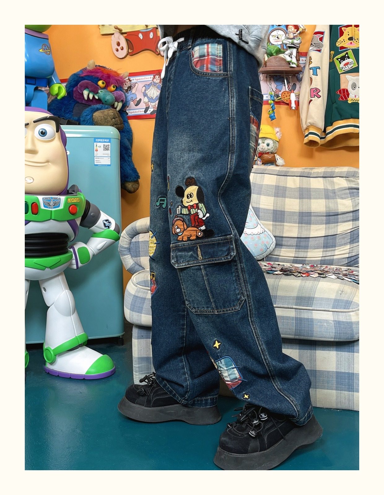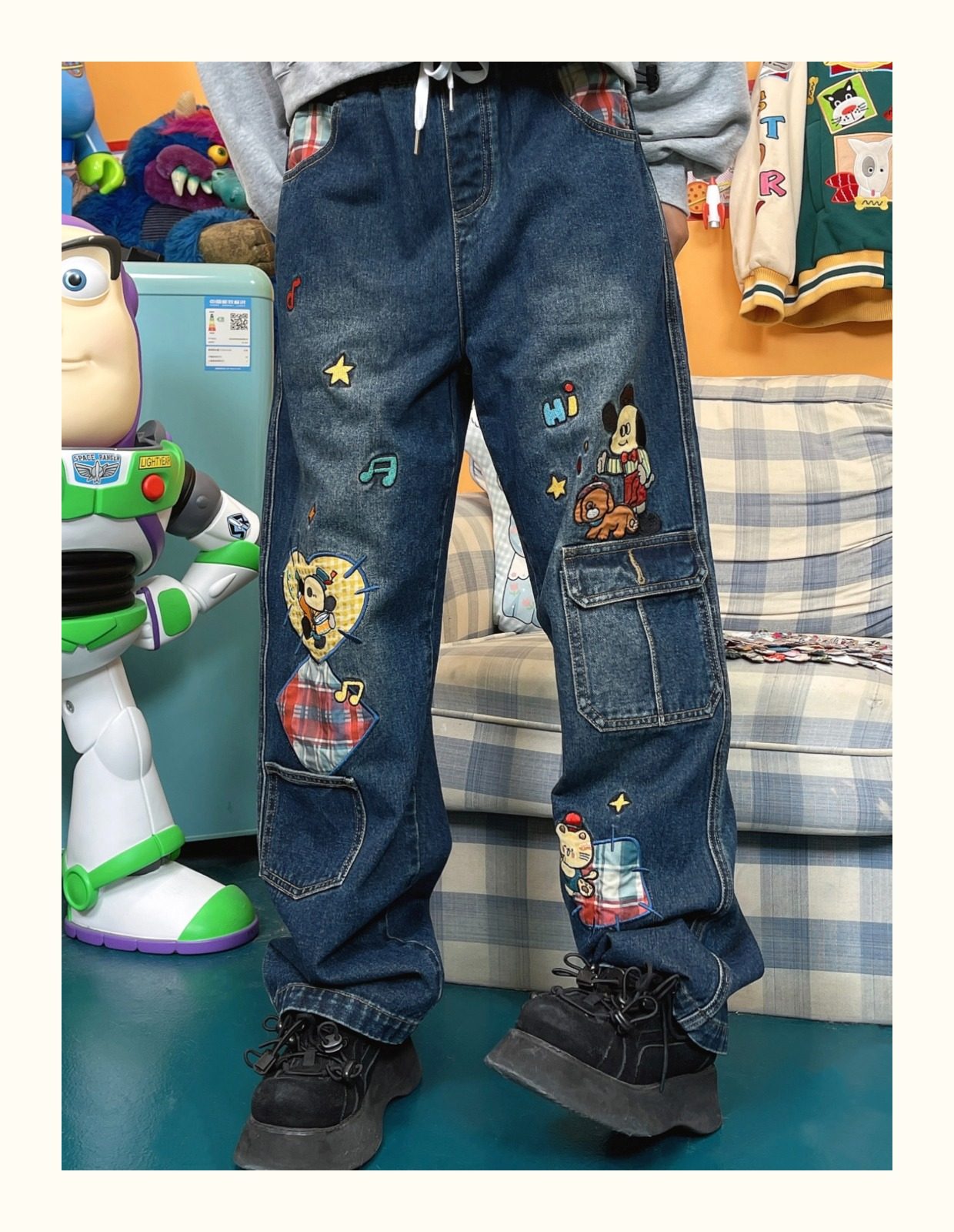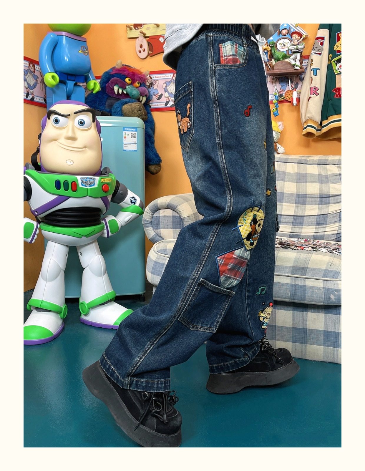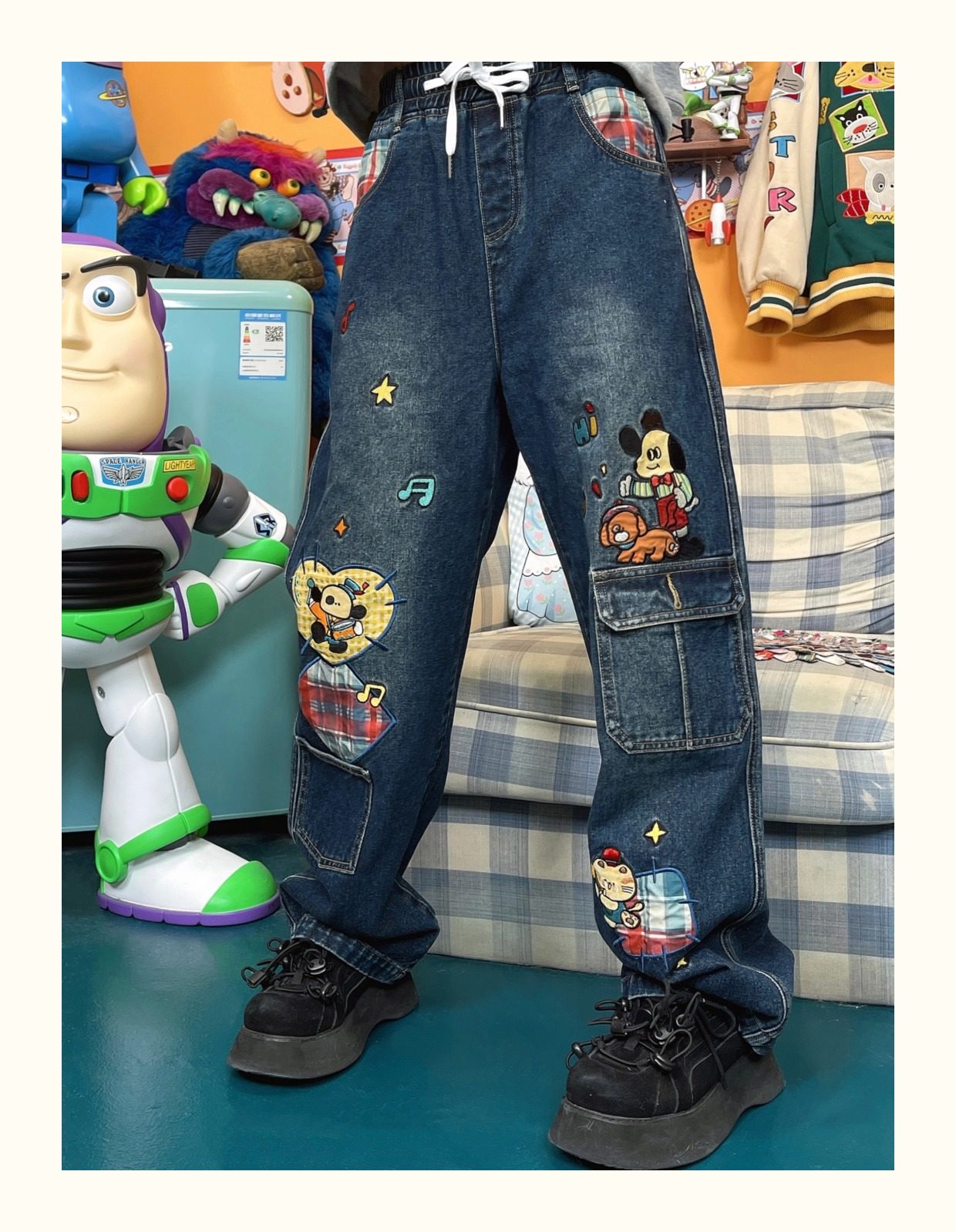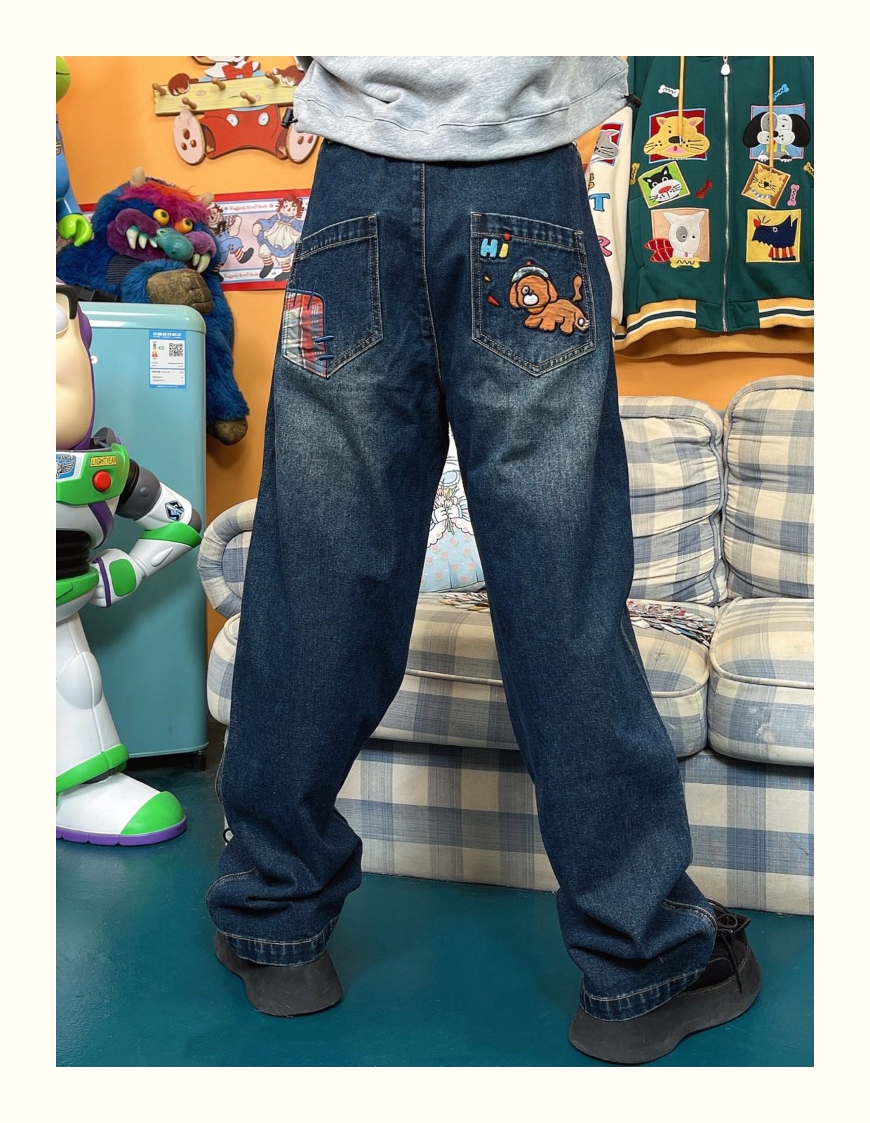 小眾重工水洗童趣復古拼接布貼繡寬鬆牛仔褲高腰深色長褲2023年春