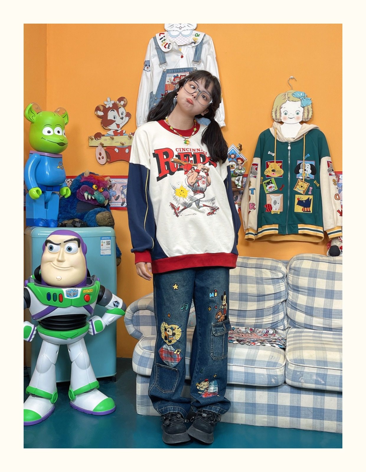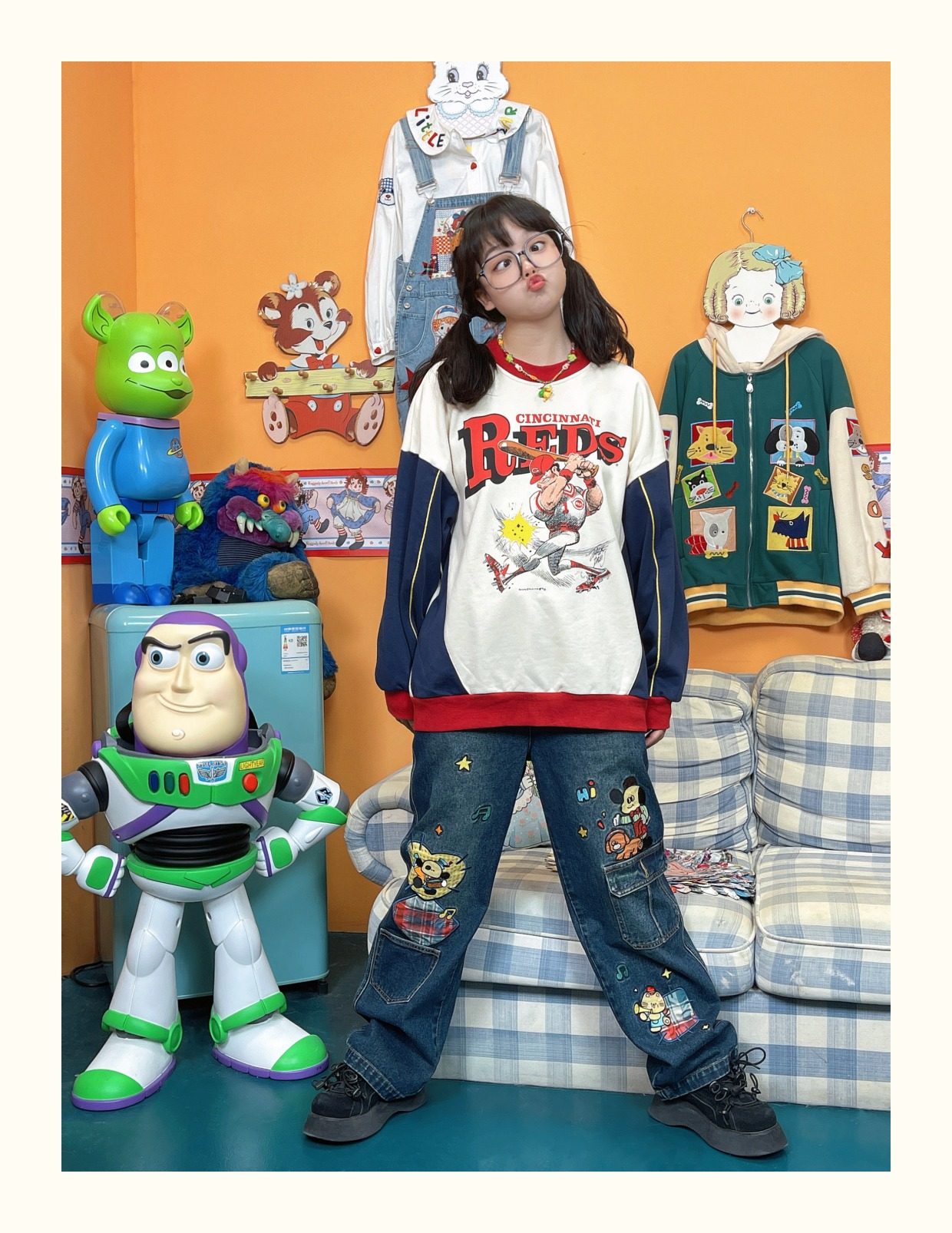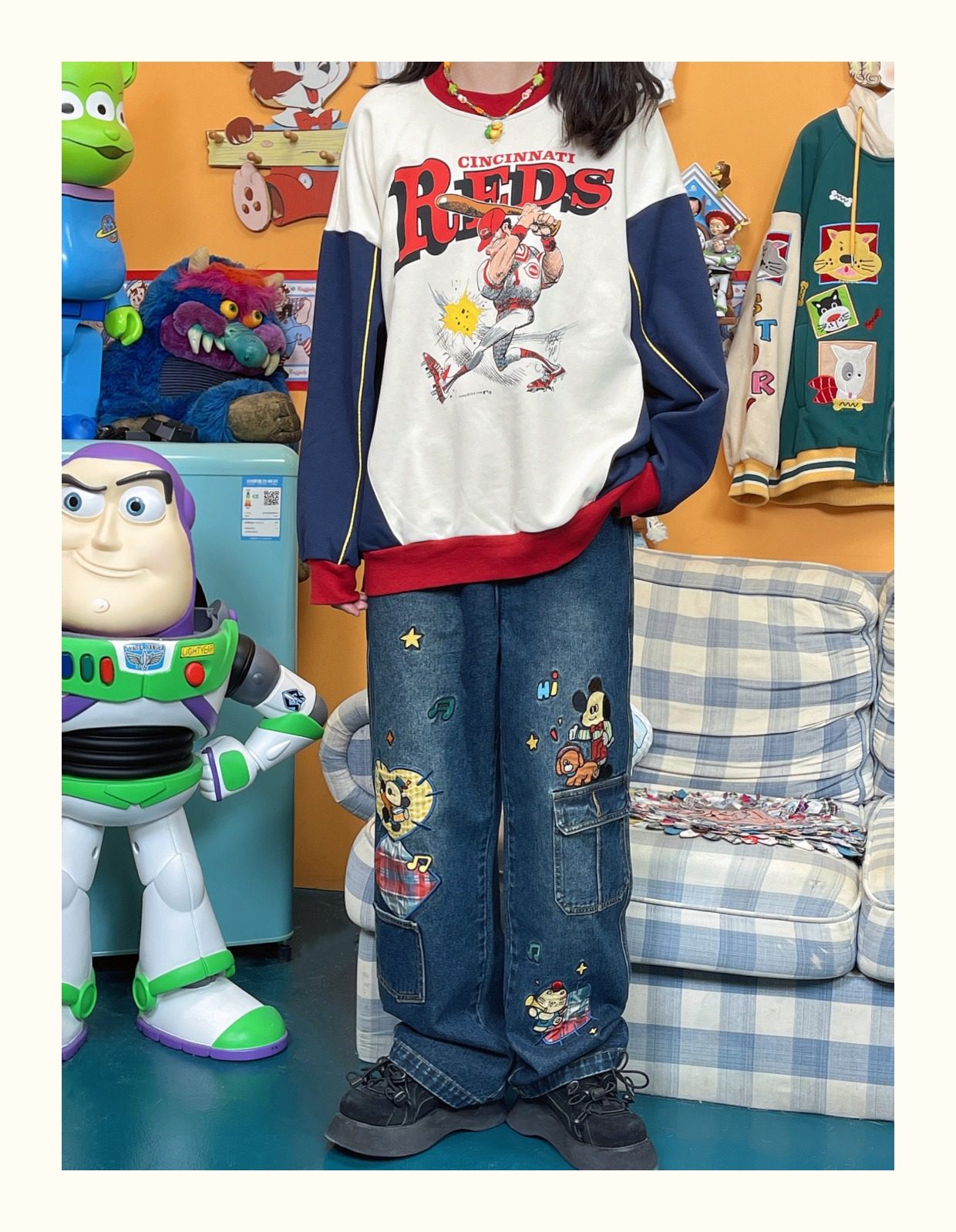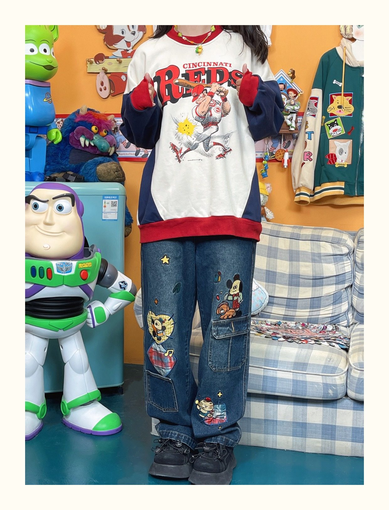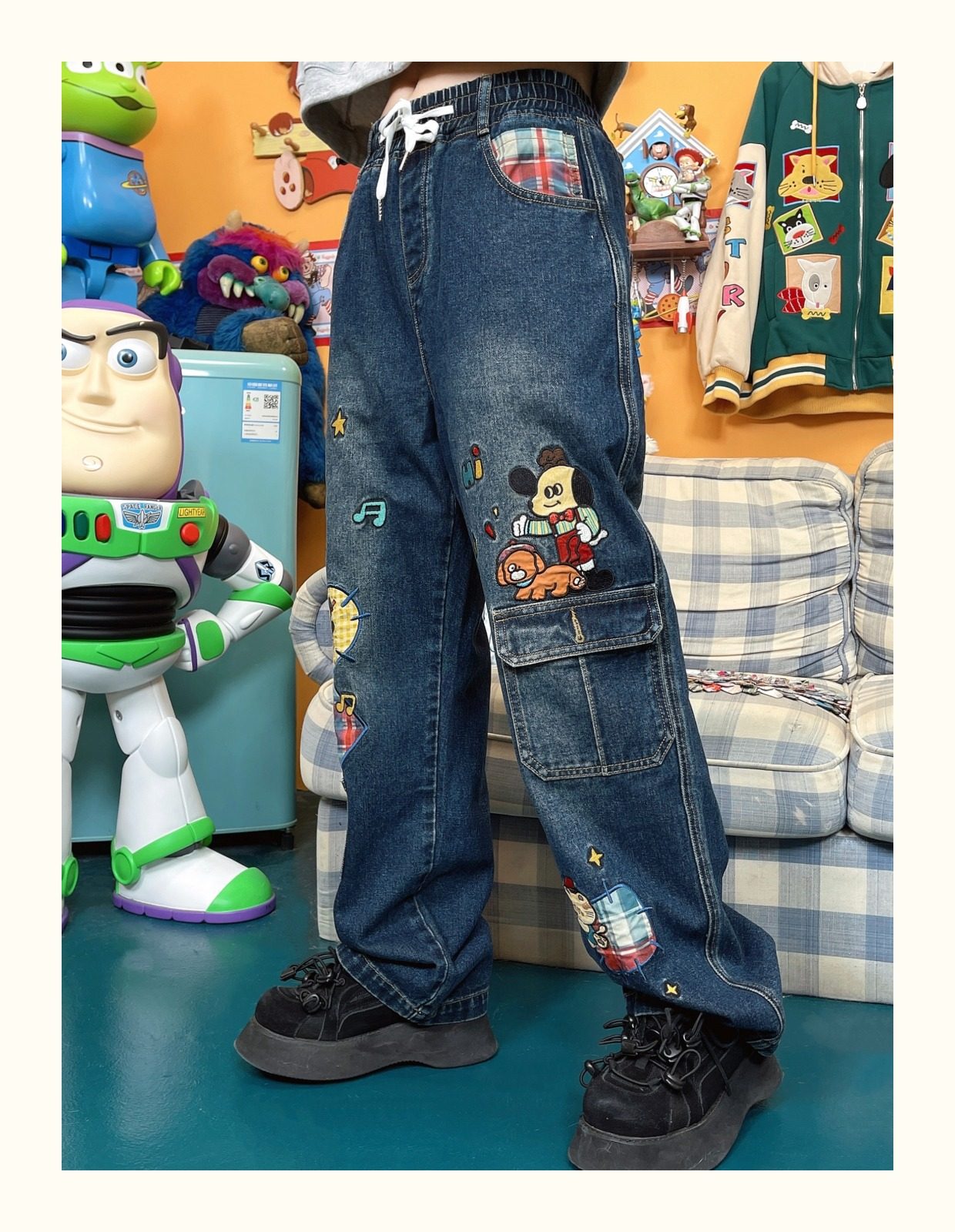 小眾重工水洗童趣復古拼接布貼繡寬鬆牛仔褲高腰深色長褲2023年春