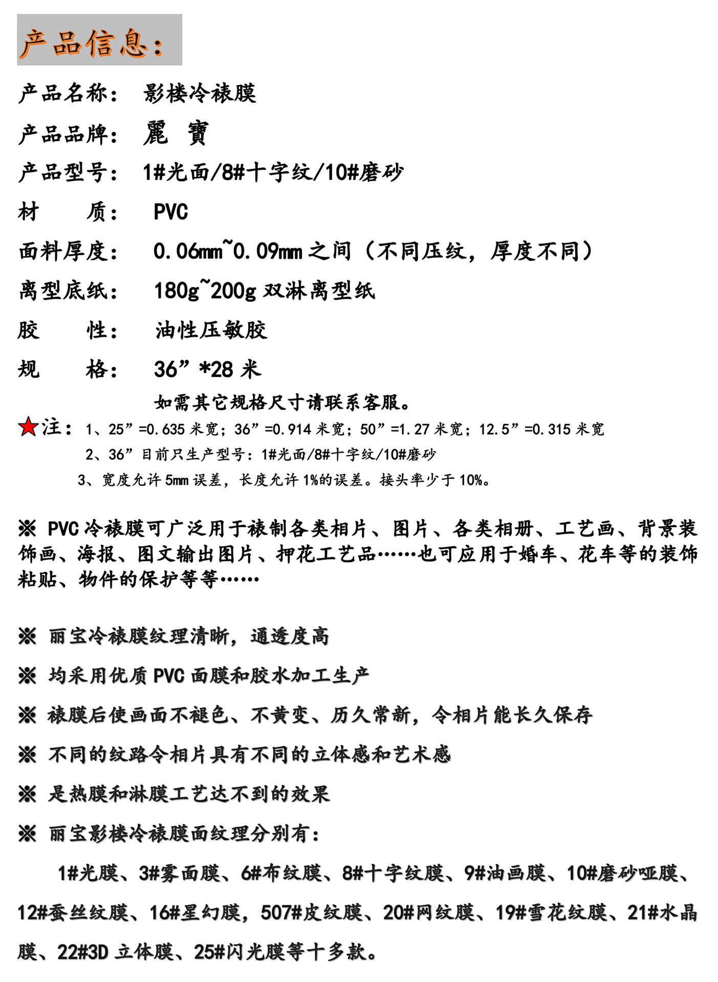 型号 36寸1#光膜,36寸8#十字膜,36寸10#磨砂