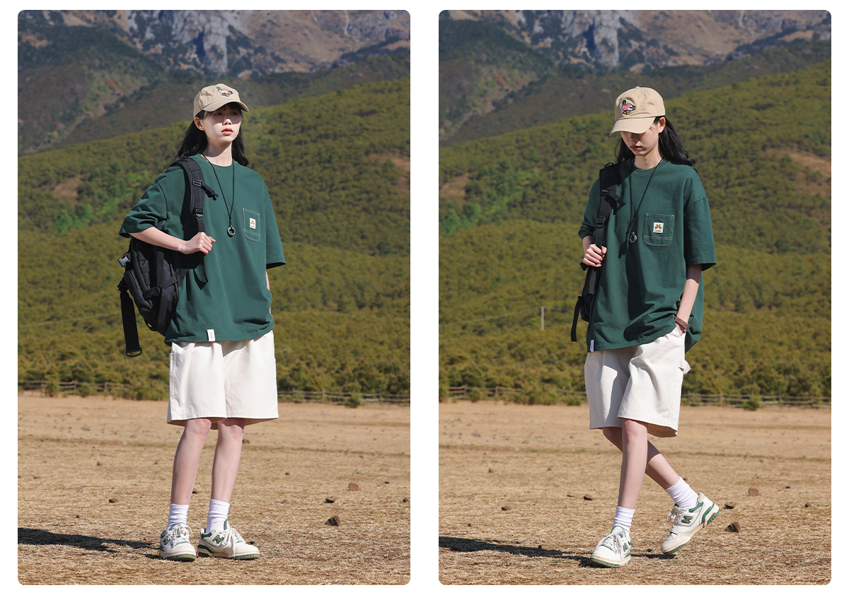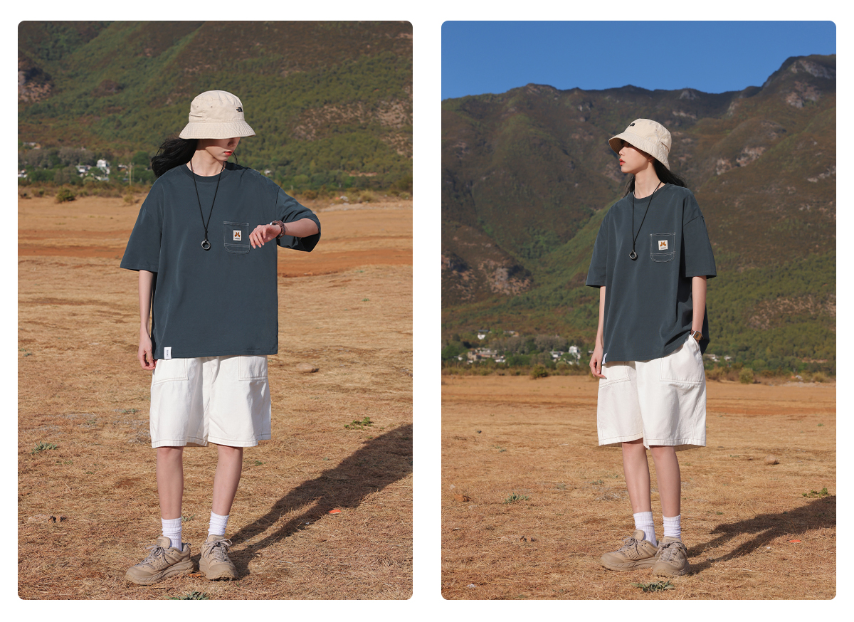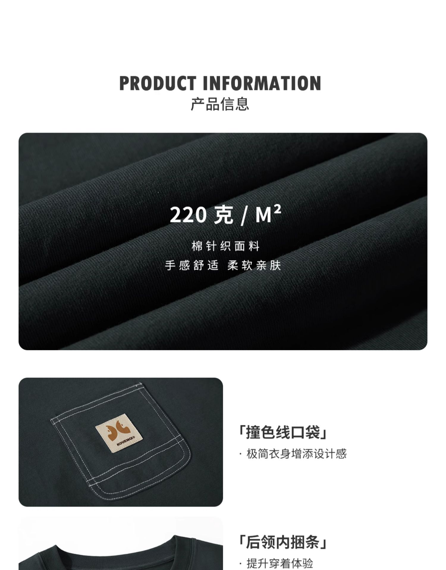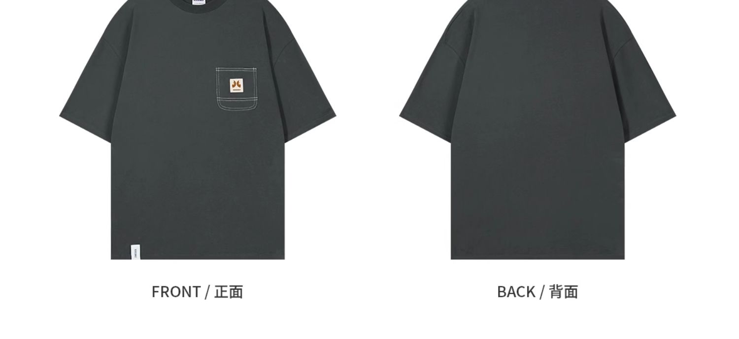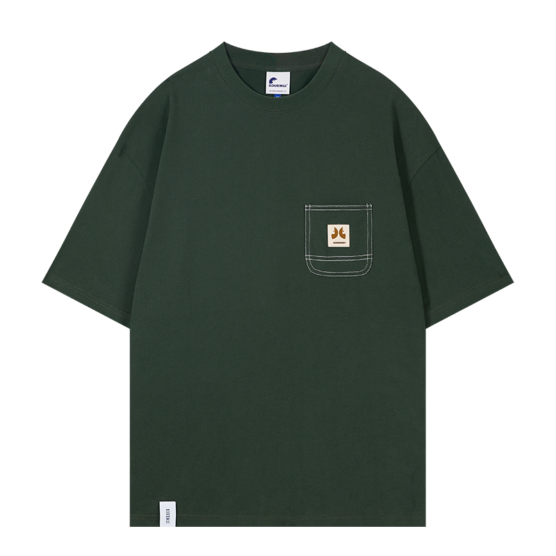 KOUEMGI空味 夏季T恤寬鬆毛面感圓領撞色線口袋織帶短袖T恤男女