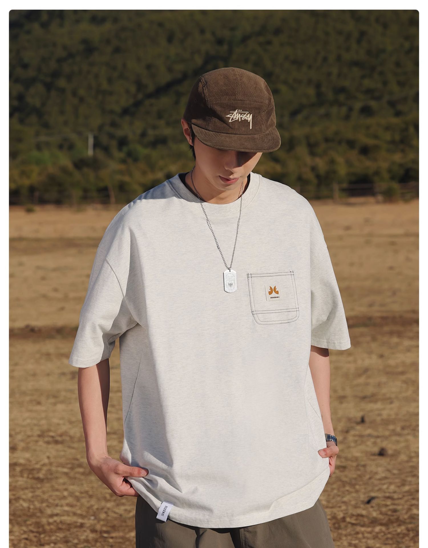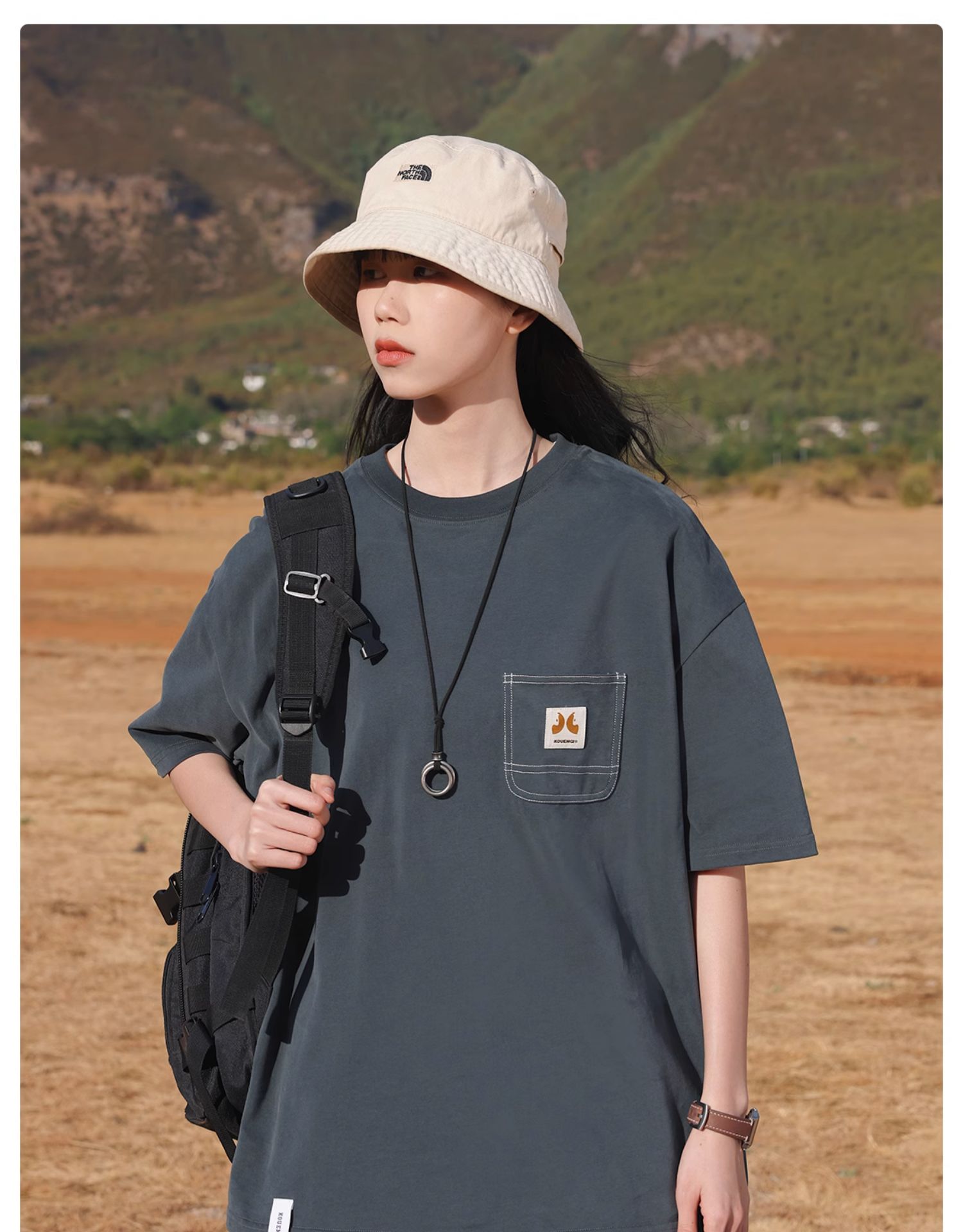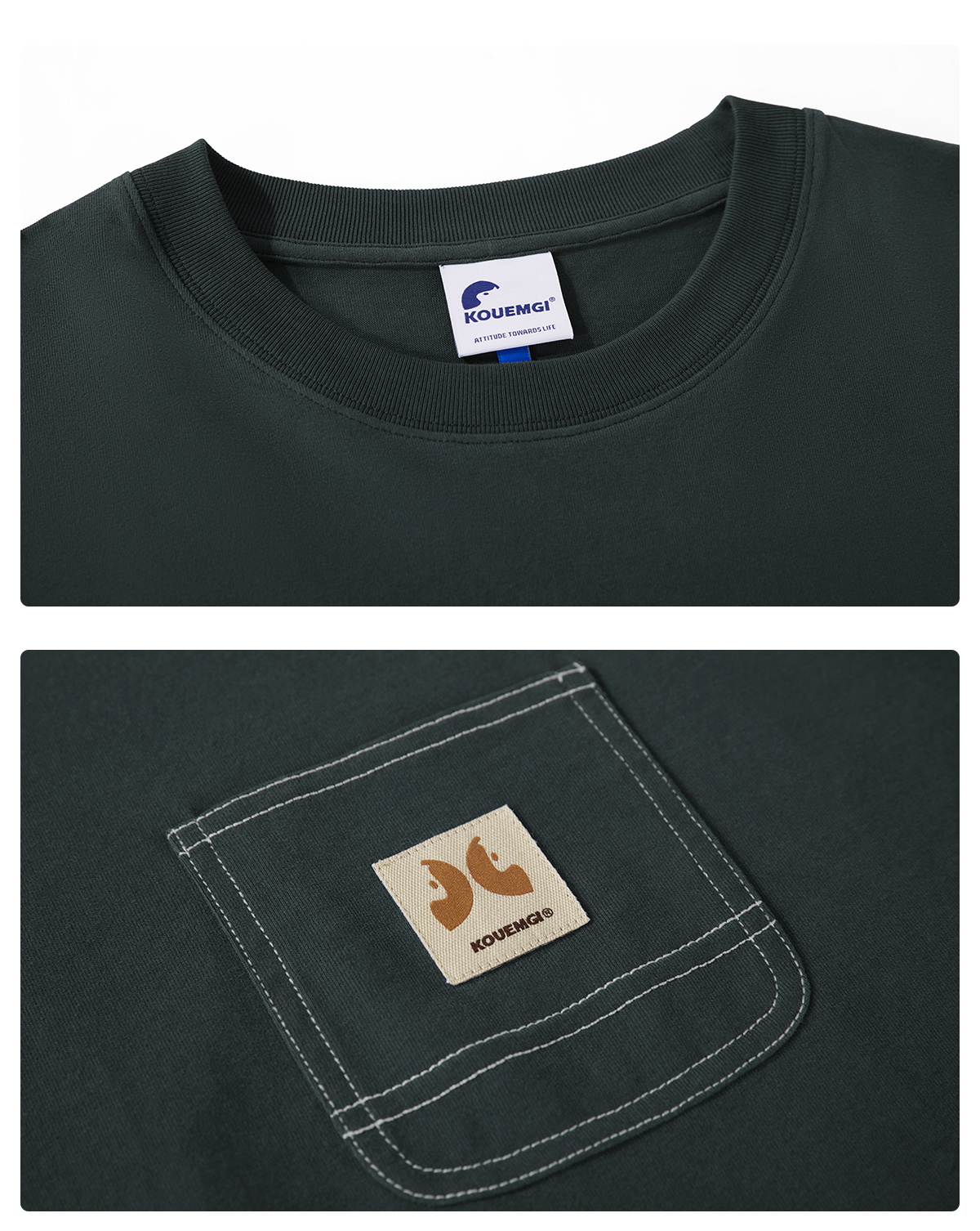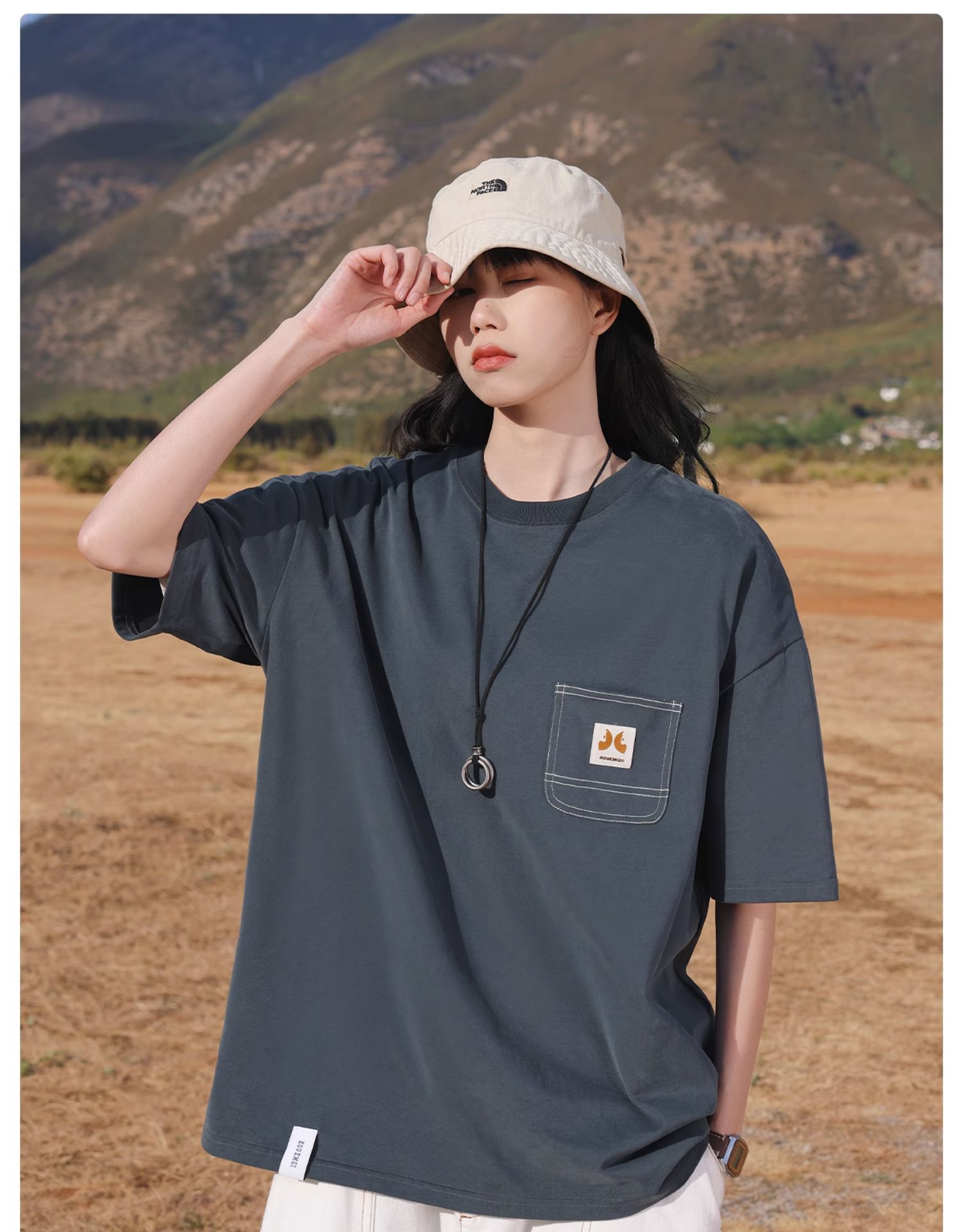 KOUEMGI空味 夏季T恤寬鬆毛面感圓領撞色線口袋織帶短袖T恤男女