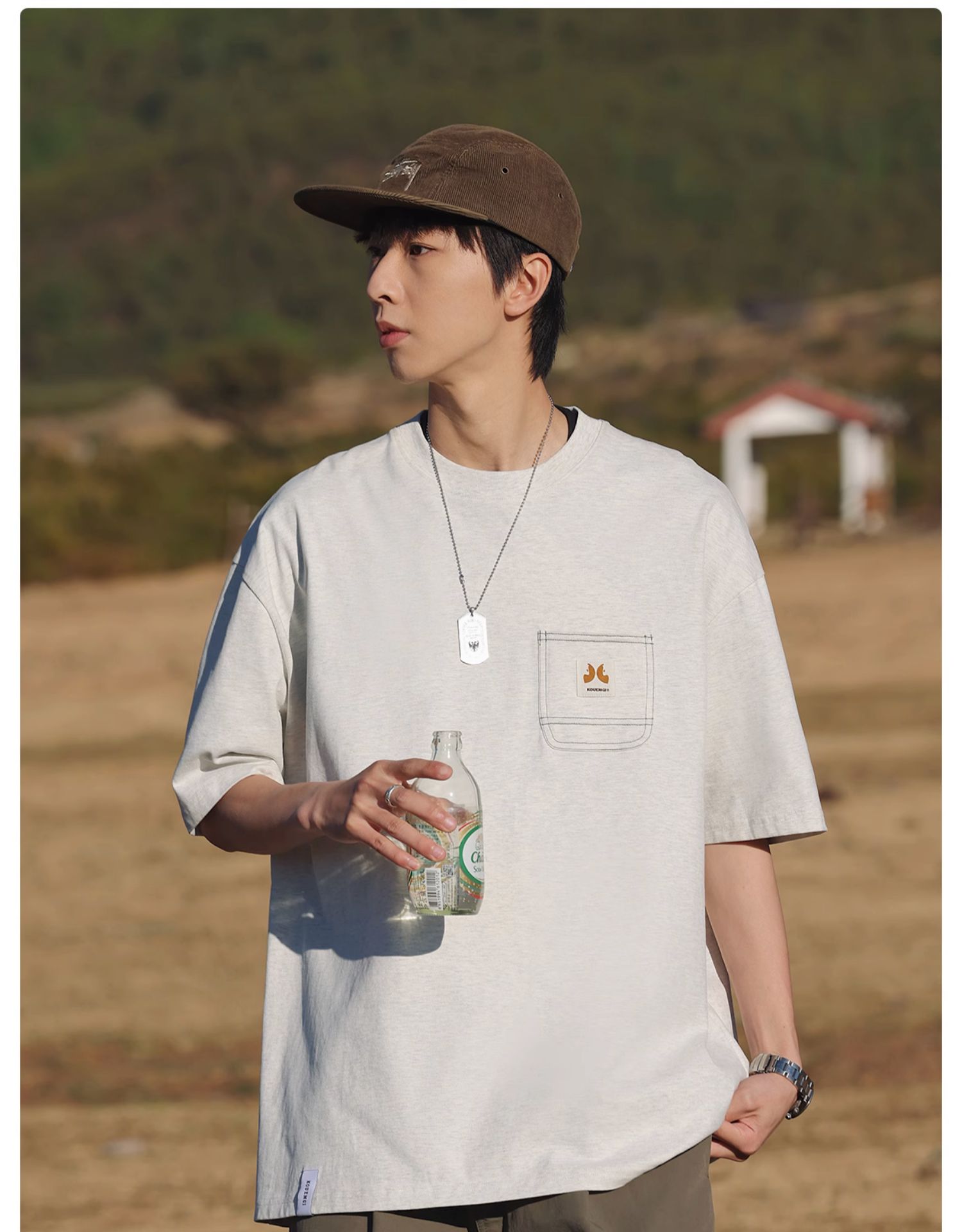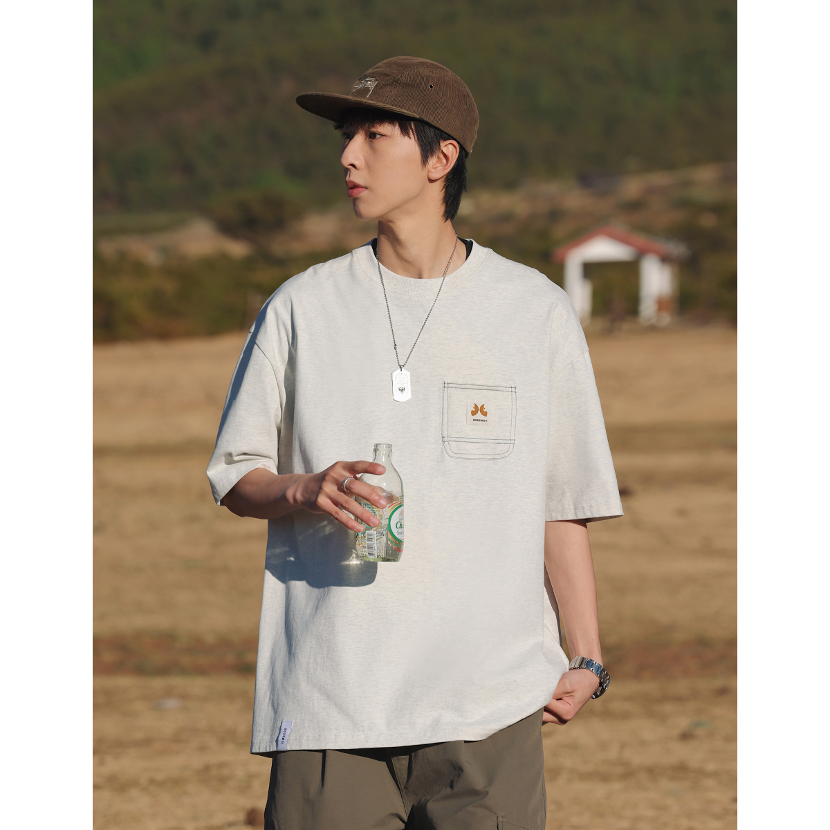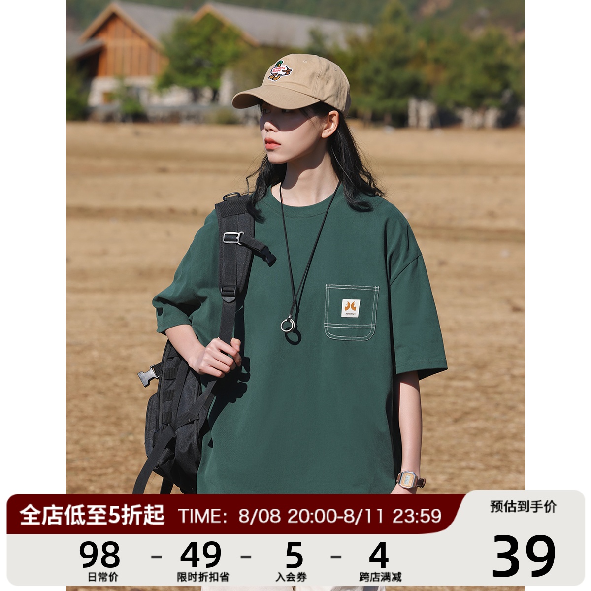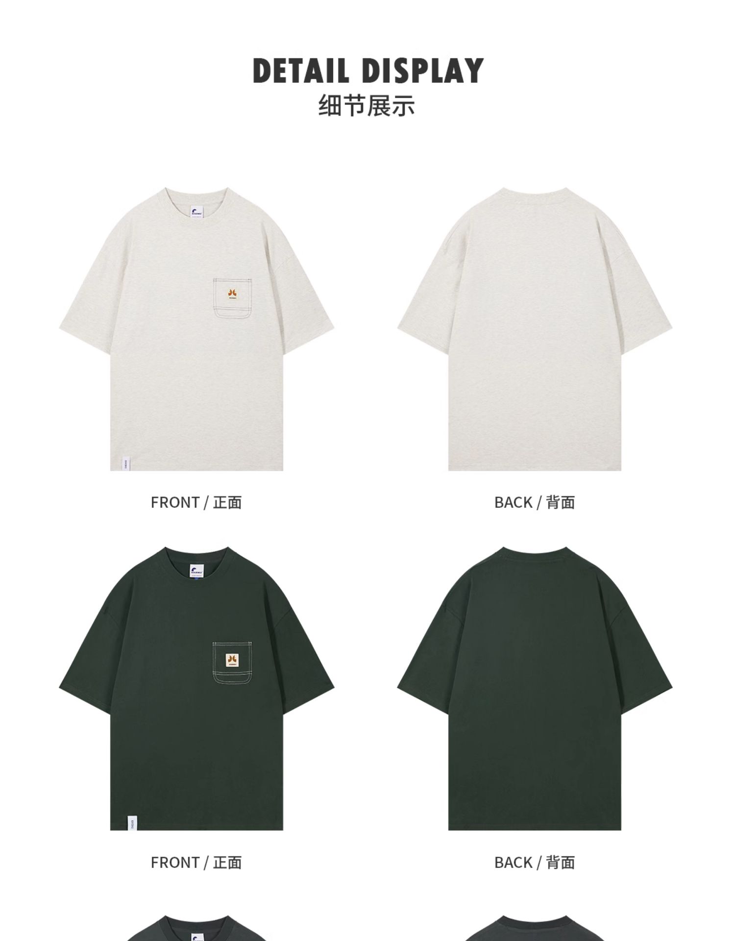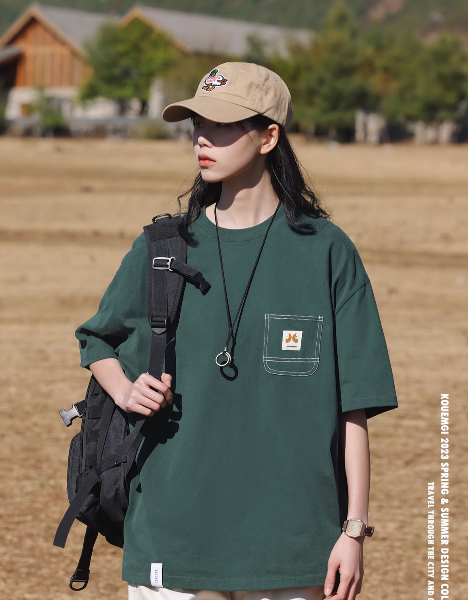 KOUEMGI空味 夏季T恤寬鬆毛面感圓領撞色線口袋織帶短袖T恤男女
