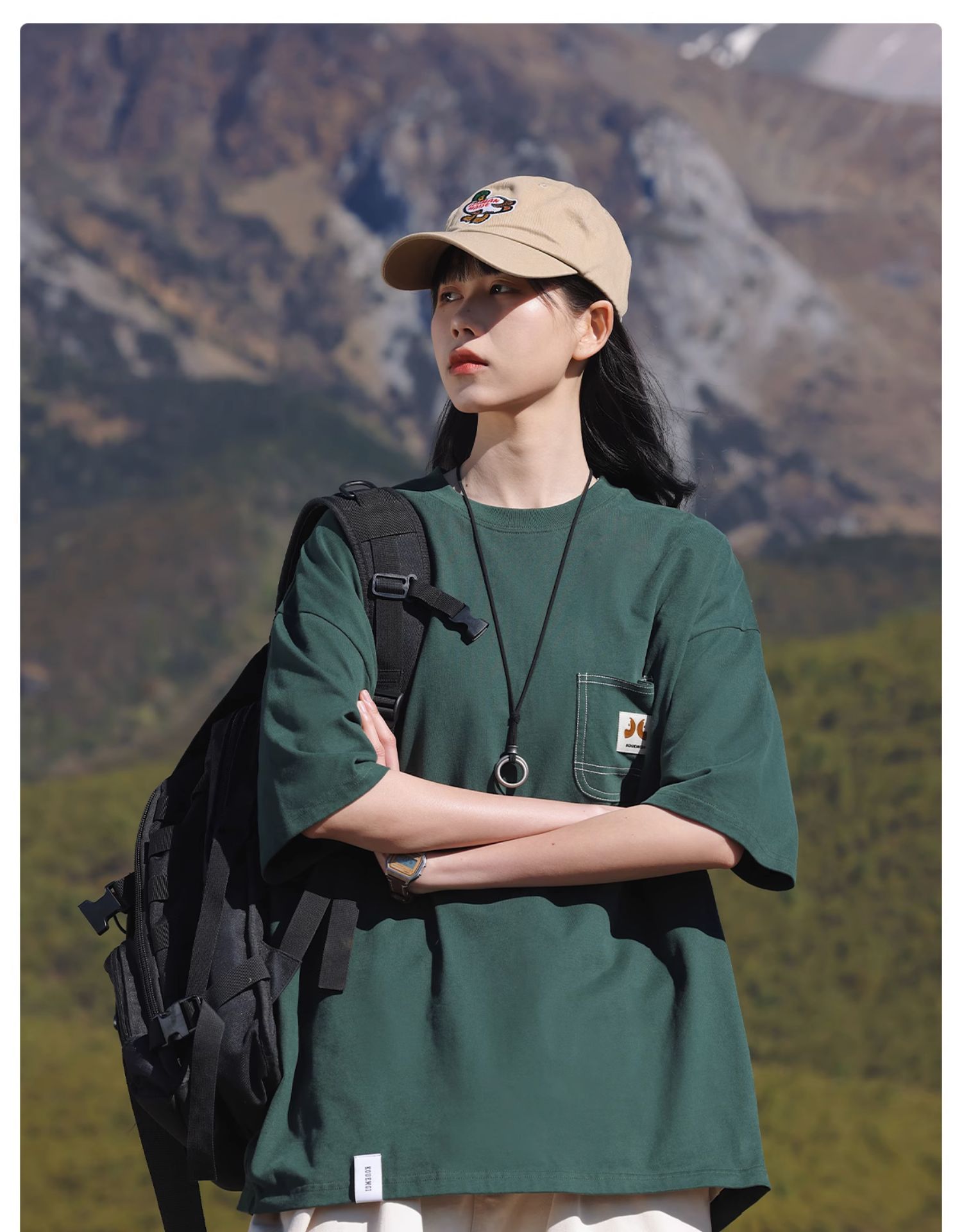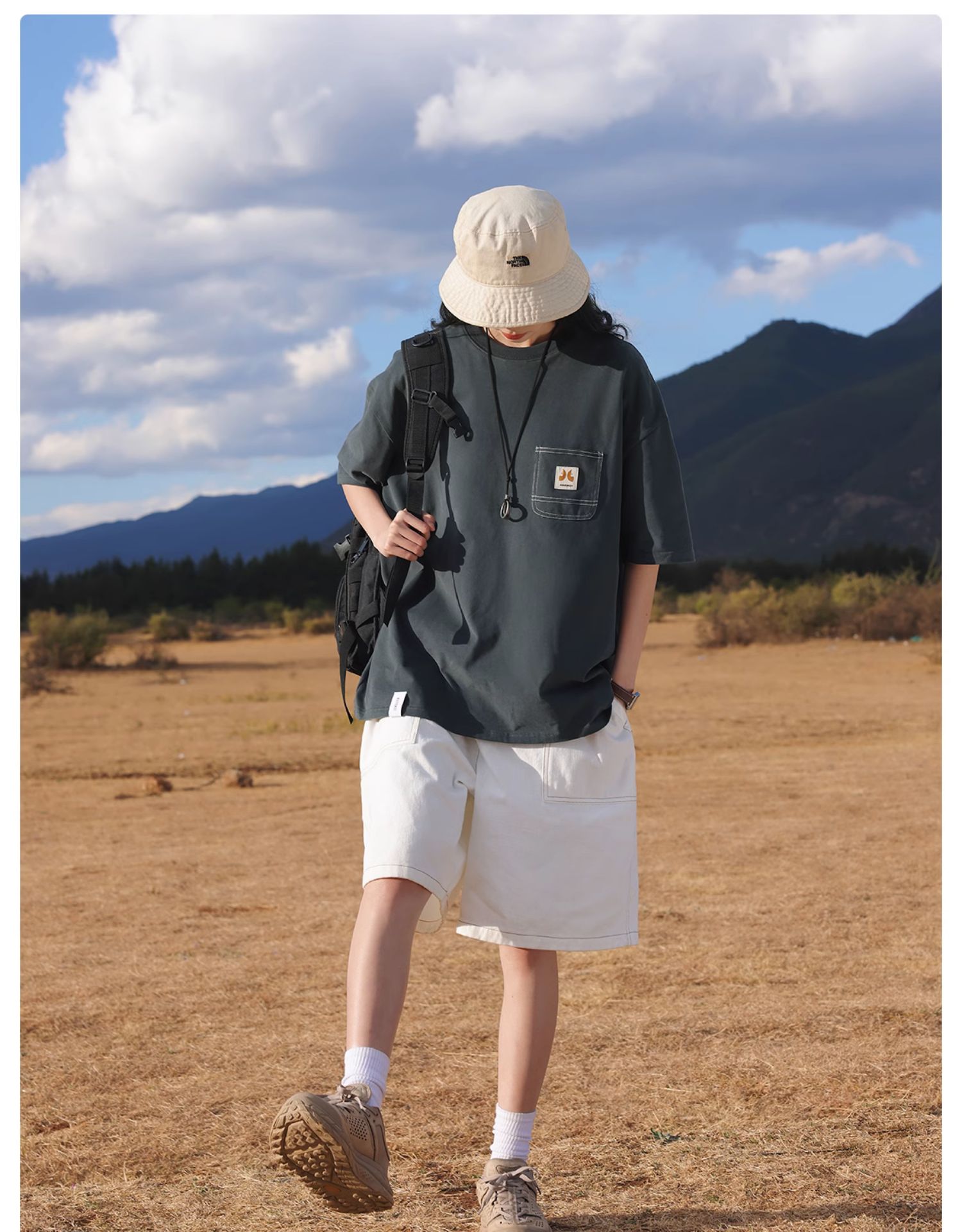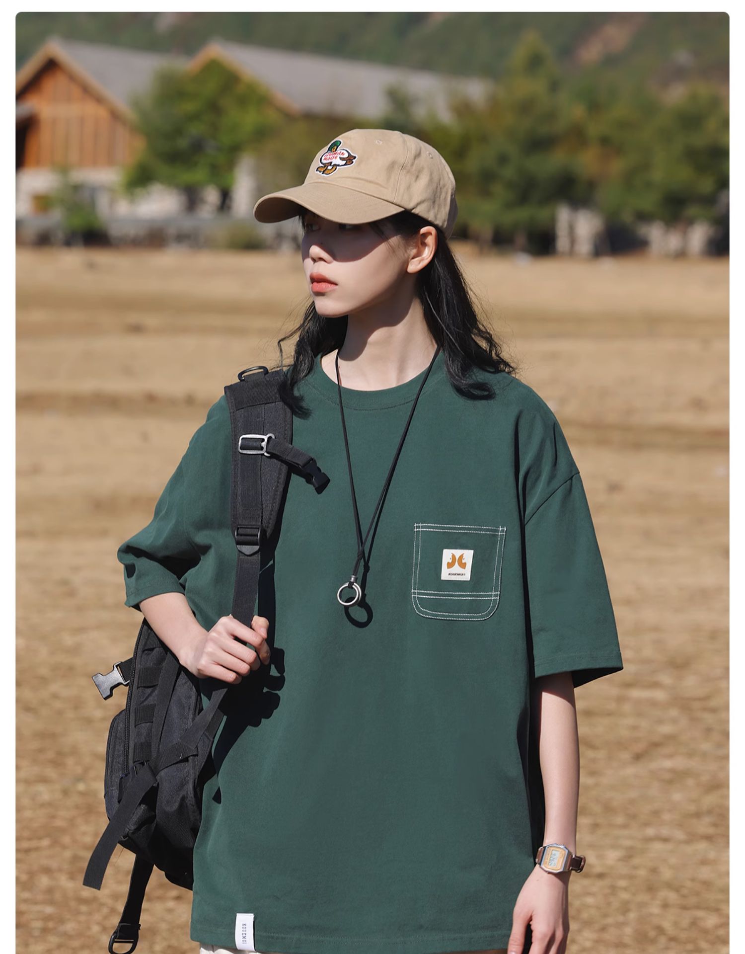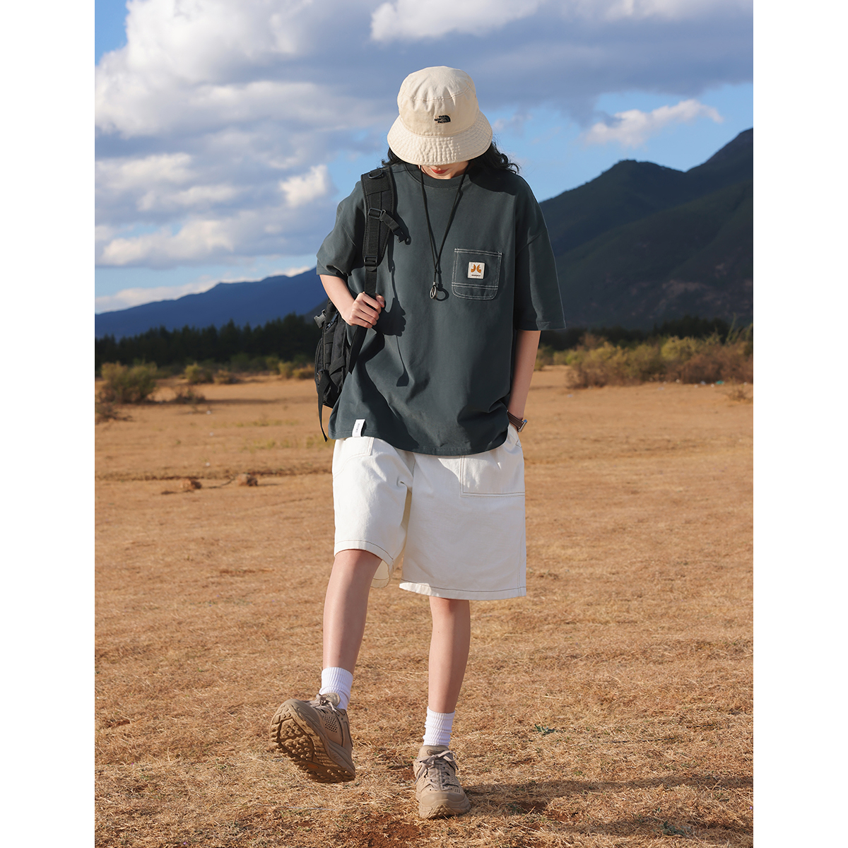 KOUEMGI空味 夏季T恤寬鬆毛面感圓領撞色線口袋織帶短袖T恤男女