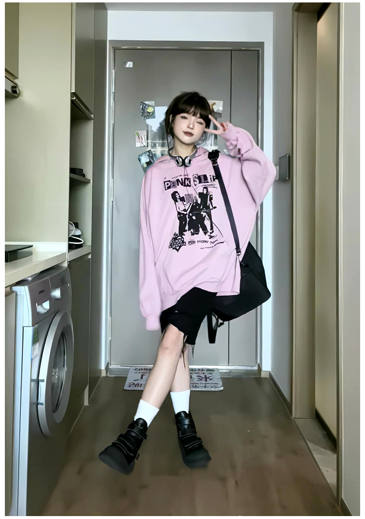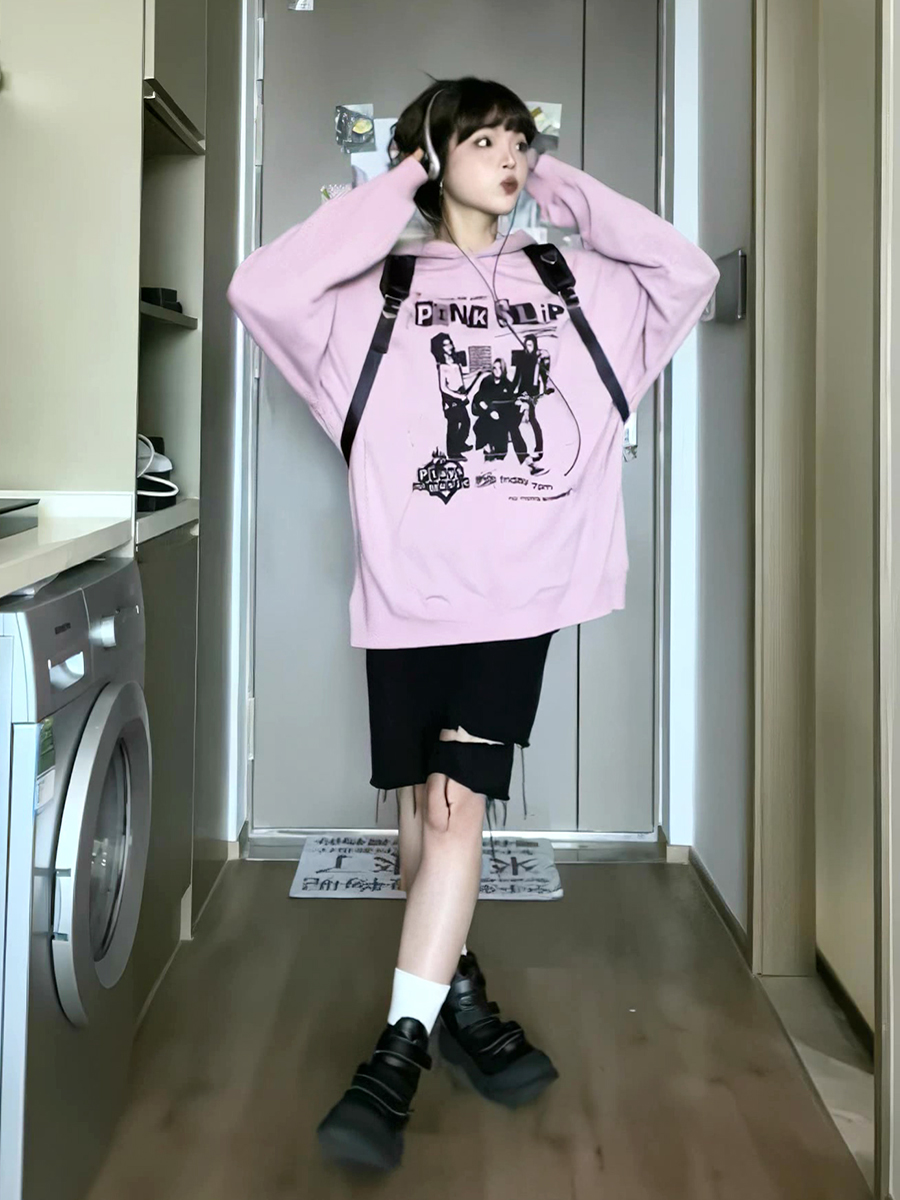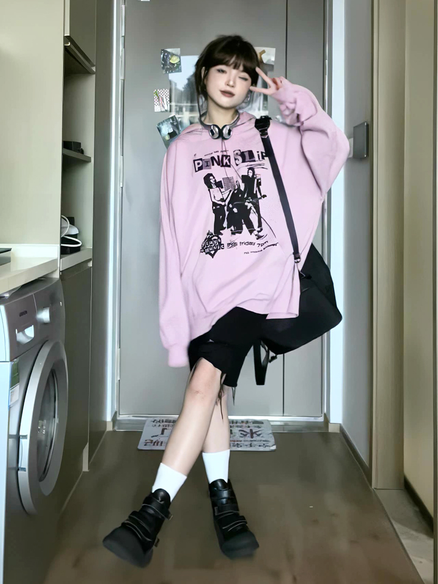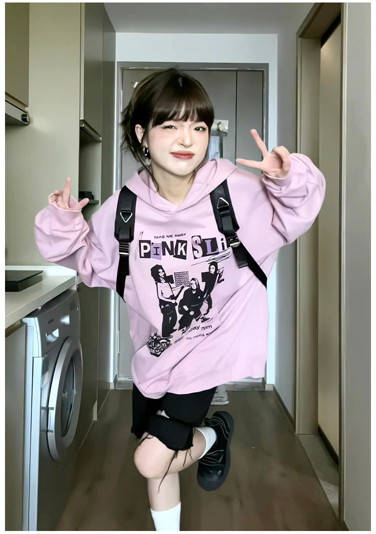 美式印花粉色連帽運動衫女2023秋季新款復古chic長袖寬鬆慵懶風上衣