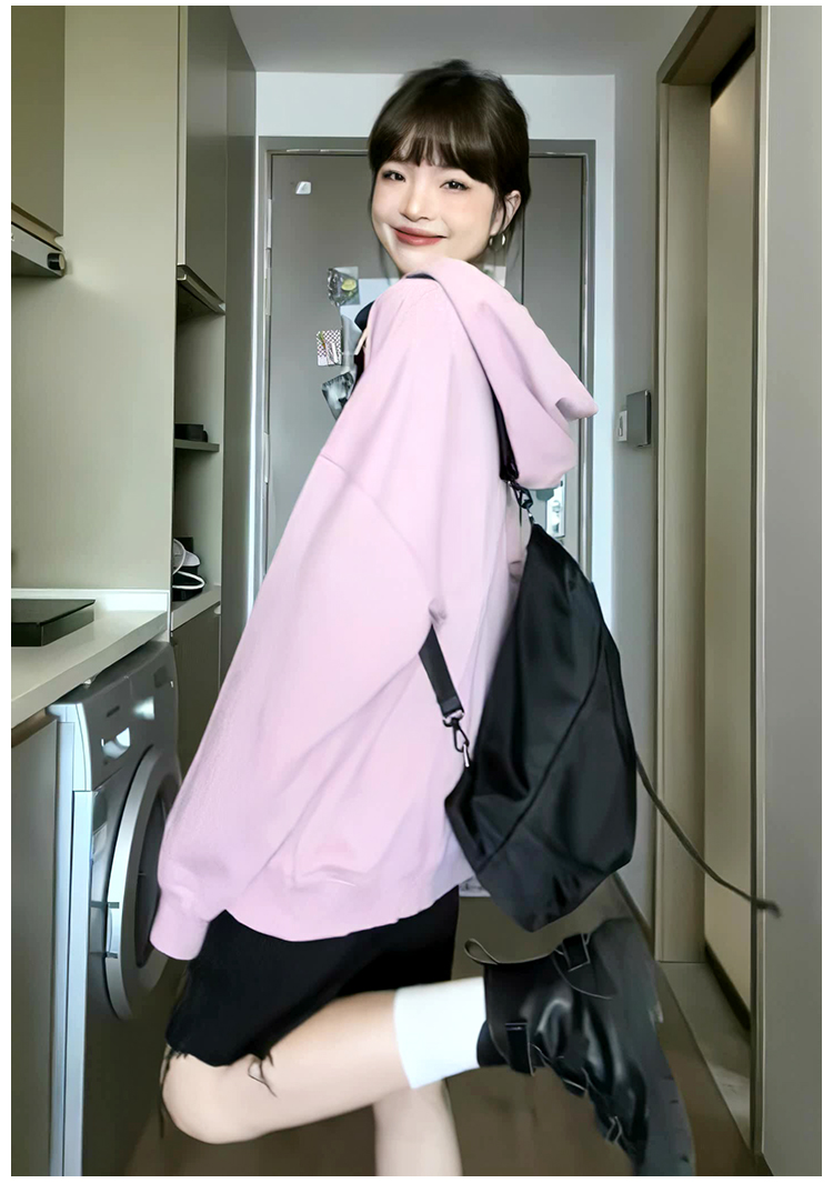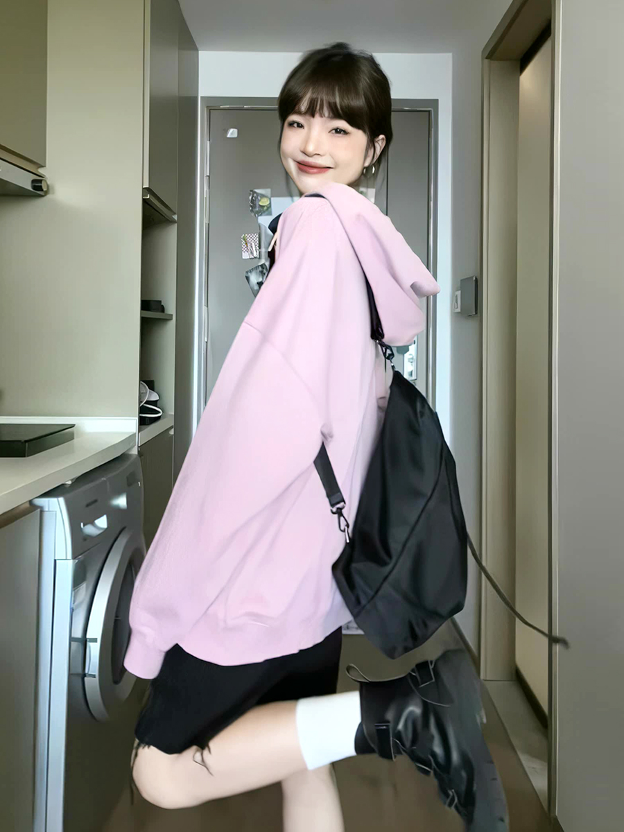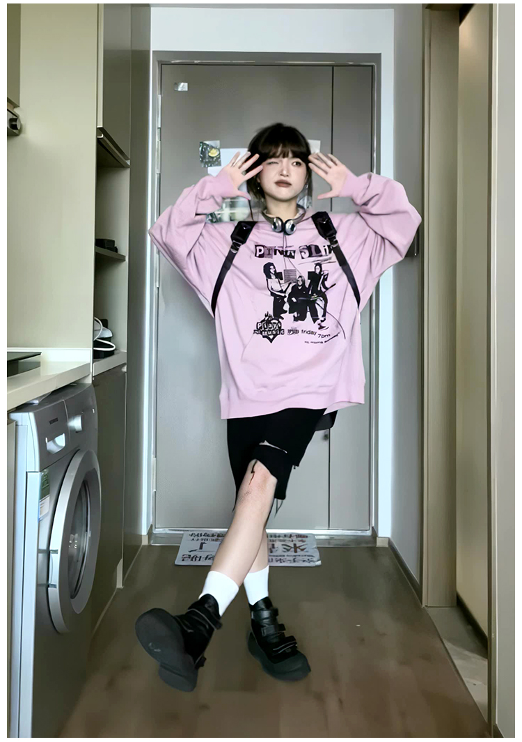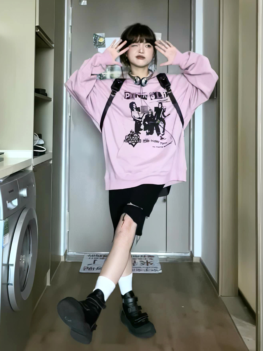 美式印花粉色連帽運動衫女2023秋季新款復古chic長袖寬鬆慵懶風上衣