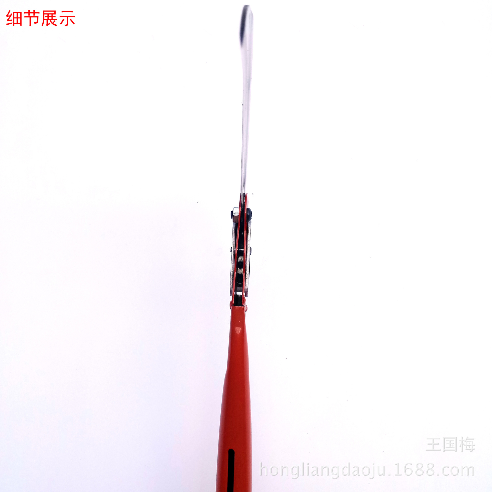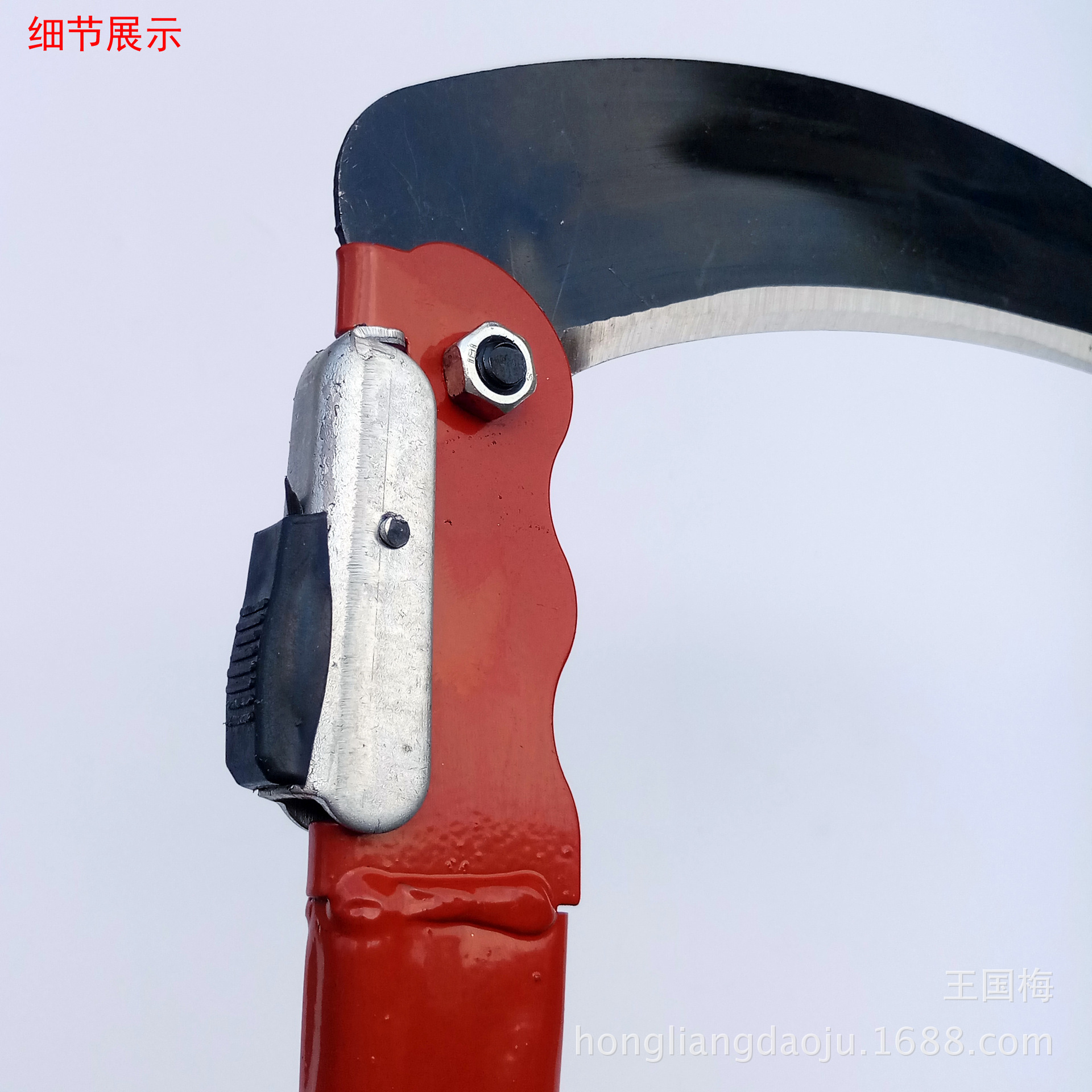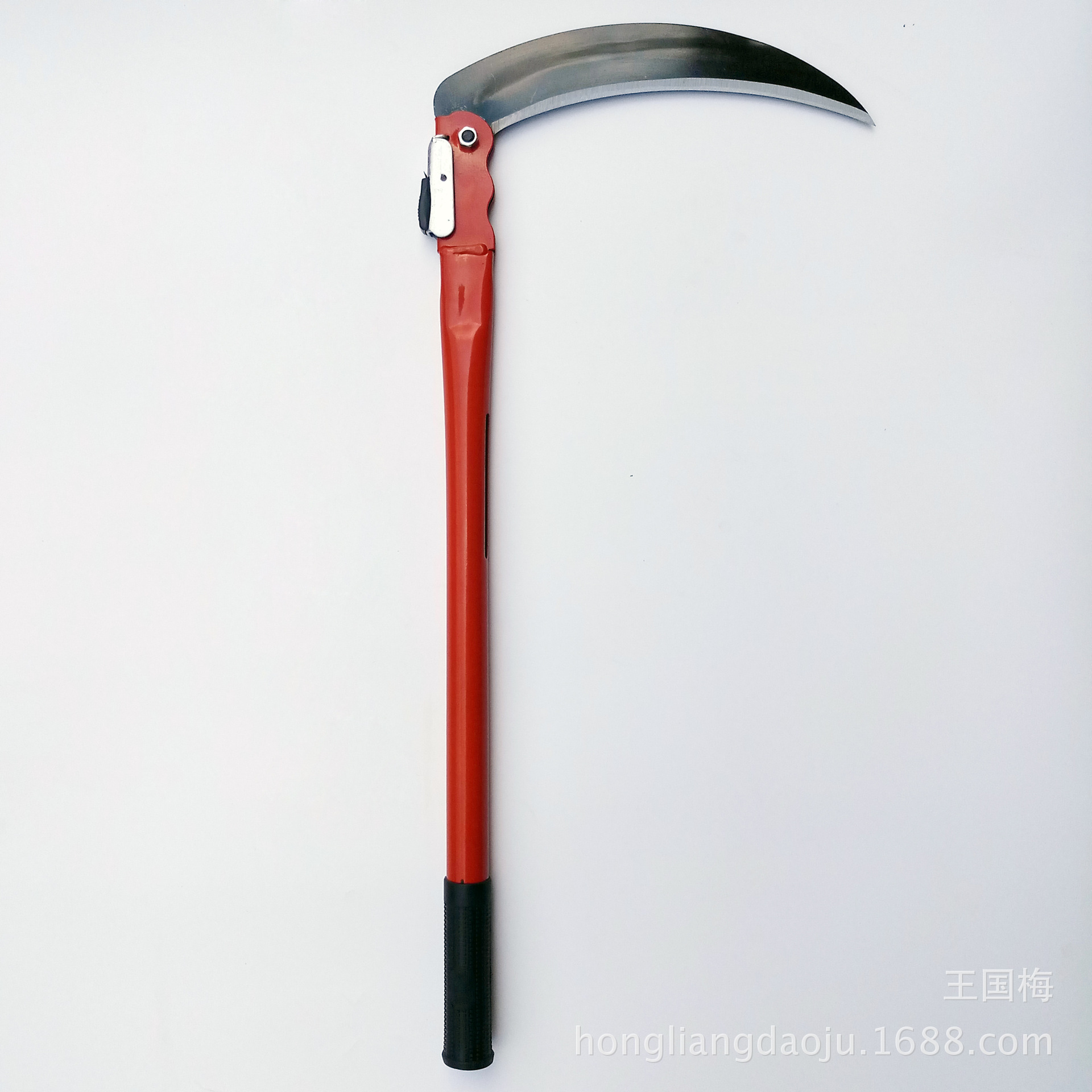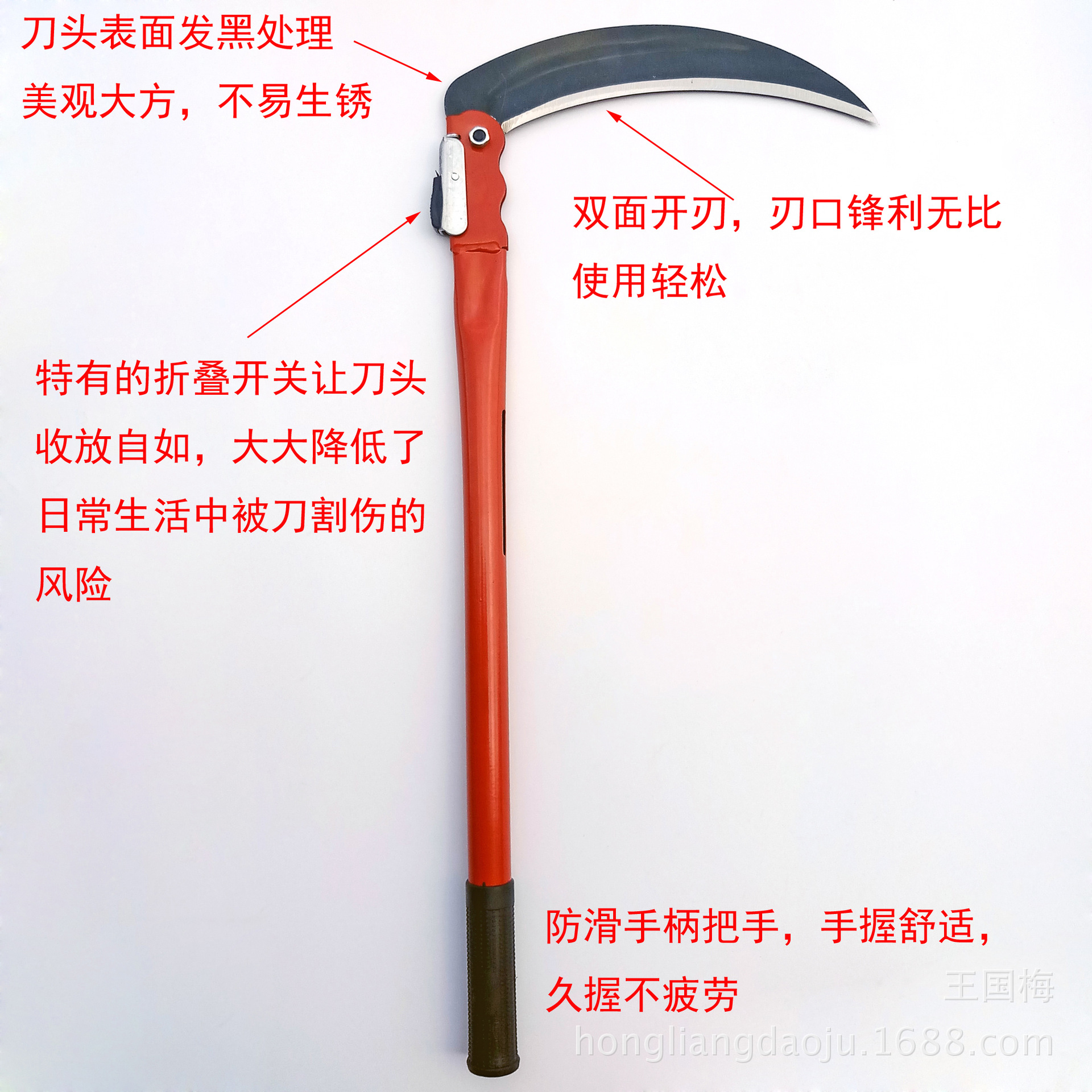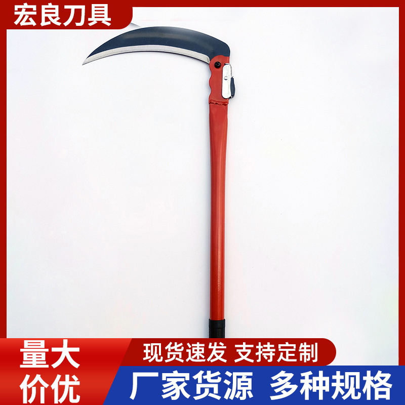 本厂生产的折叠镰刀系列,刀头采用优良65号锰钢经冲压,高频淬火,热油回火,等几道工序制作而成,刀口硬度可达HRC56-58度,刀口锋利好用,能刮掉汗毛,刀柄采用优良铁管经切割、打磨、喷塑等几道工序制作,颜色多样、美观大方,刀头在不用的时候可以折下来,方便携带,避免误伤!