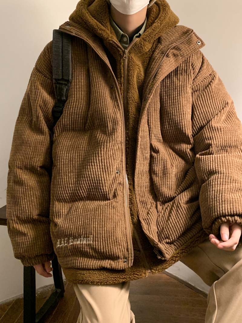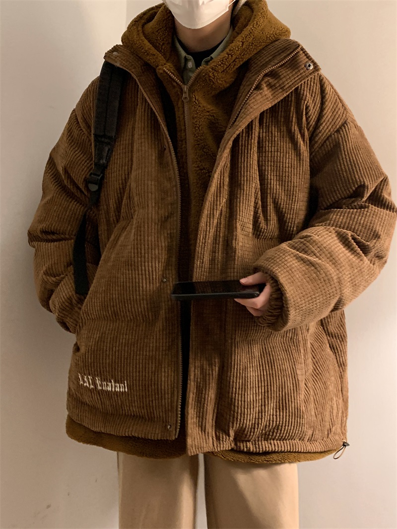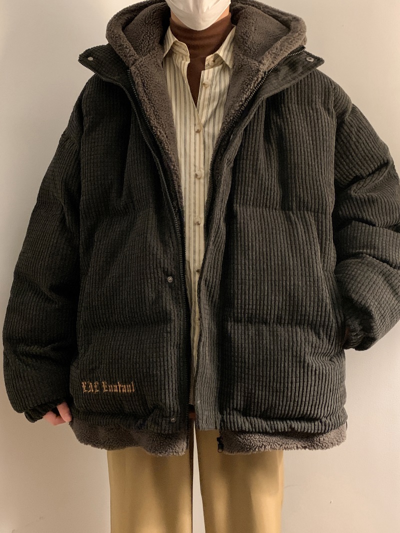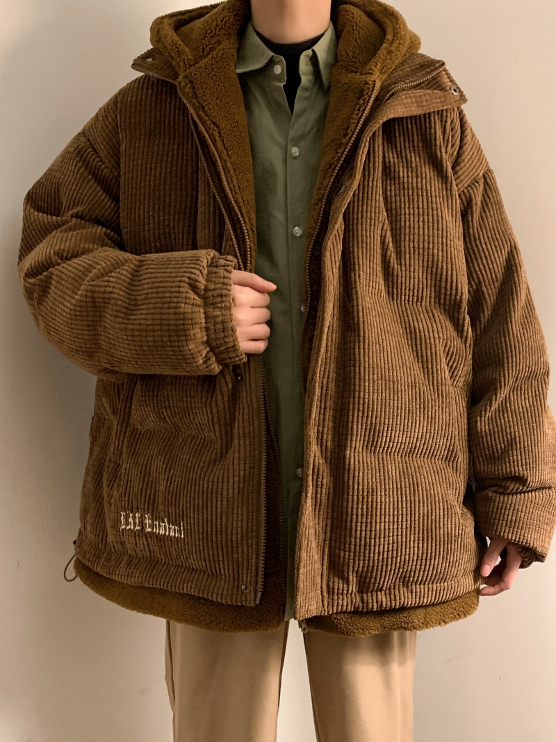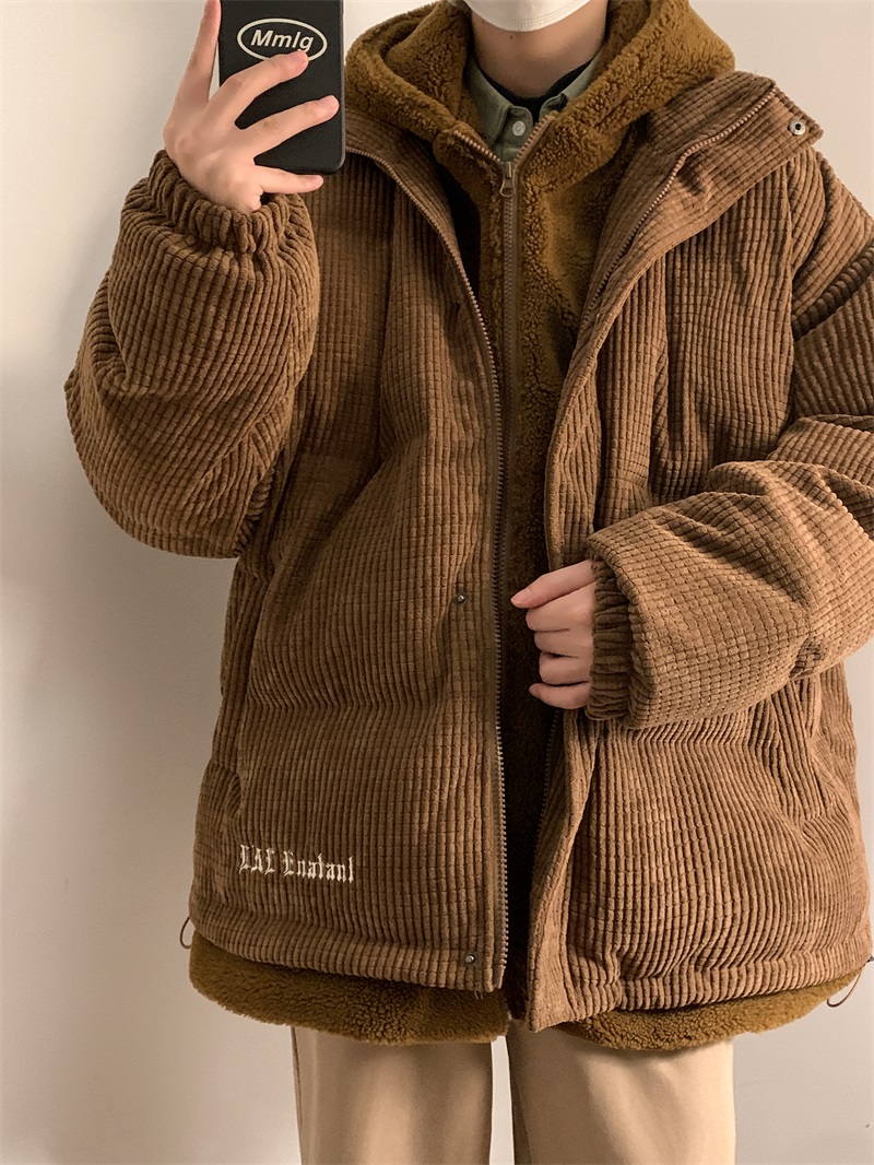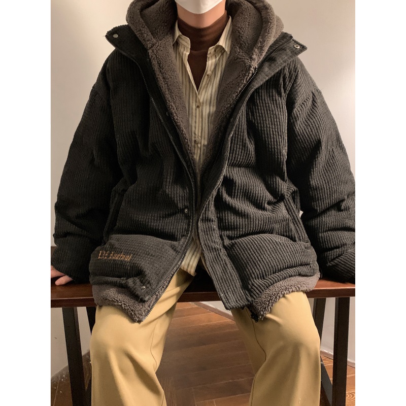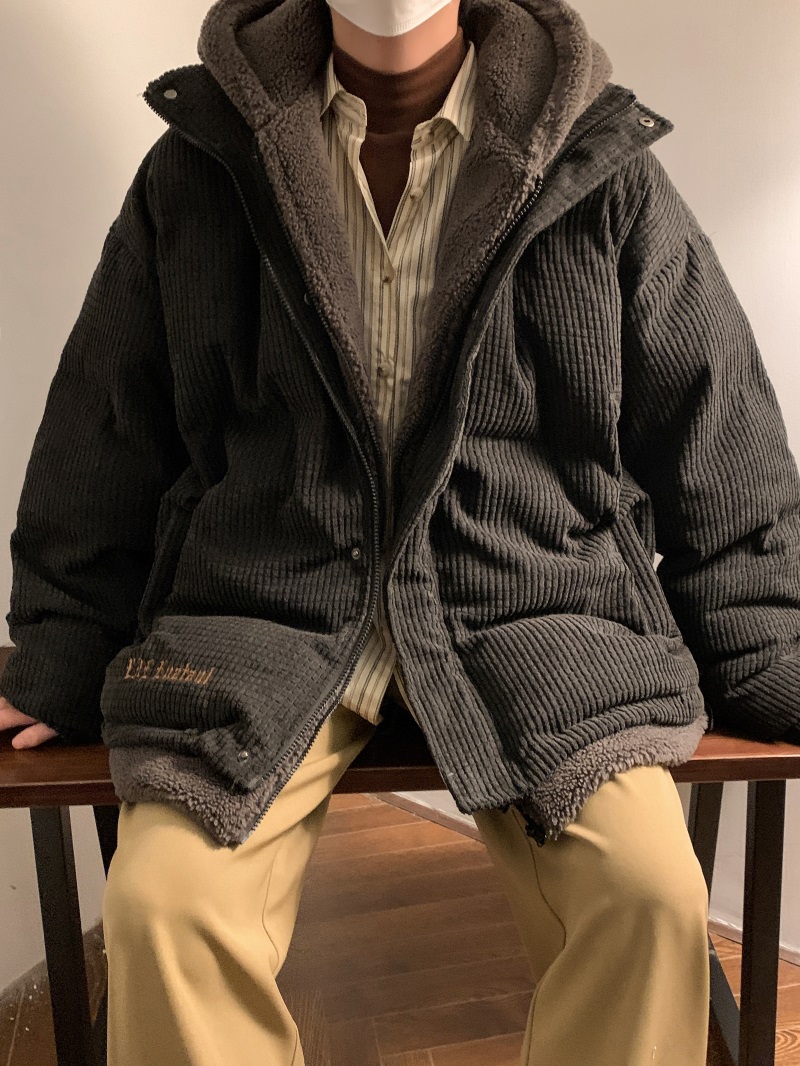 燈芯絨立領鋪棉外套夾克美式復古vintage假兩件羊羔毛連帽鋪棉外套外套ins