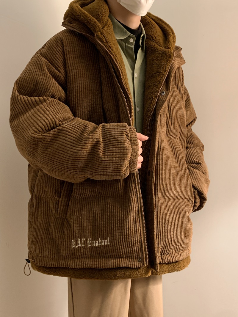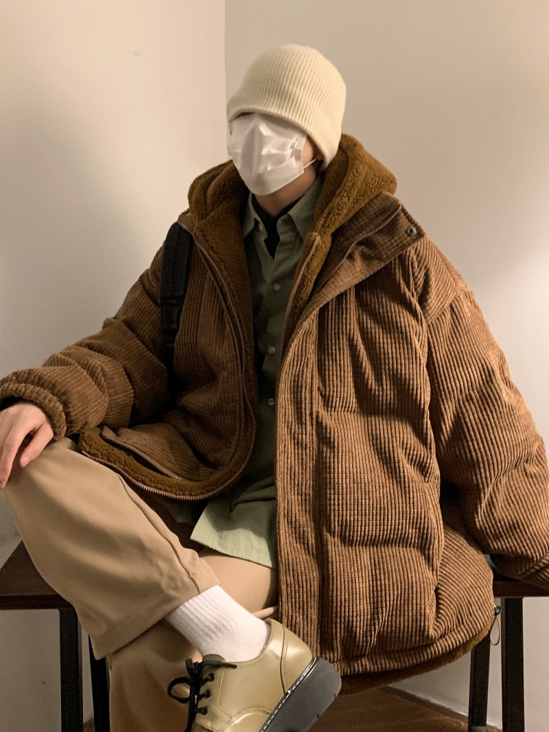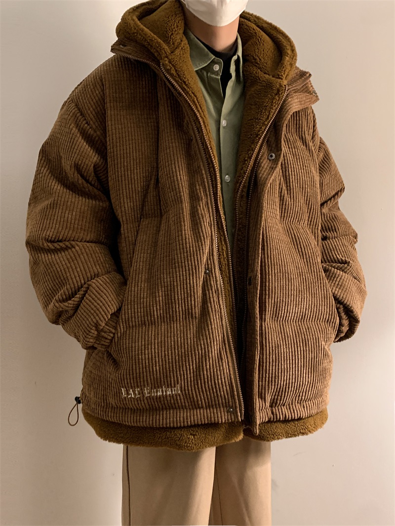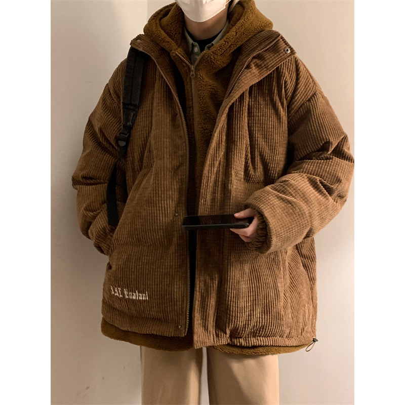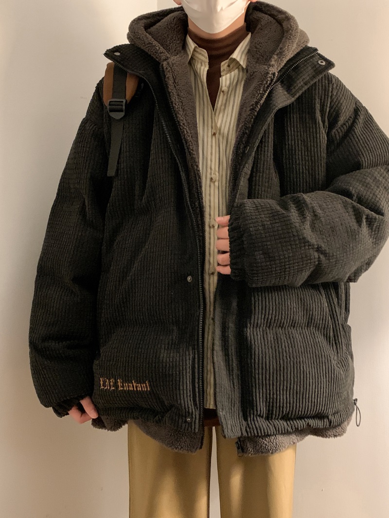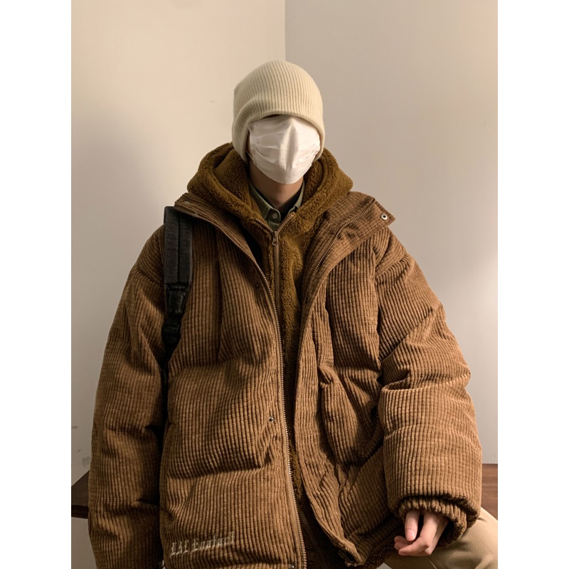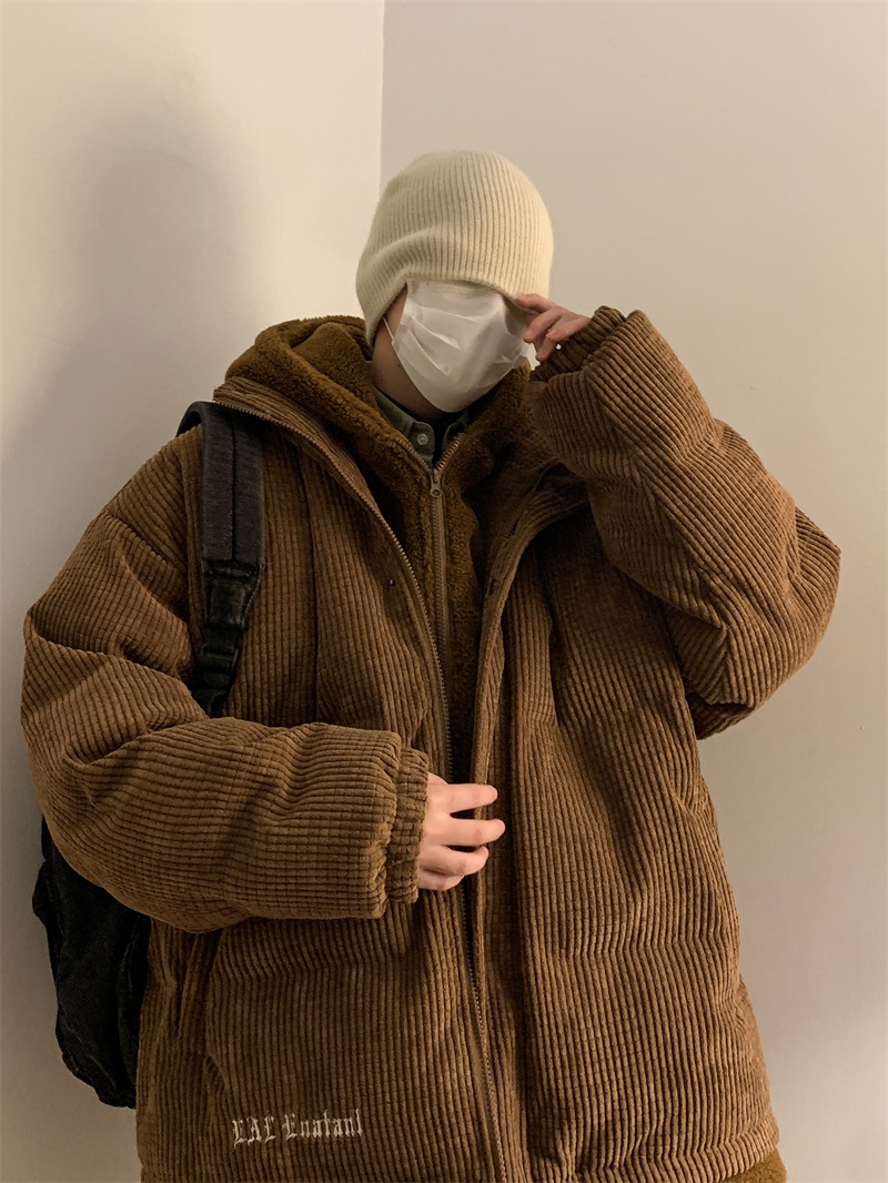 燈芯絨立領鋪棉外套夾克美式復古vintage假兩件羊羔毛連帽鋪棉外套外套ins