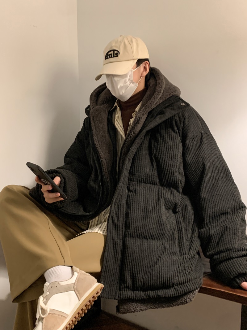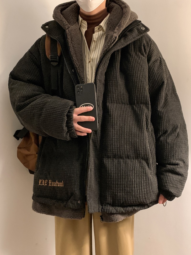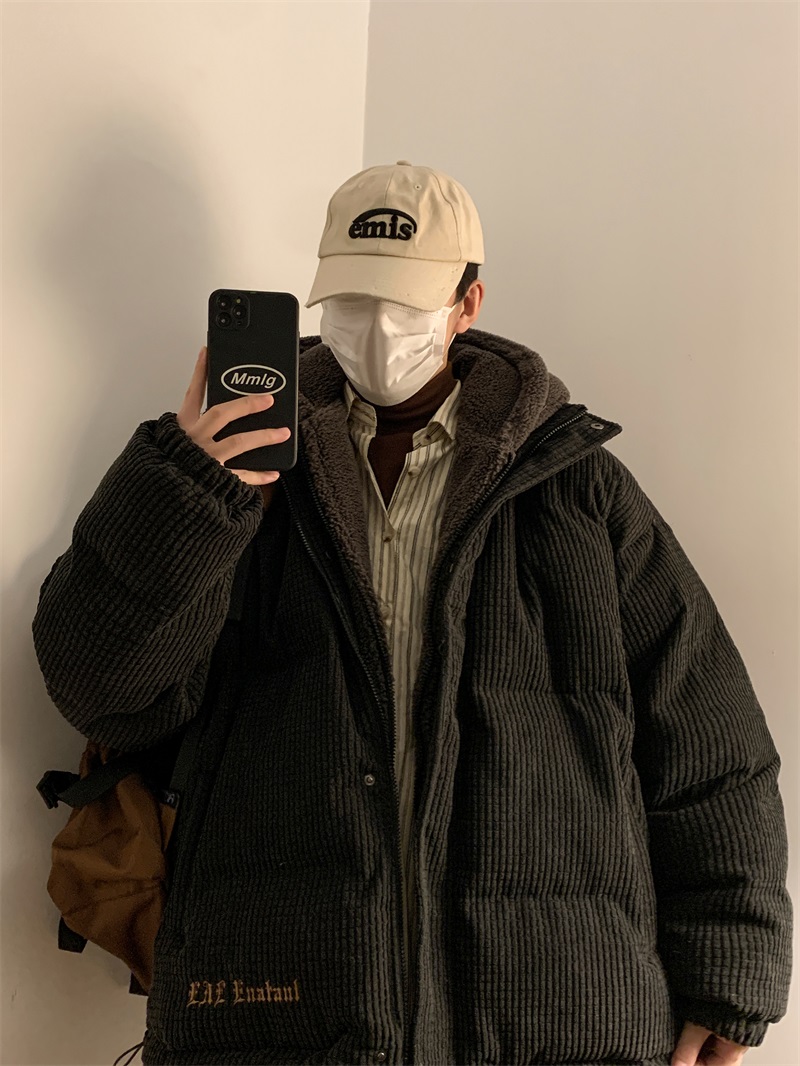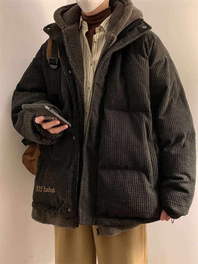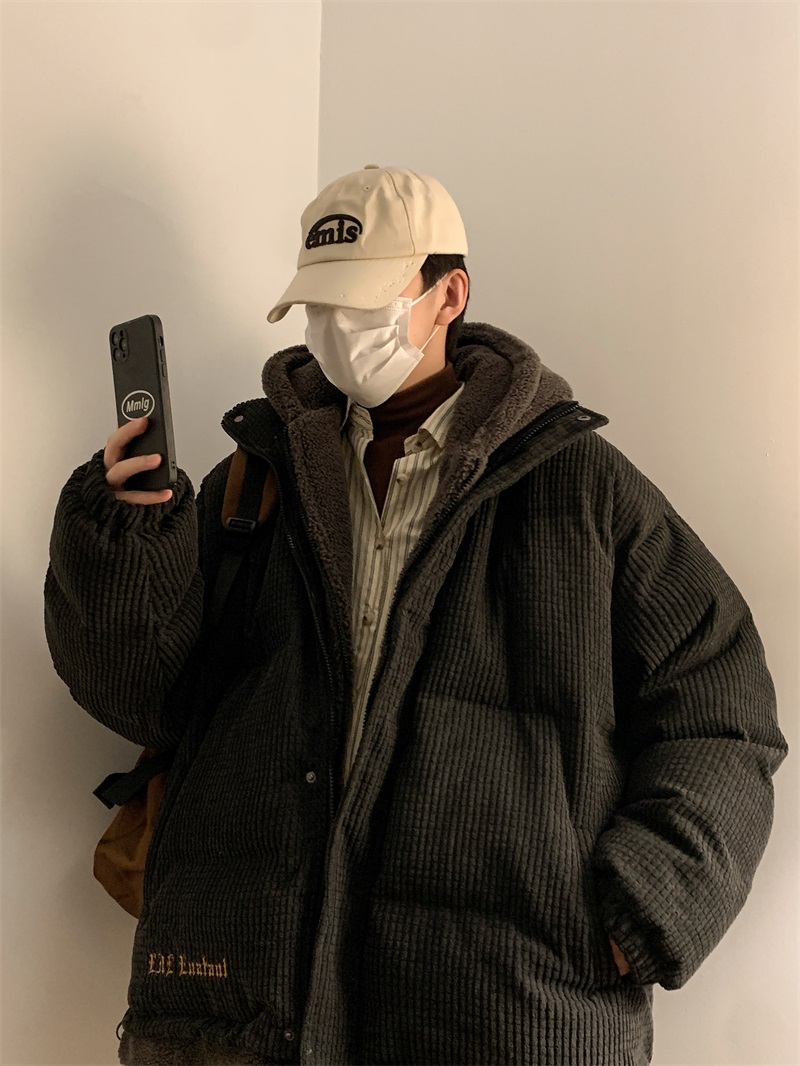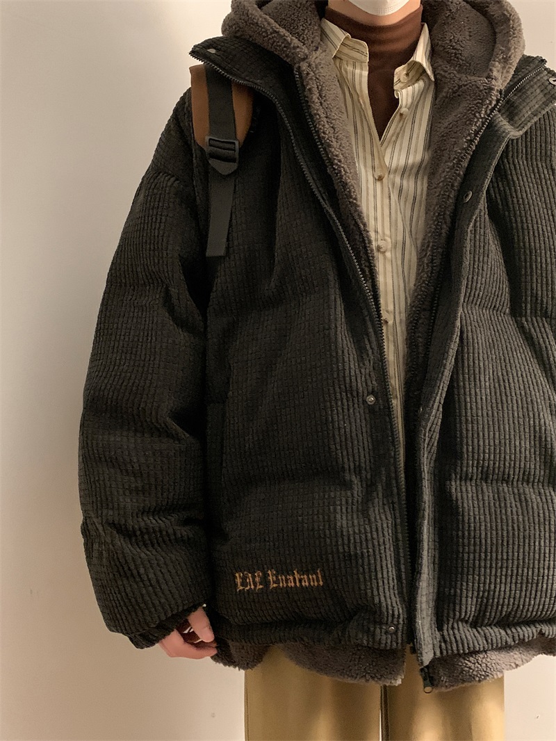 燈芯絨立領鋪棉外套夾克美式復古vintage假兩件羊羔毛連帽鋪棉外套外套ins