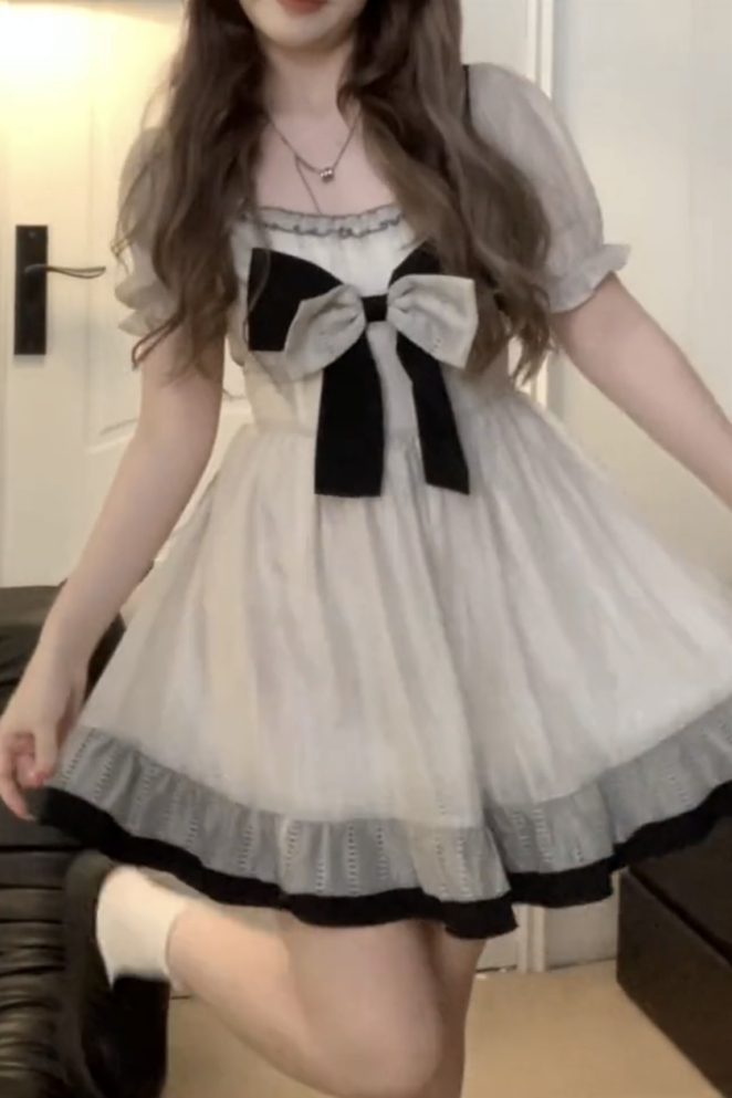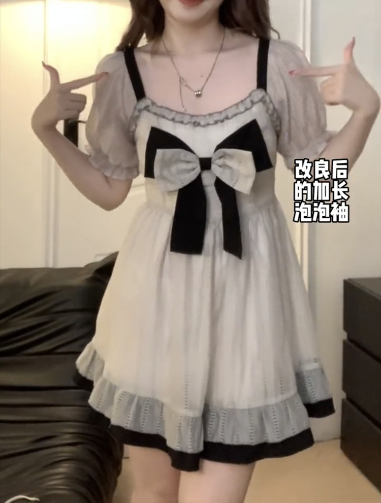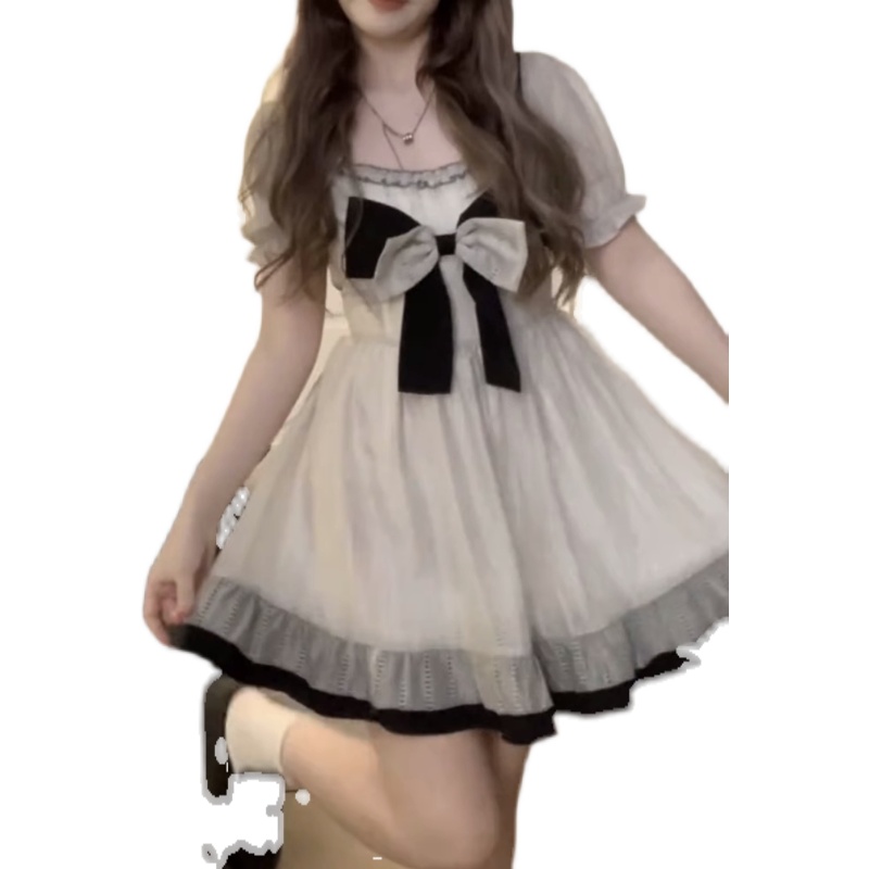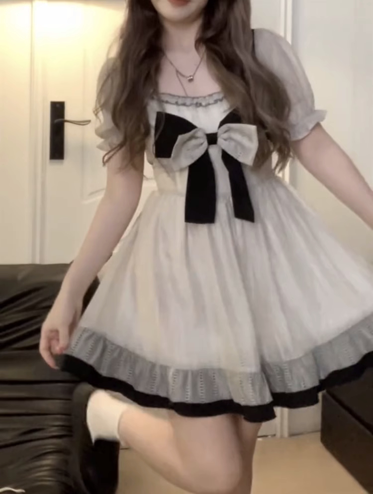 大尺碼在逃公主連身裙女夏季微胖mm甜美設計感方領蝴蝶結減齡A字裙