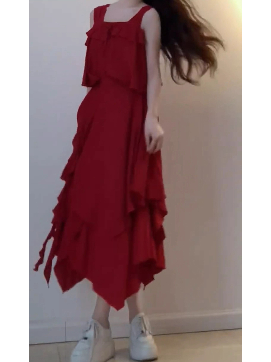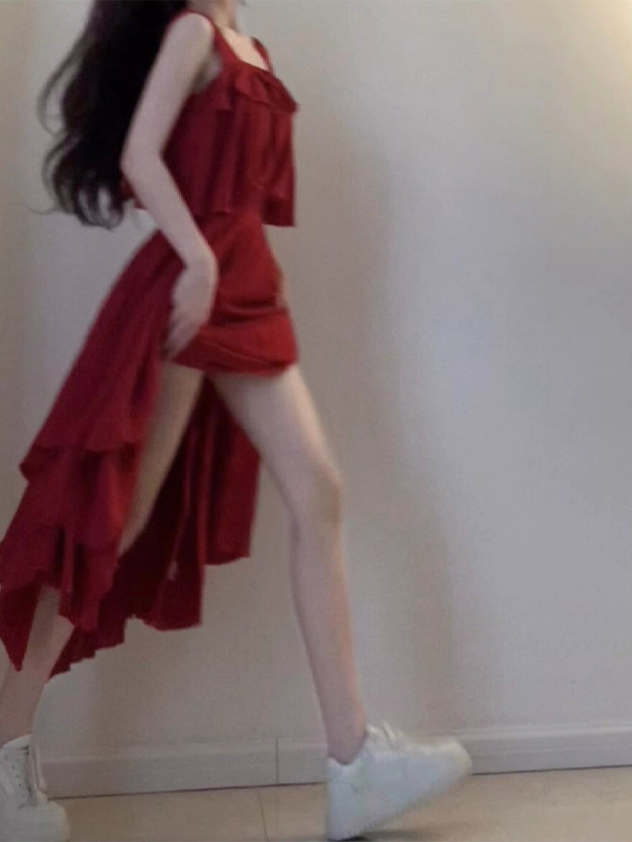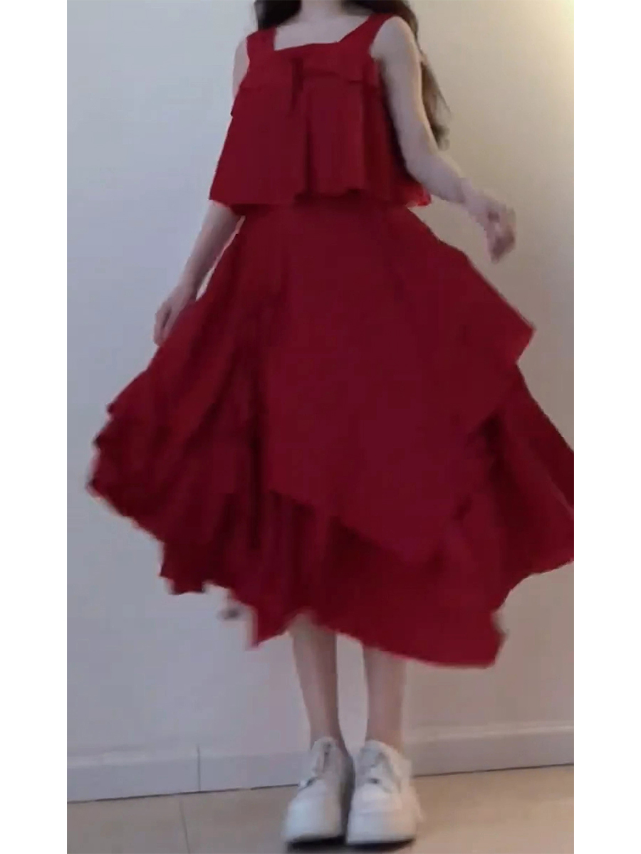 法式高級感不規則紅色短款上衣+半身套裝裙女夏季新款洋裝超仙