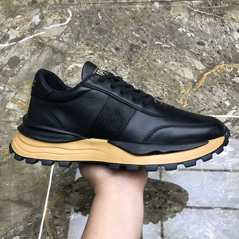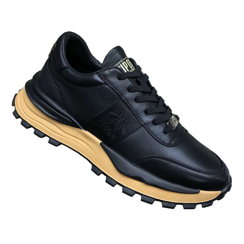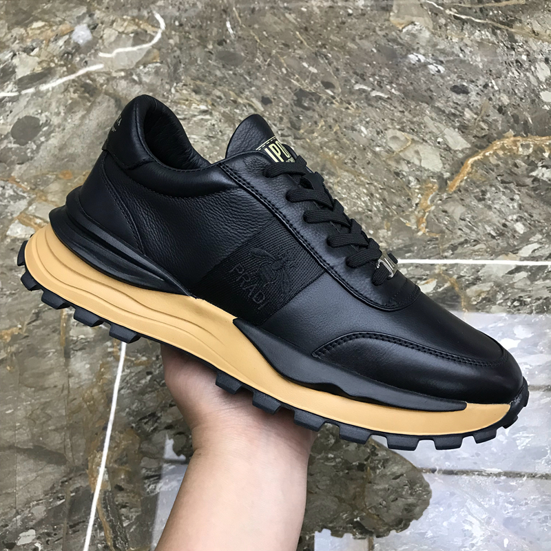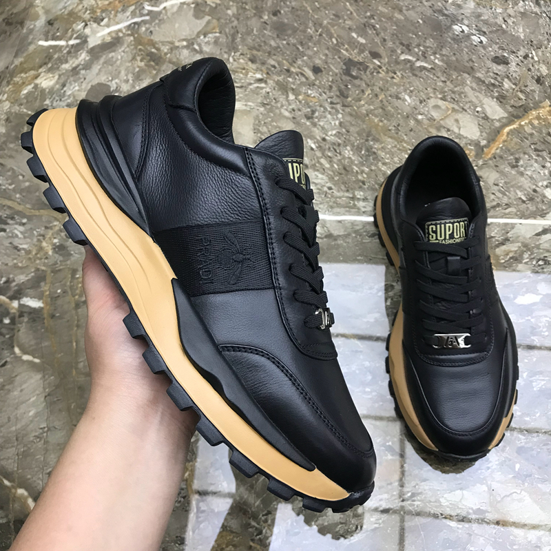 男鞋新款廣州正品真皮時尚休閒鞋圓頭厚底繫帶拼色輕便潮流運動鞋