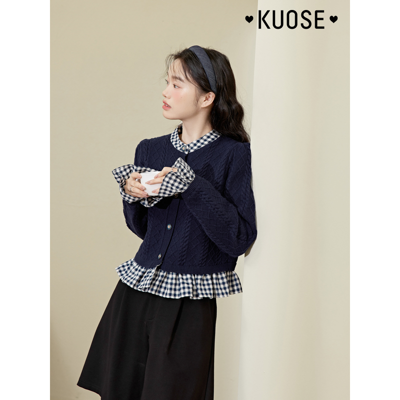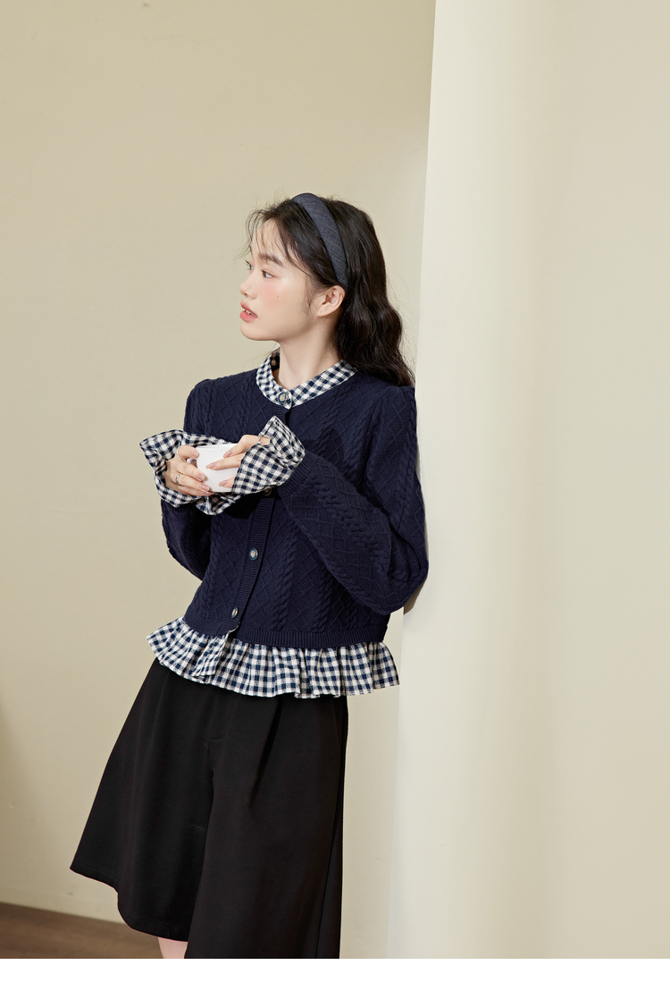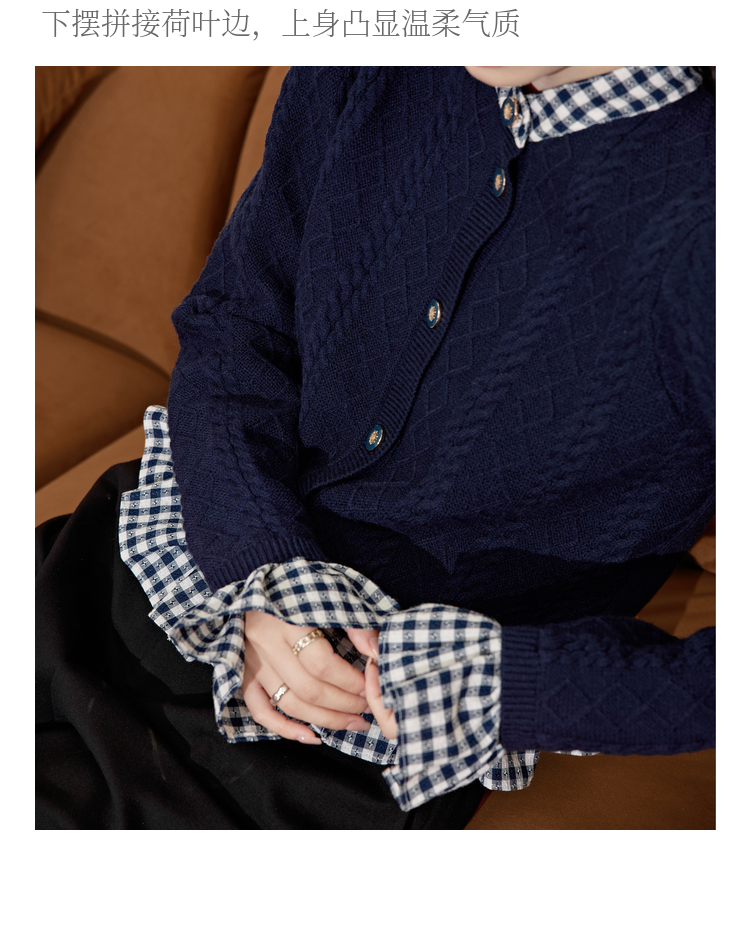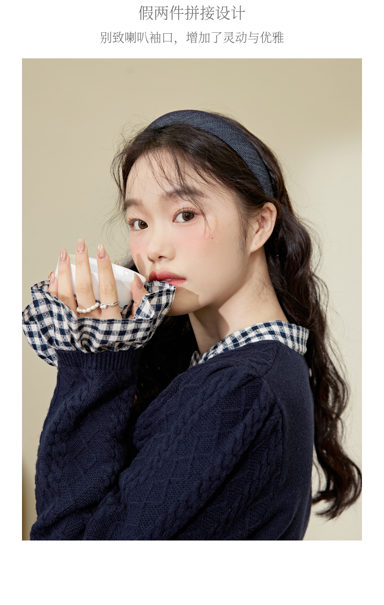闊色藍色拼接喇叭袖毛衣女2023秋冬新款假兩件襯衫荷葉邊針織衫