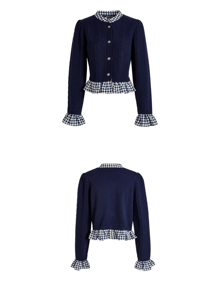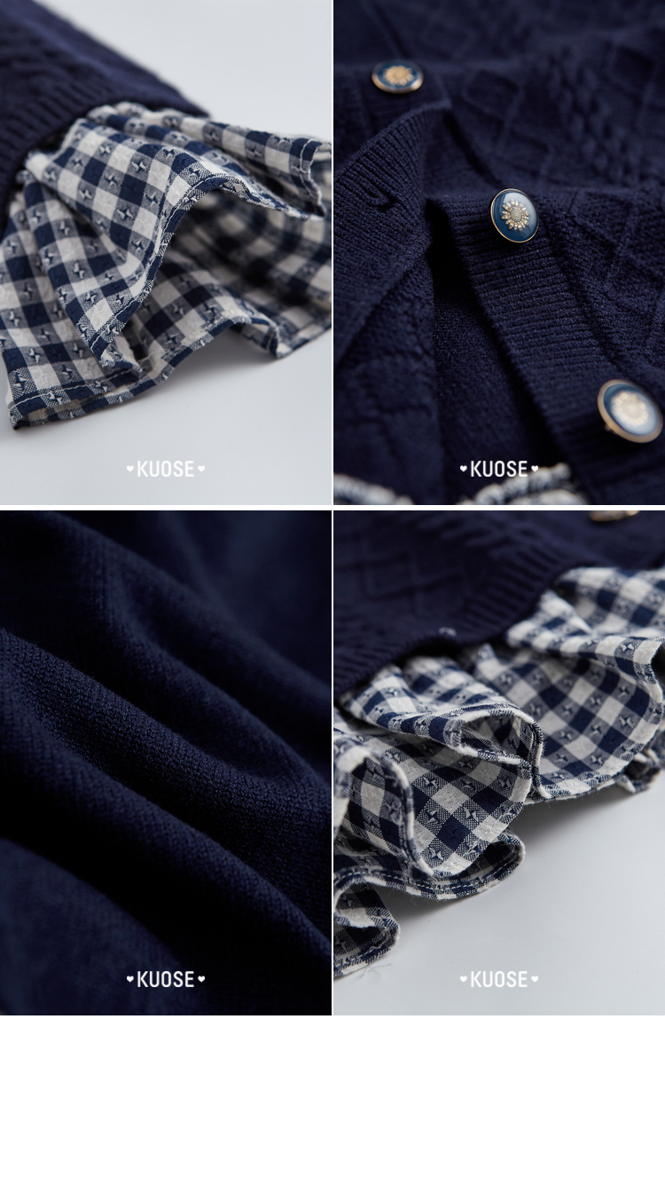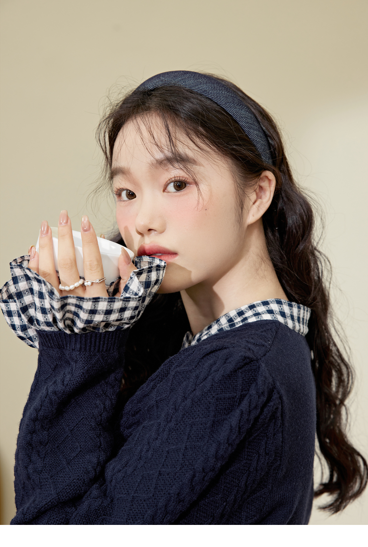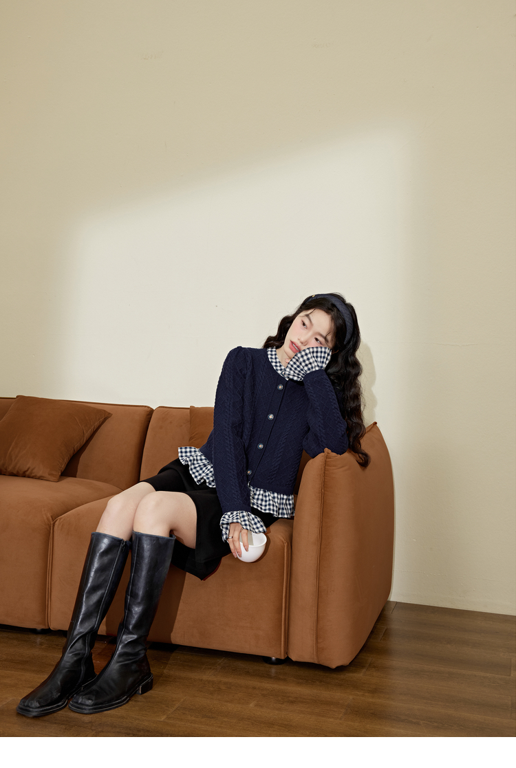 闊色藍色拼接喇叭袖毛衣女2023秋冬新款假兩件襯衫荷葉邊針織衫