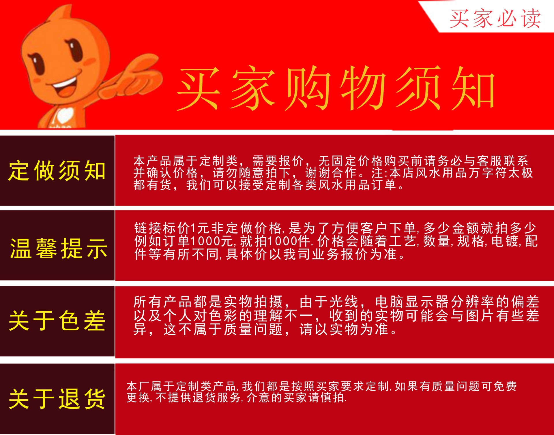 本公司的宗旨是:依靠质量,拓展市场,诚心服务,取信用户,欢迎国内外客户来图来样订做,数量不限,请随时来电咨询,我们将诚意为阁下提供理想服务。