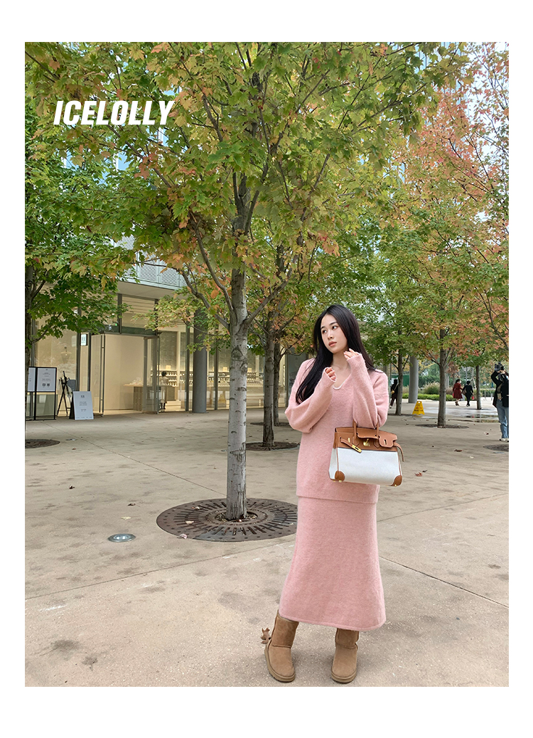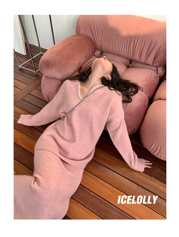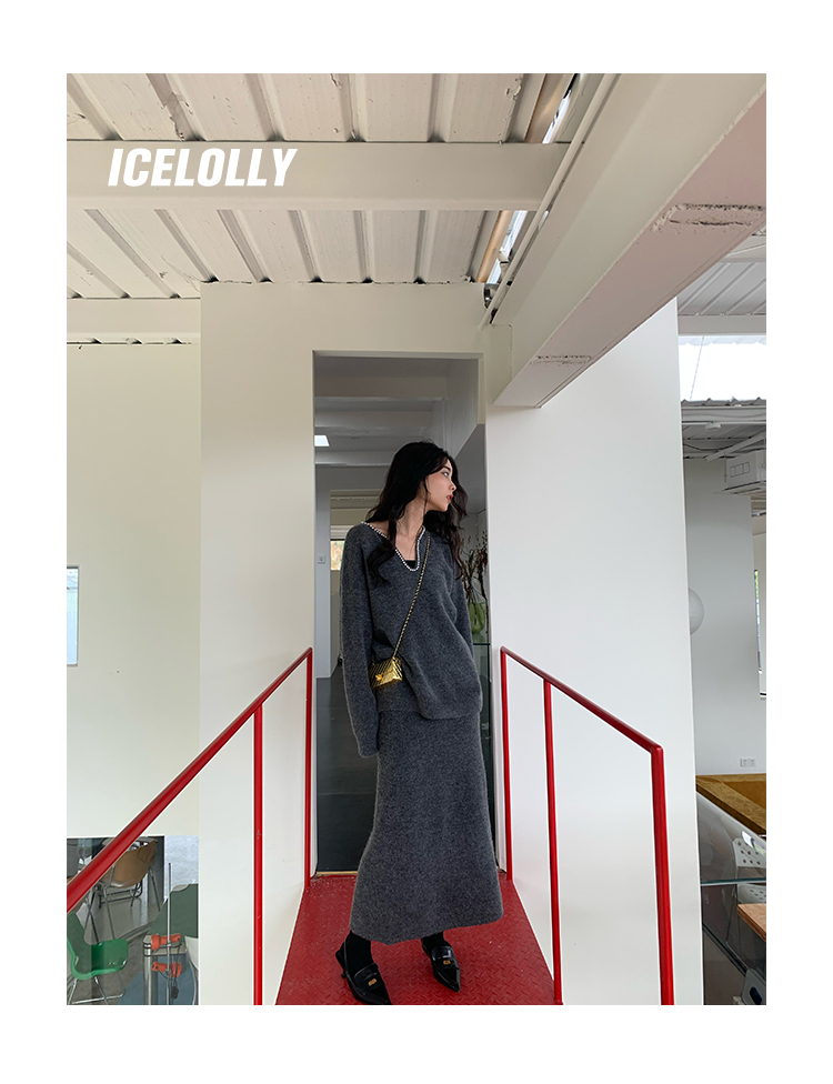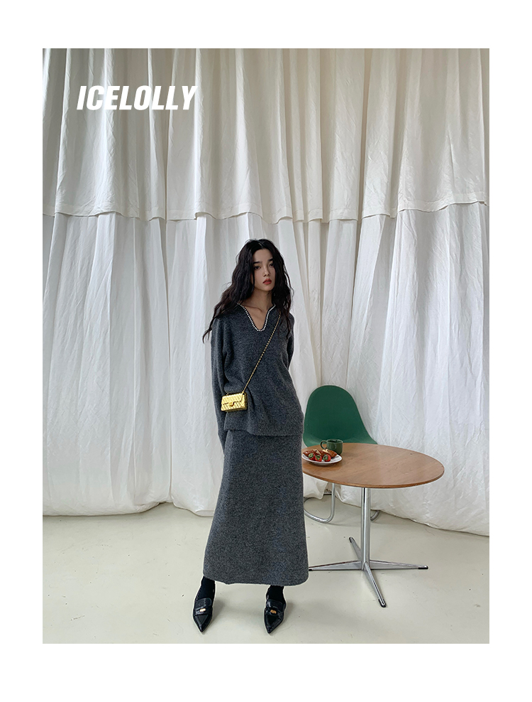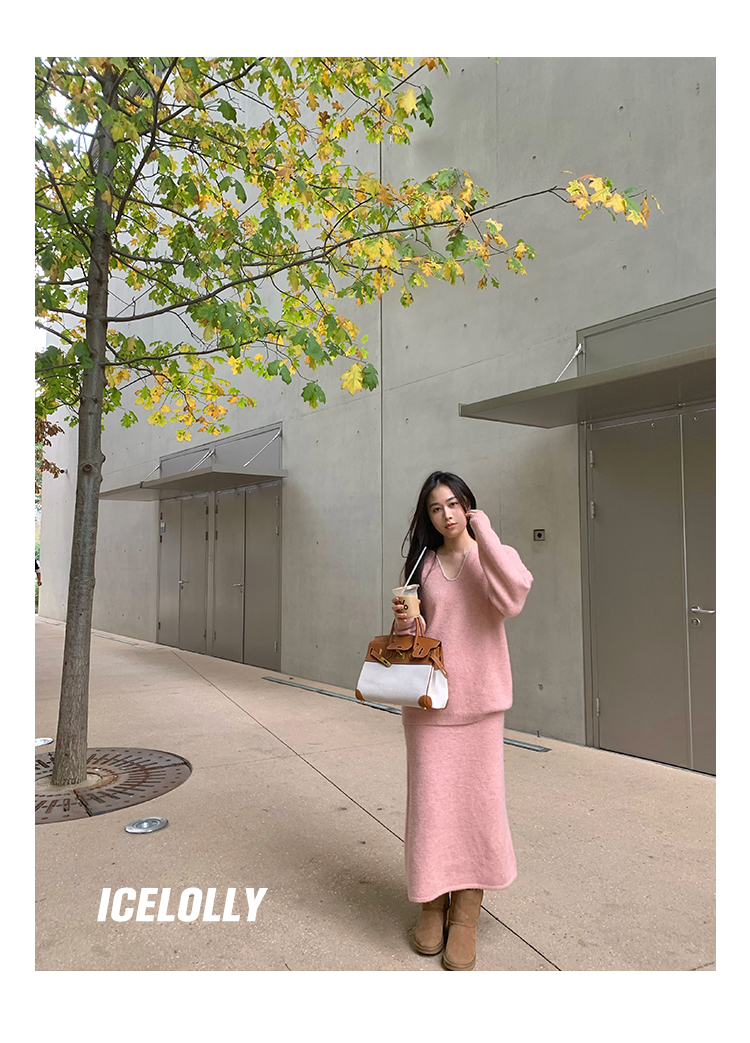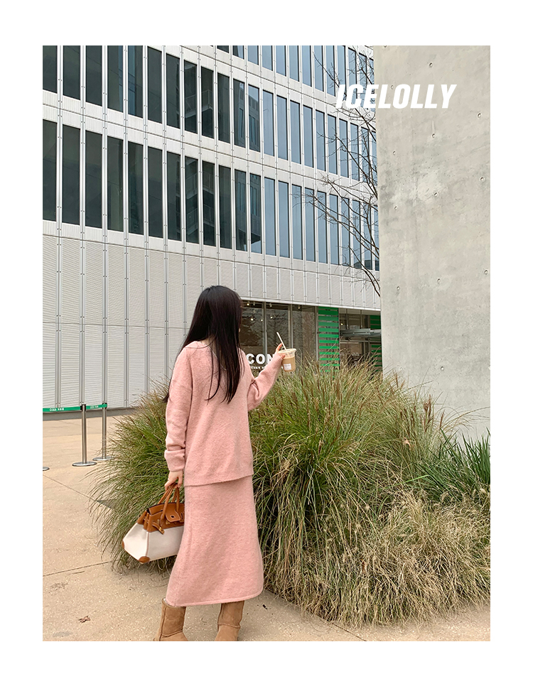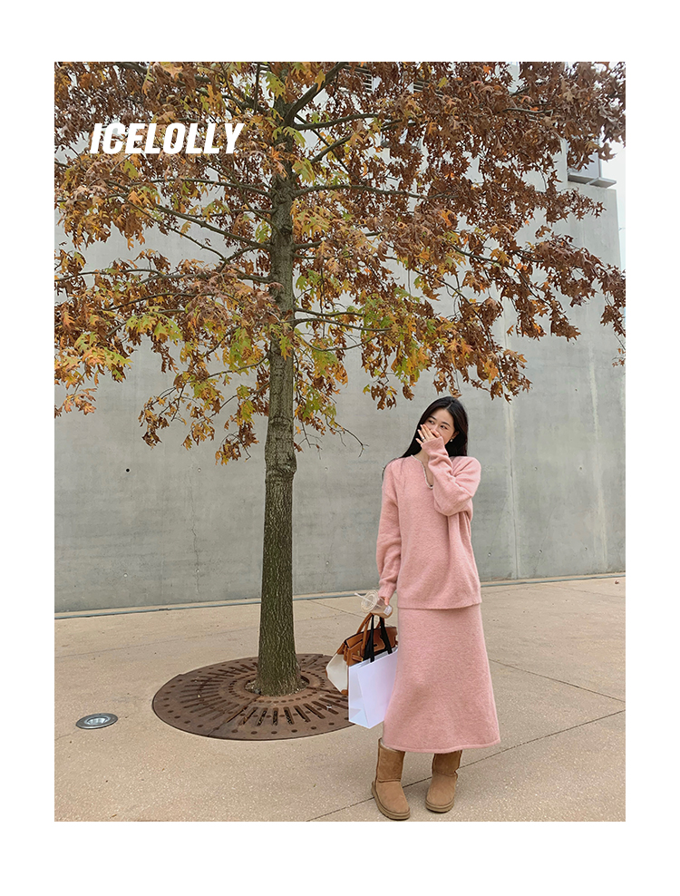 顏色分類 隕石灰 套衫.,肉桂粉 套衫.,隕石灰 半裙.,肉桂粉 半裙.