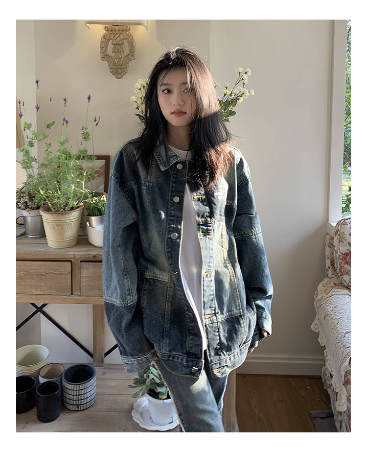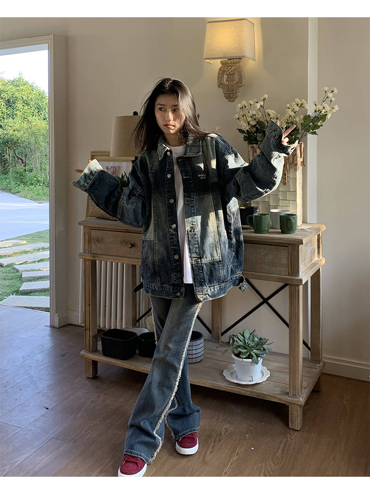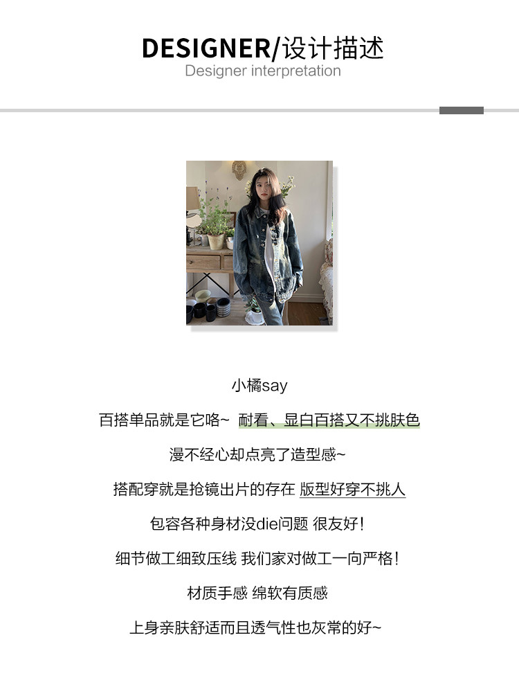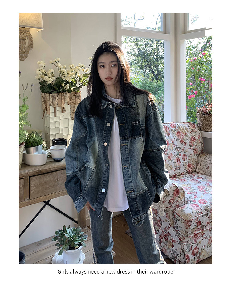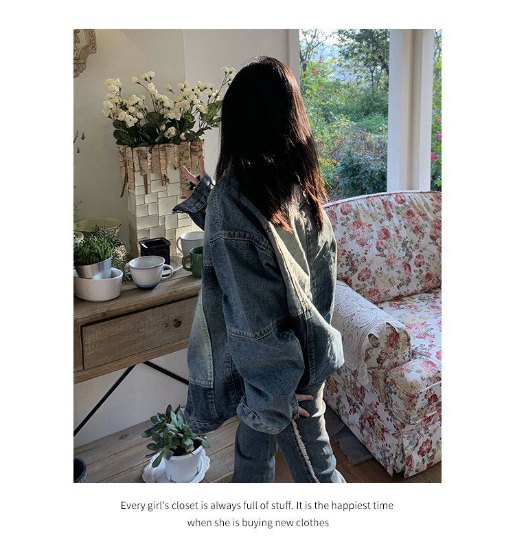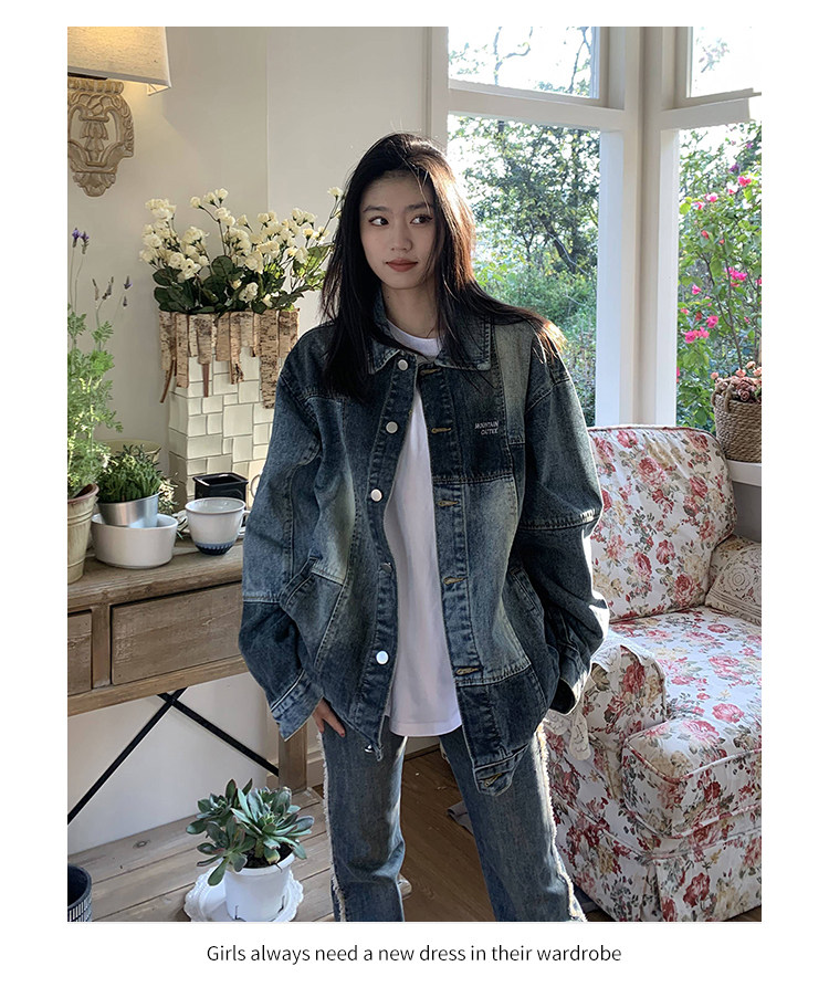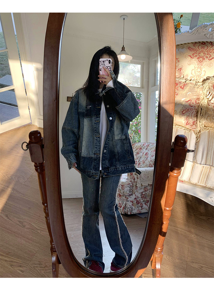 橘子樹在哪兒復古藍拼接牛仔外套女春季寬鬆小眾設計感拼色牛仔衣