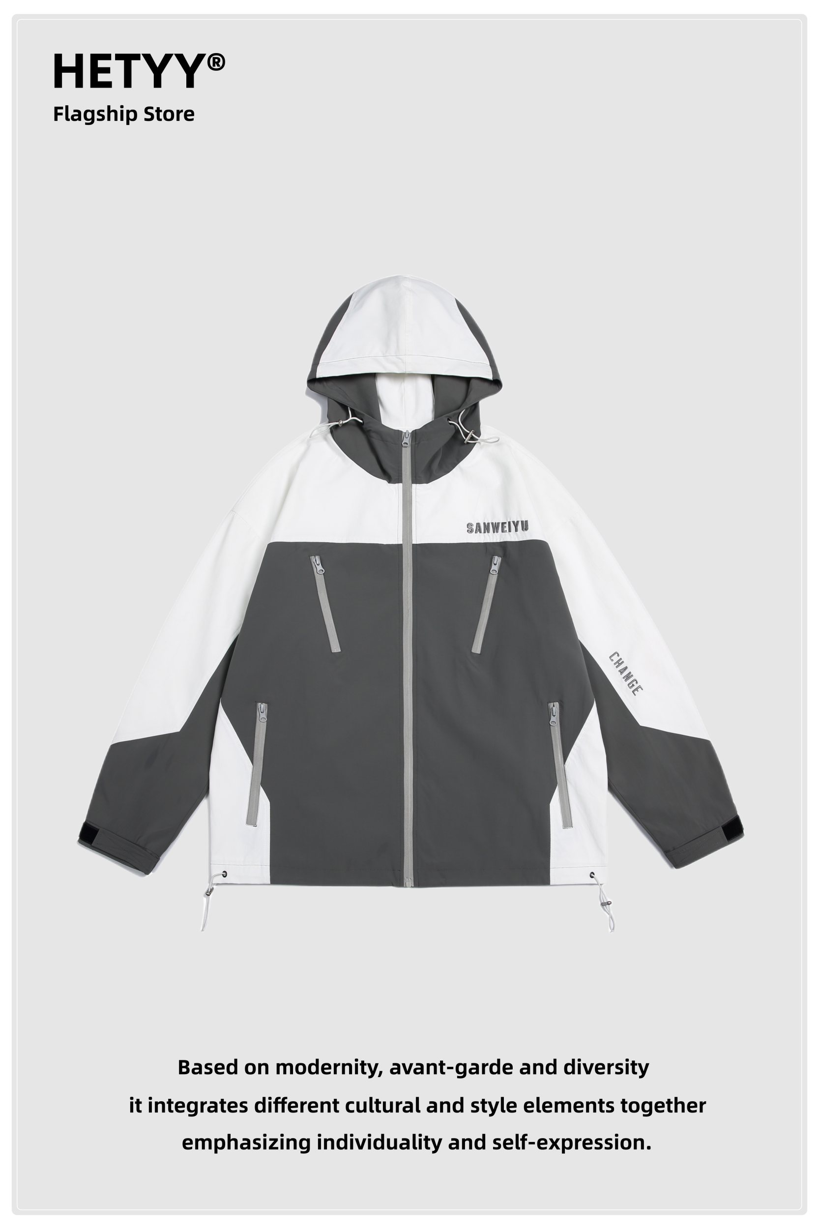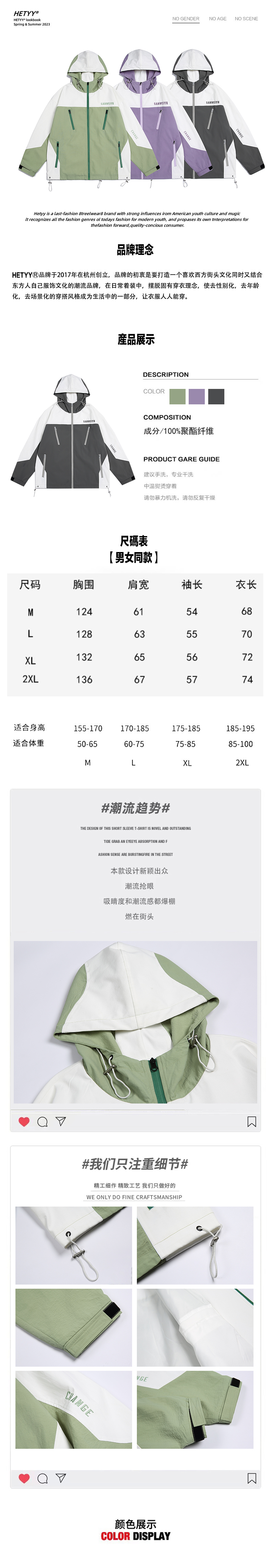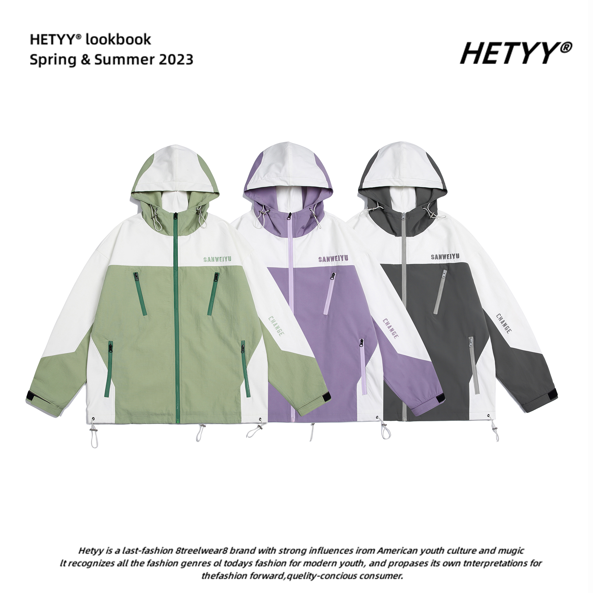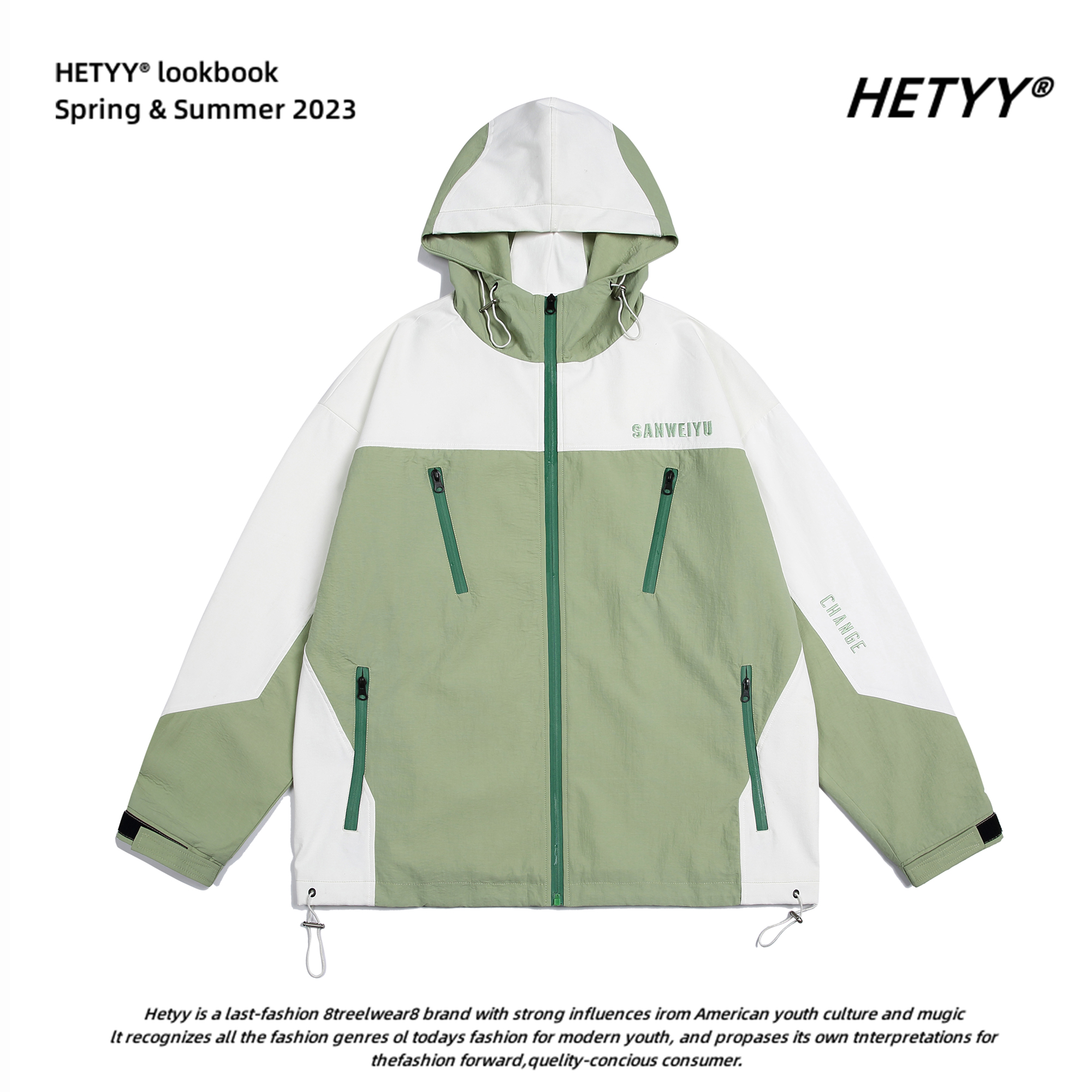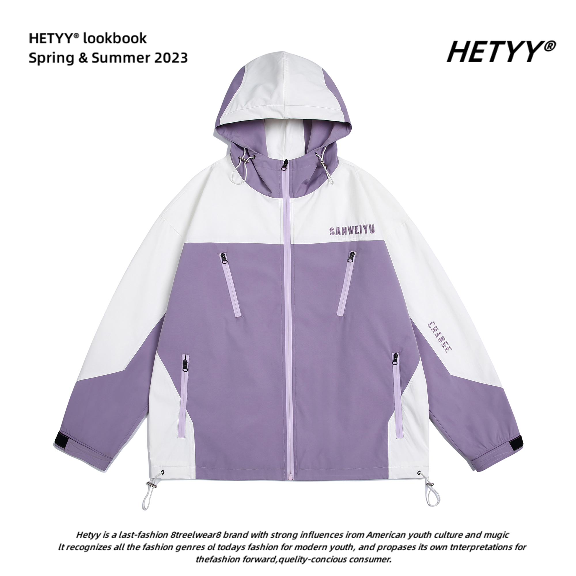 HETYY機能風撞色拼接連帽衝鋒衣男女復古寬鬆情侶百搭潮牌外套