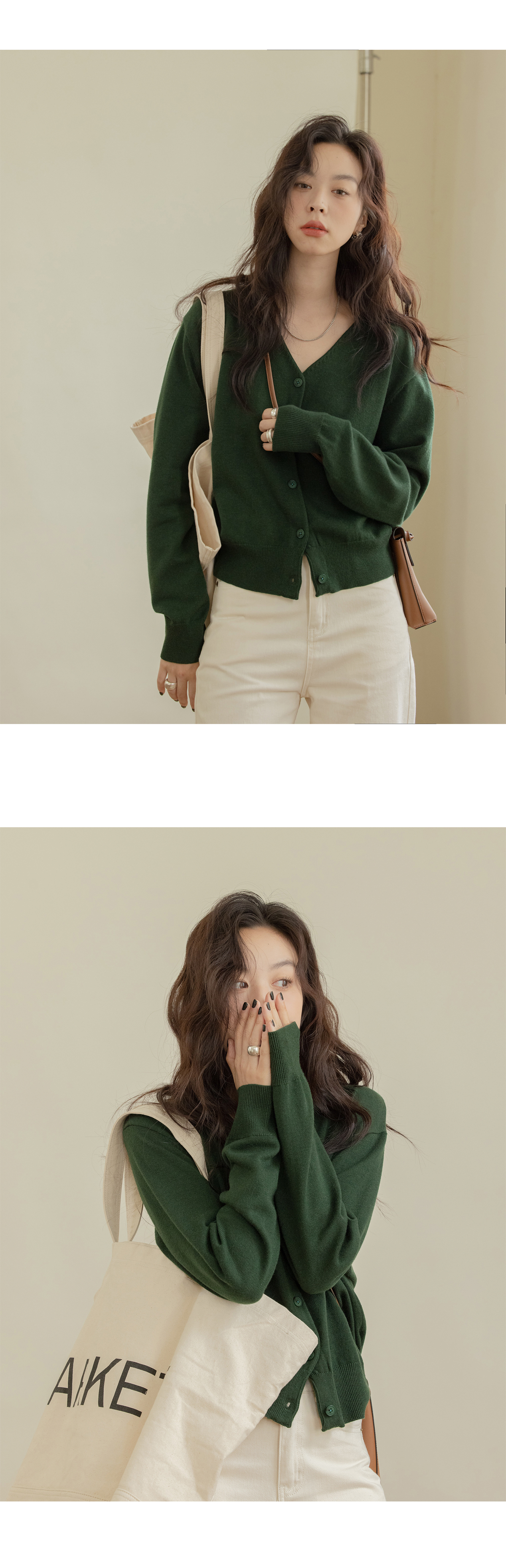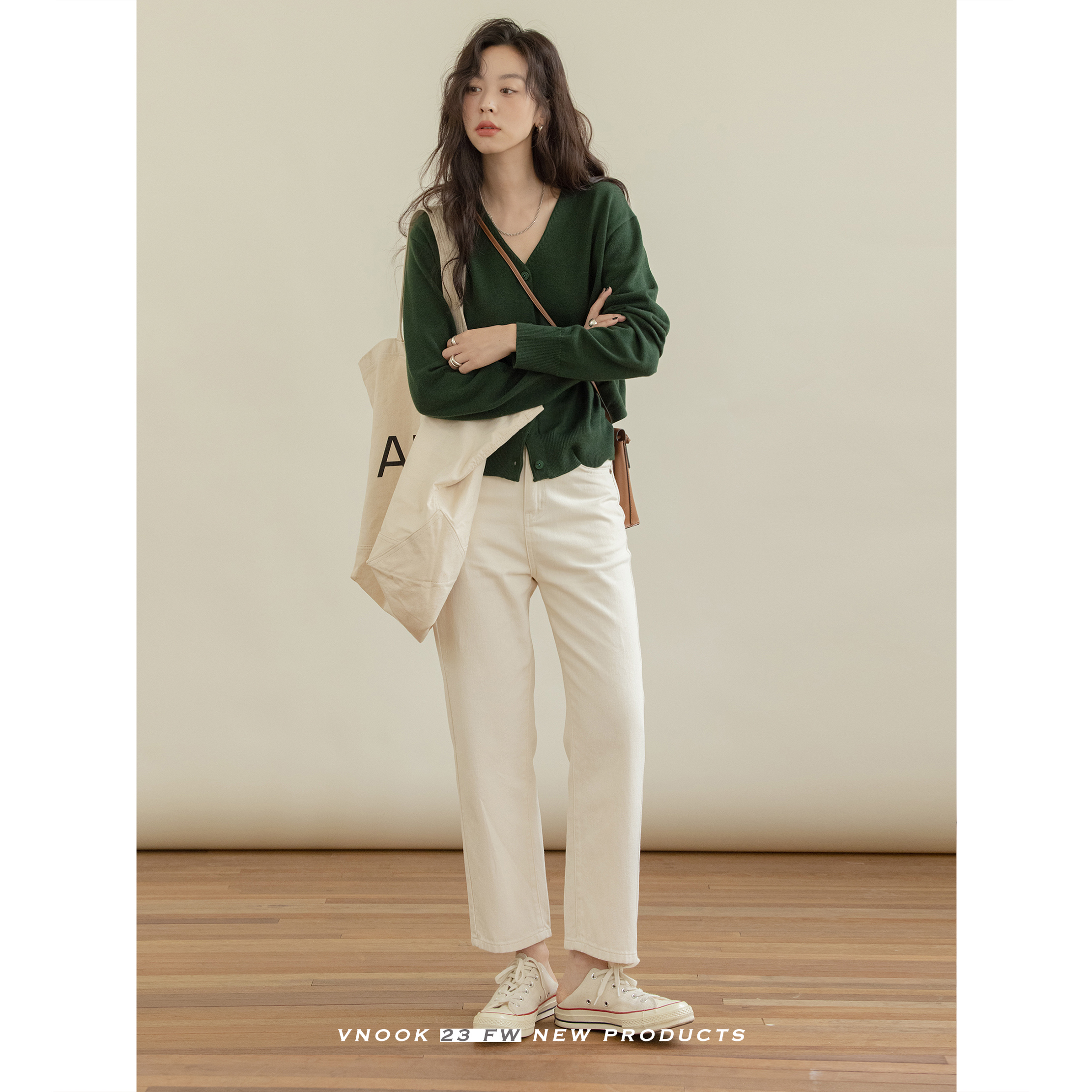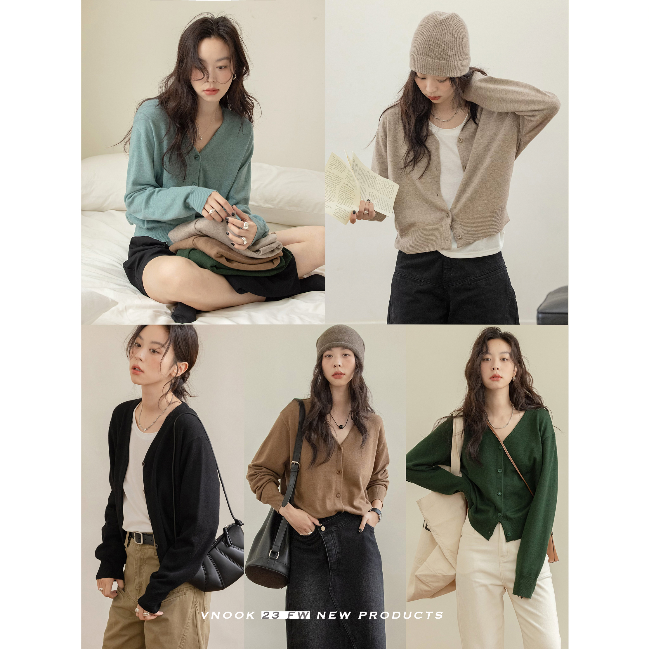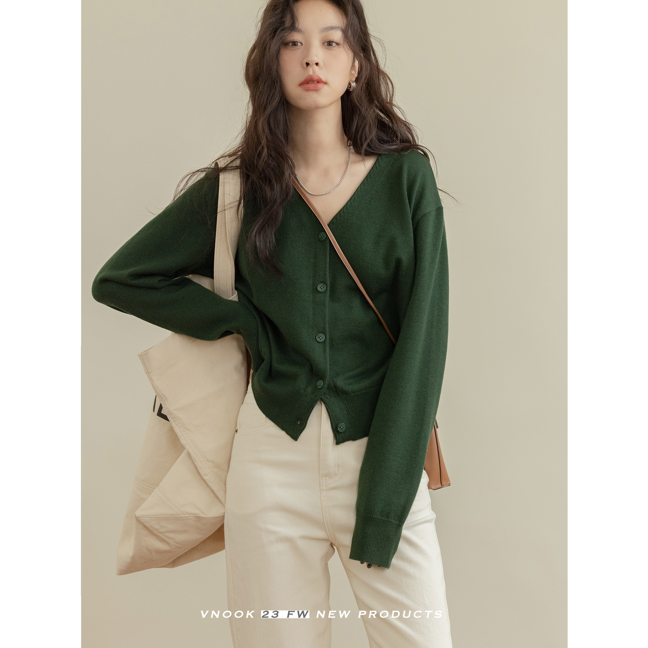 VNOOK 純色毛衣開衫女V領秋冬季新款落肩寬鬆休閒慵懶風短款外套