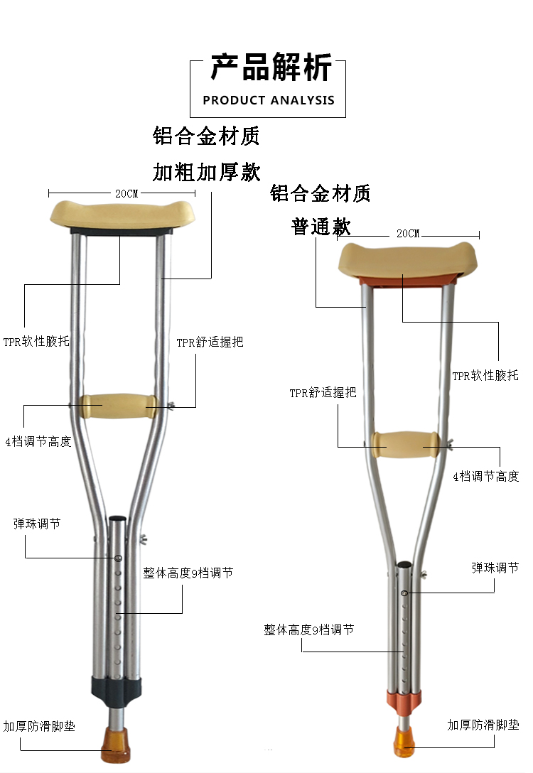 拐杖 分2款 :标准款  加粗加厚款 可以根据身高选择 也可以量下( 腋下到地面距离) 选择型号。