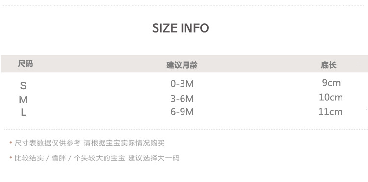 童袜尺码 S码9cm(建议0-3个月),M码10cm(建议3-6个月),L码11cm(建议6-9个月)