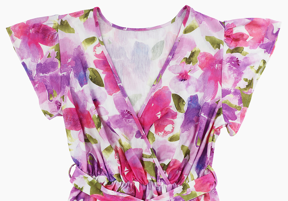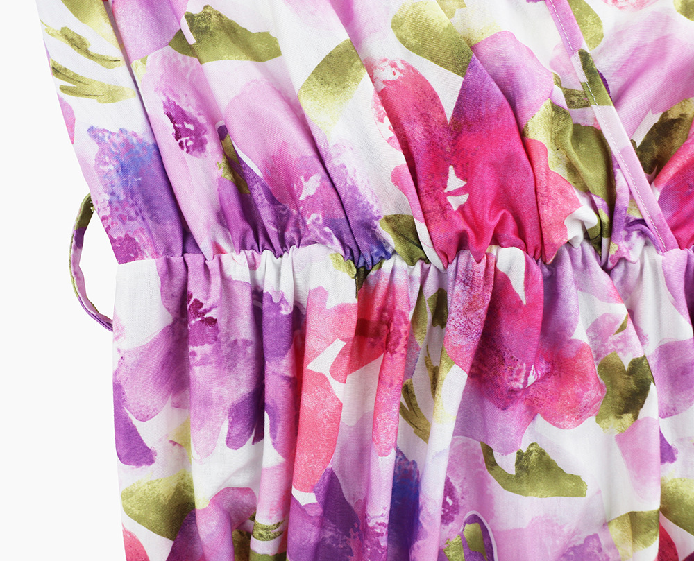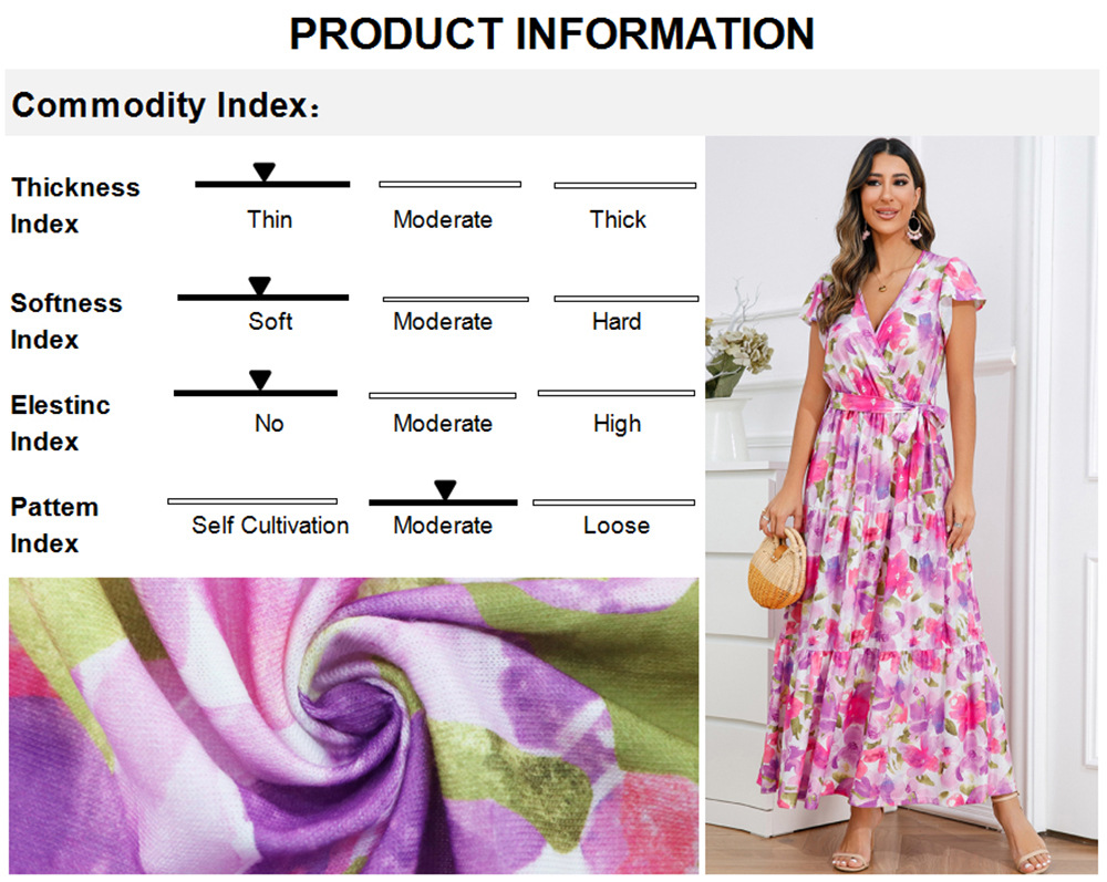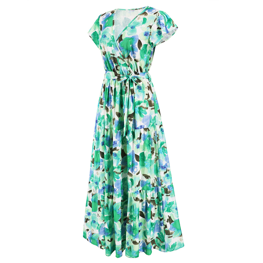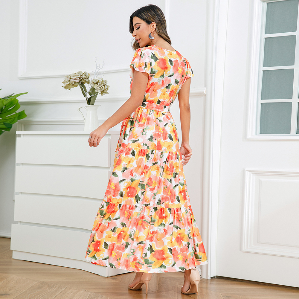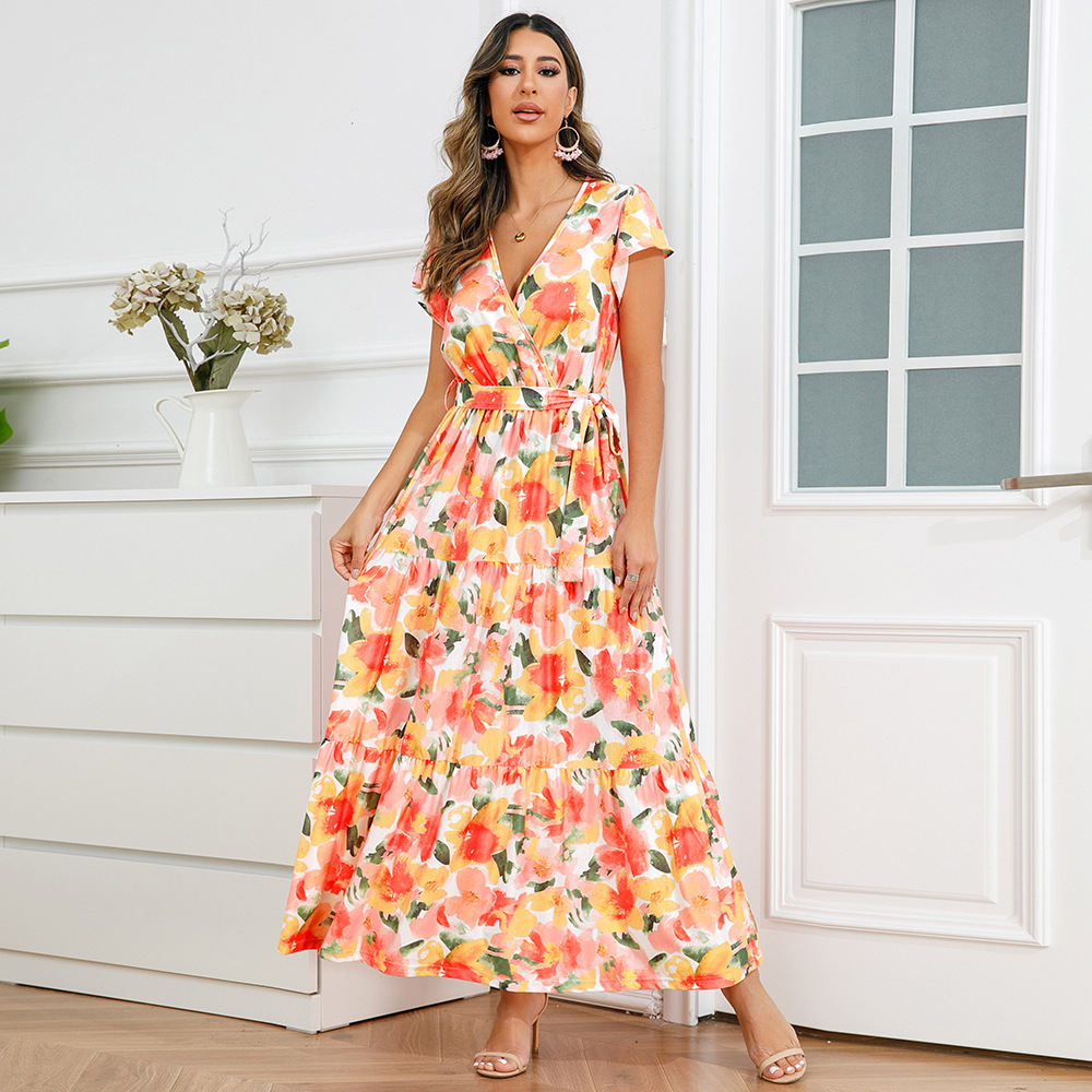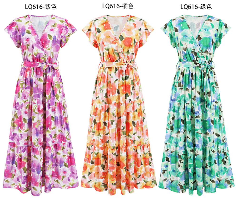 时尚大摆碎花长裙2023夏欧美外贸跨境女装V领荷叶边连衣裙亚马逊