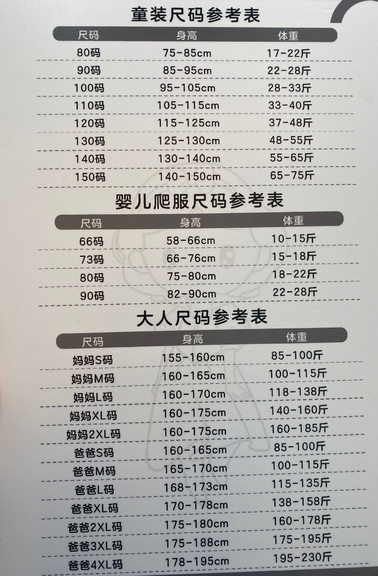 适合身高 女宝80cm,女宝90cm,女宝100cm,女宝110cm,女宝120cm,女宝130cm,女宝140cm,妈S,妈M,妈L,妈XL,男宝80cm,男宝90cm,上衣M,上衣L,上衣XL,上衣XXL,上衣3XL,上衣4XL,男宝100码,男宝110码,男宝120码,男宝130码,男宝140码,男宝150码,女宝150码