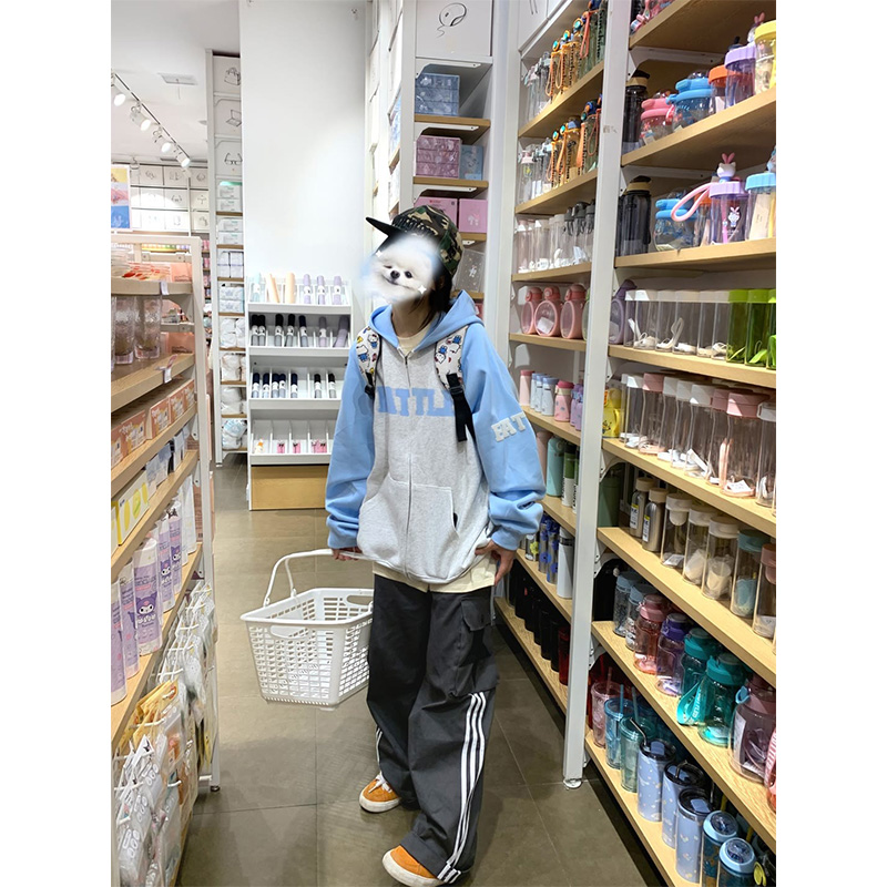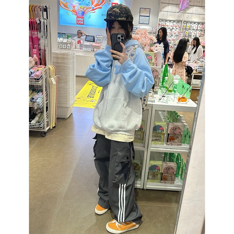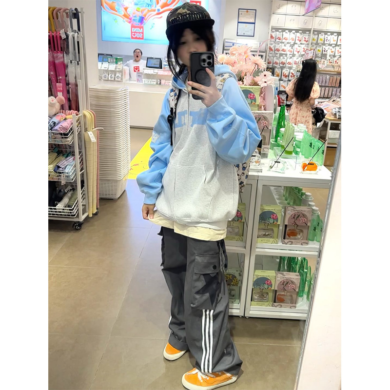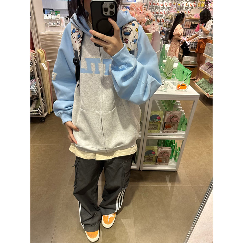 美式復古撞色插肩衛衣外套女春秋寬鬆潮牌小個子開衫連帽長袖上衣