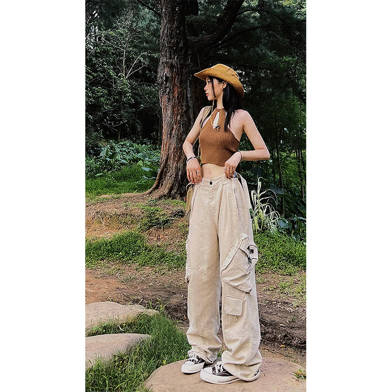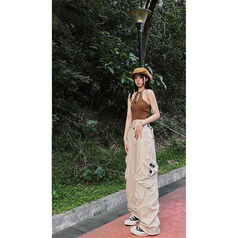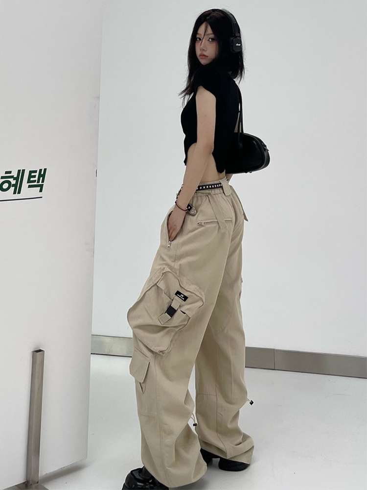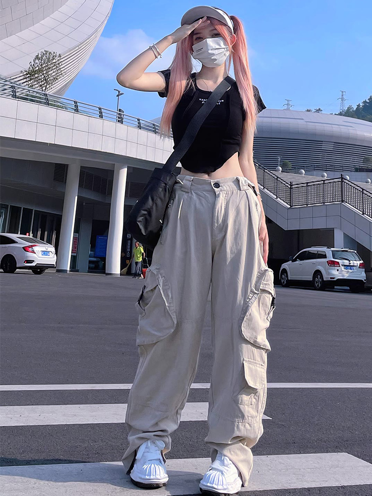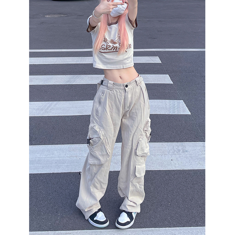 多口袋工裝休閒褲子女夏季新款ins潮美式復古街頭hiphop直筒長褲
