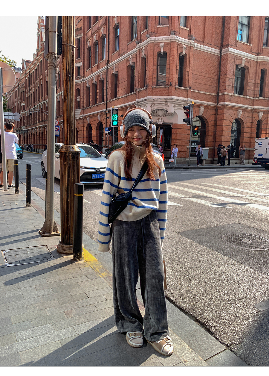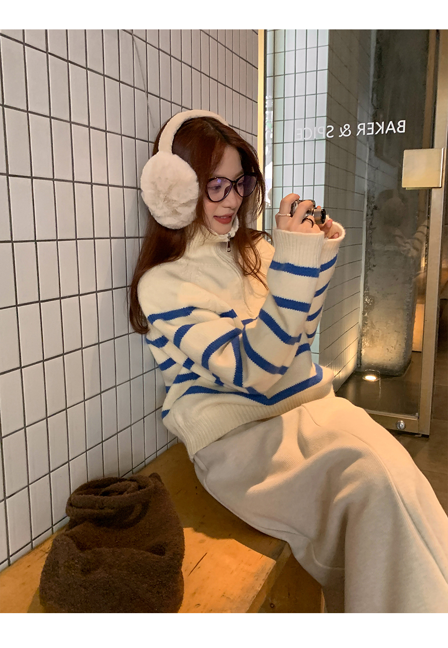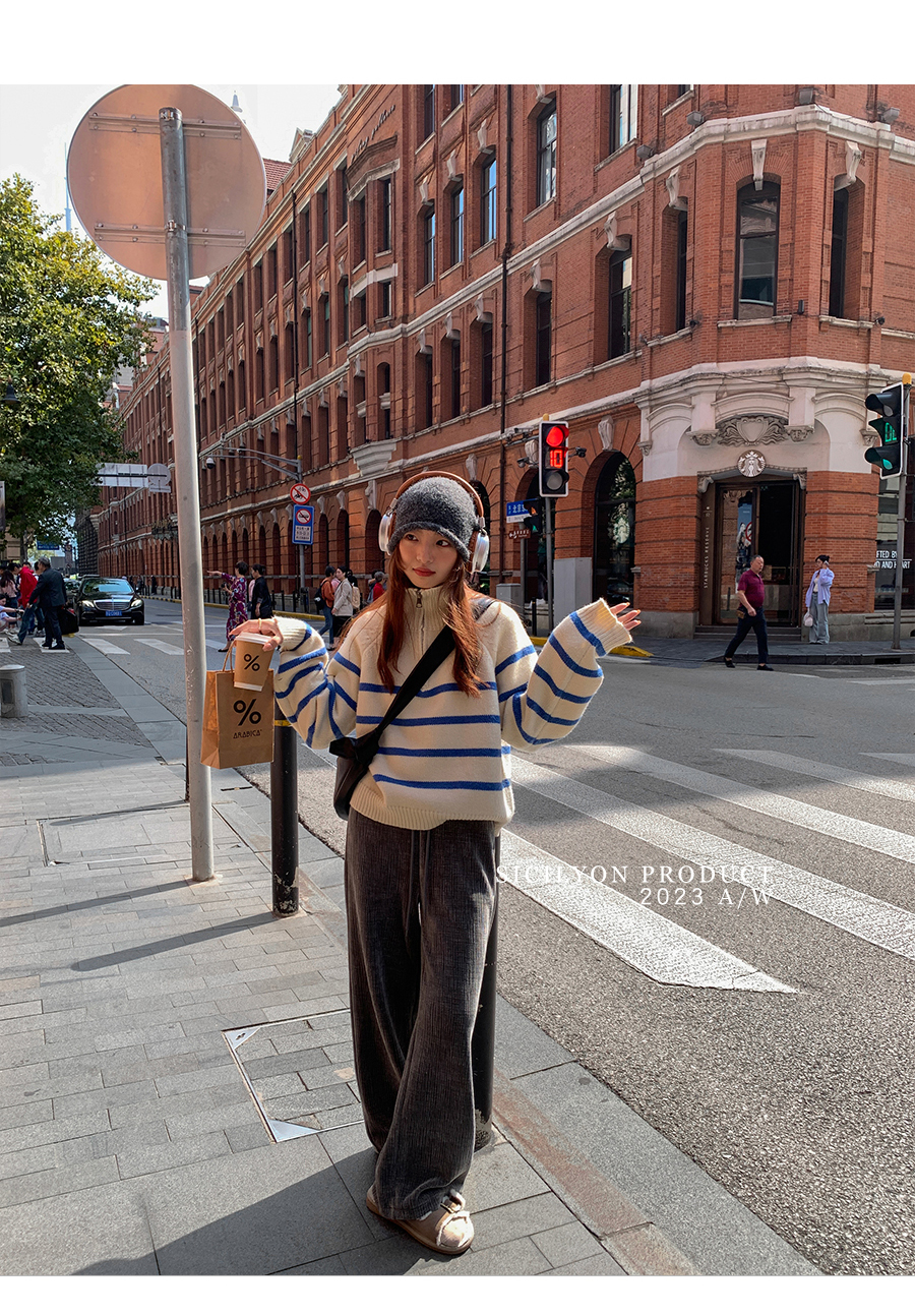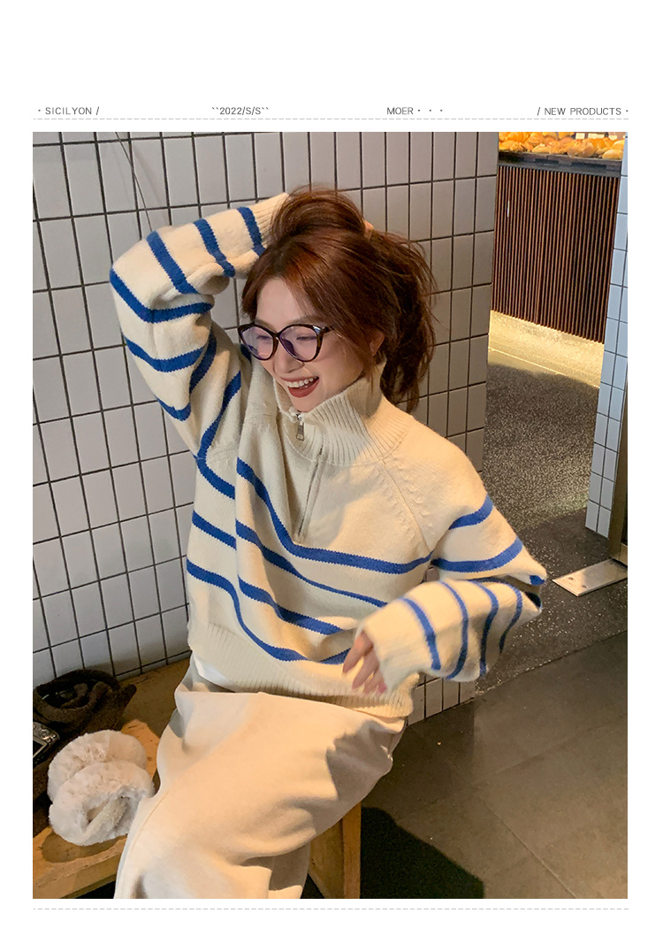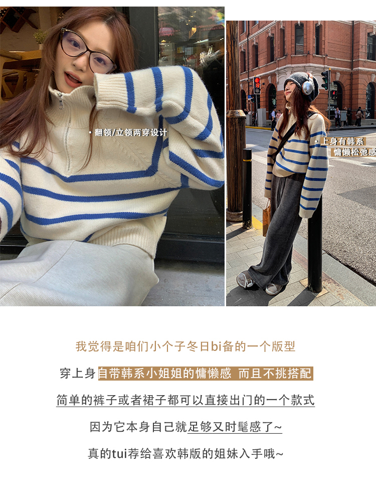 西西裏安 韓系翻領拉鍊撞色條紋毛衣女小個子寬鬆復古慵懶針織衫