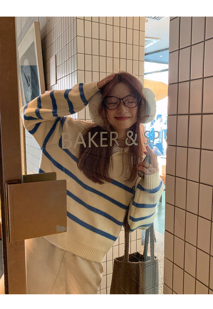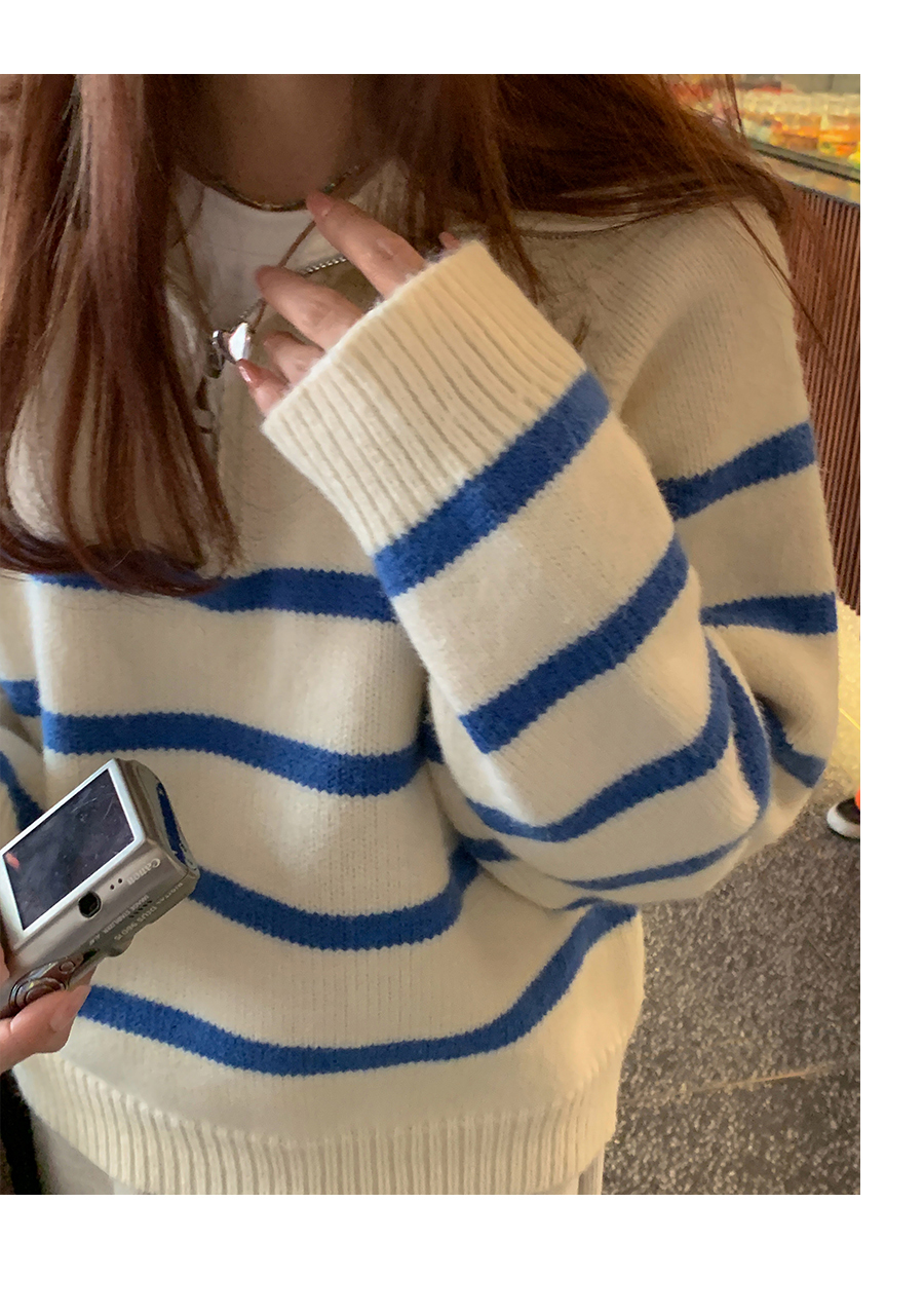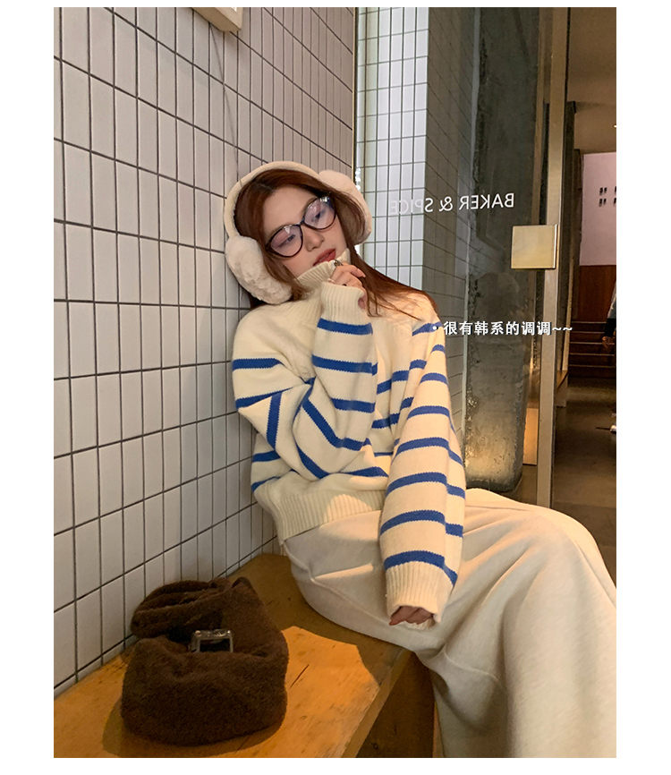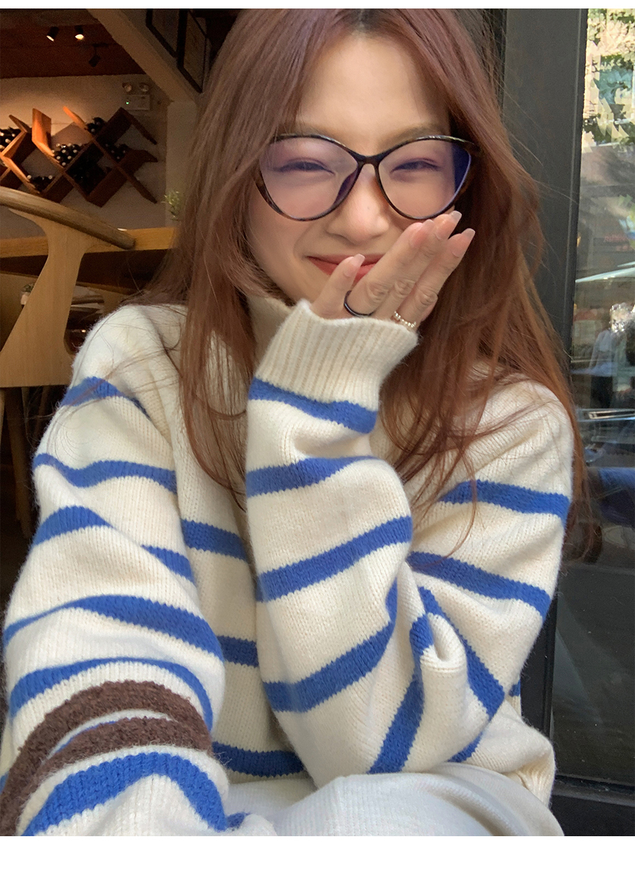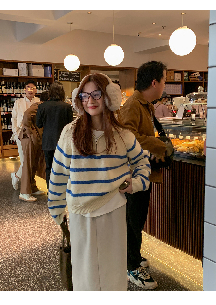西西裏安 韓系翻領拉鍊撞色條紋毛衣女小個子寬鬆復古慵懶針織衫
