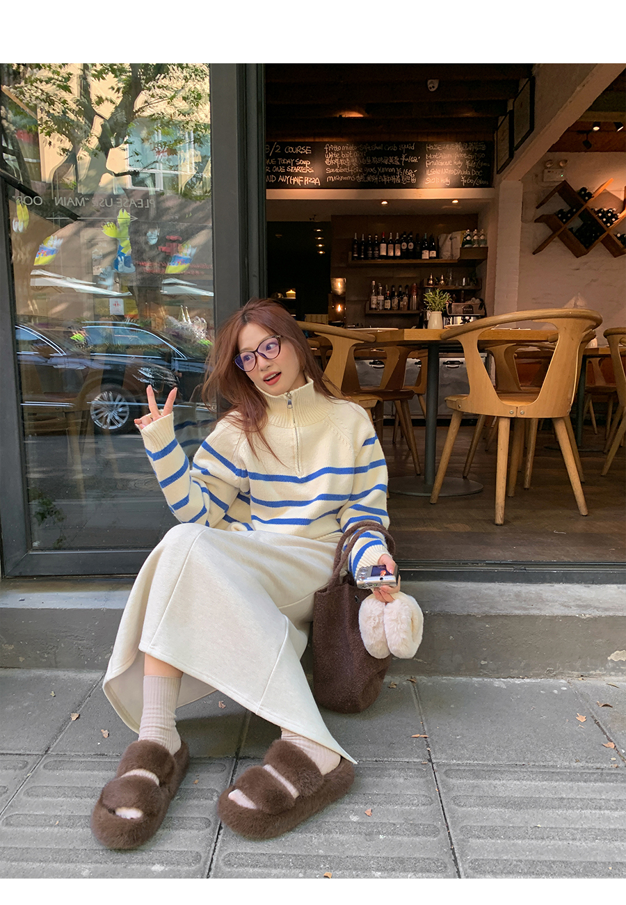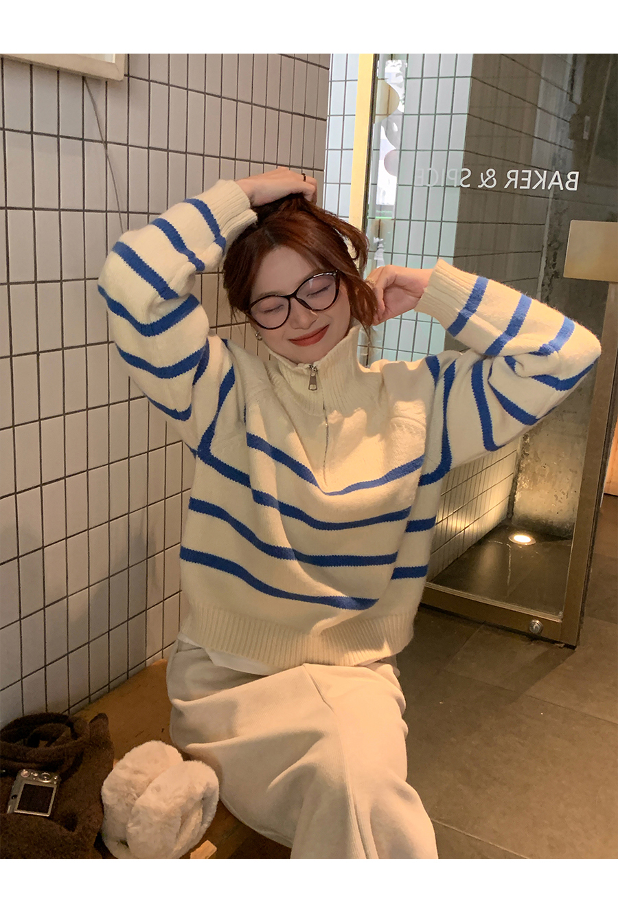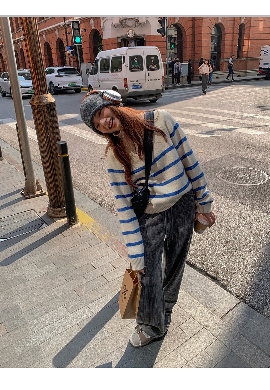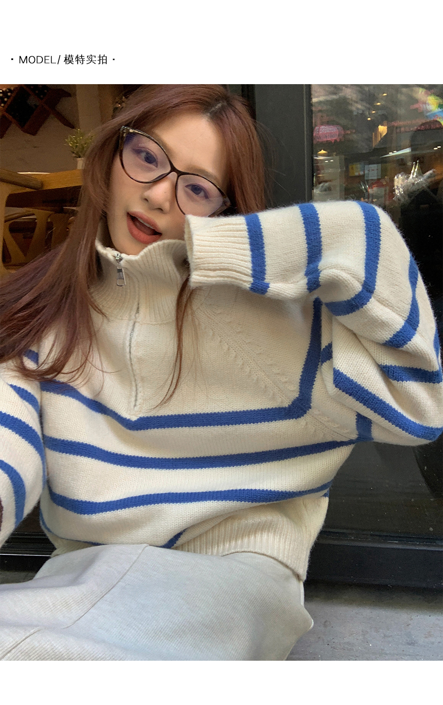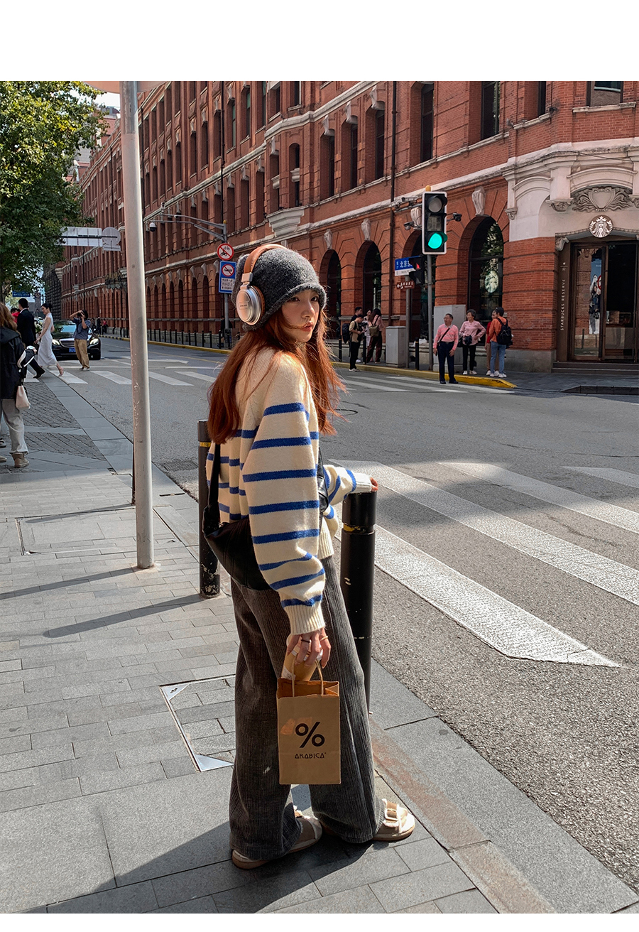 西西裏安 韓系翻領拉鍊撞色條紋毛衣女小個子寬鬆復古慵懶針織衫