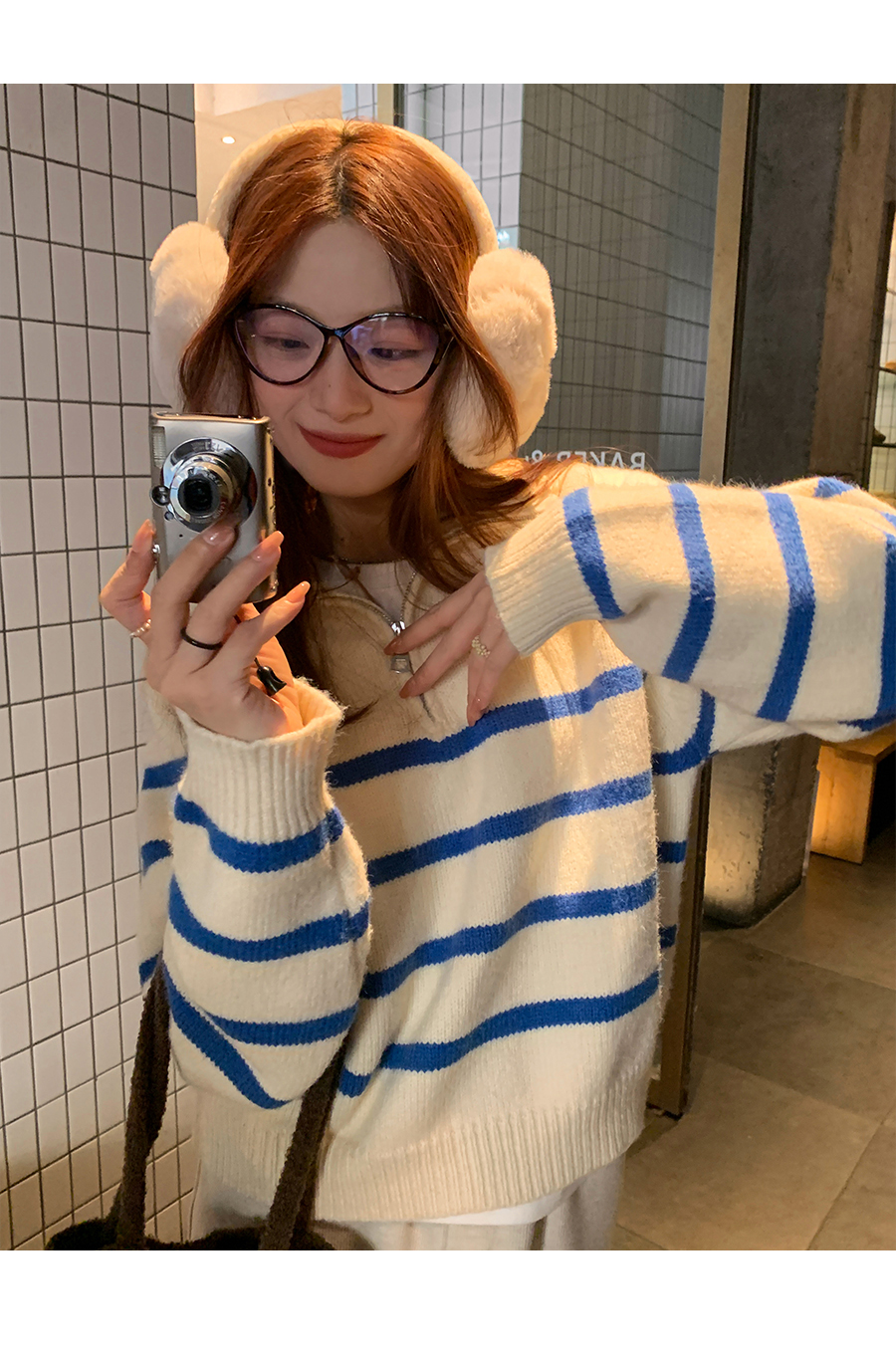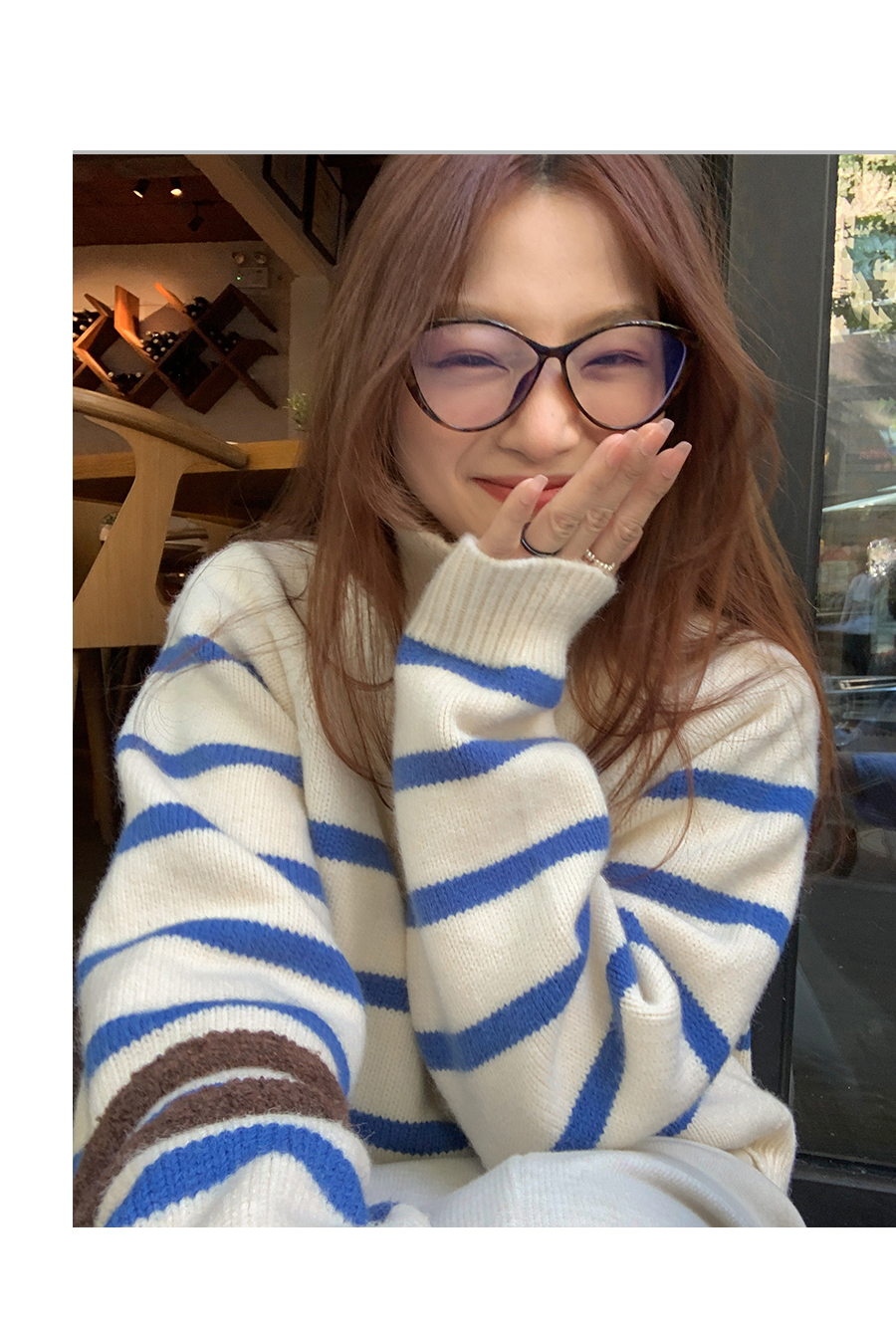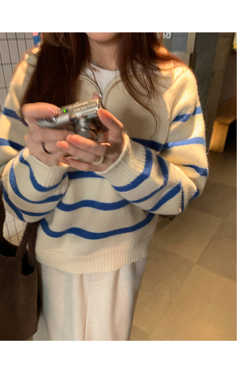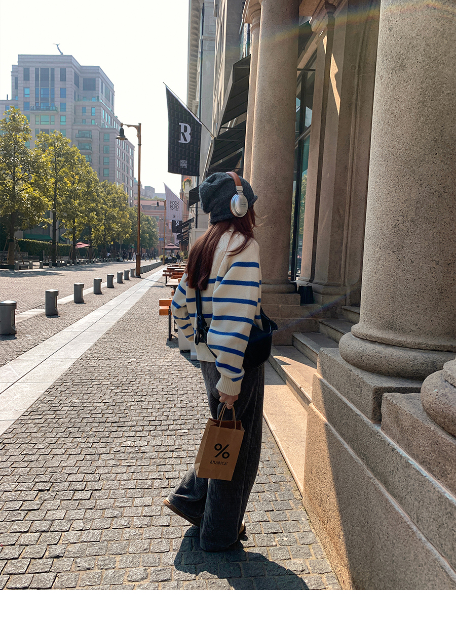 西西裏安 韓系翻領拉鍊撞色條紋毛衣女小個子寬鬆復古慵懶針織衫