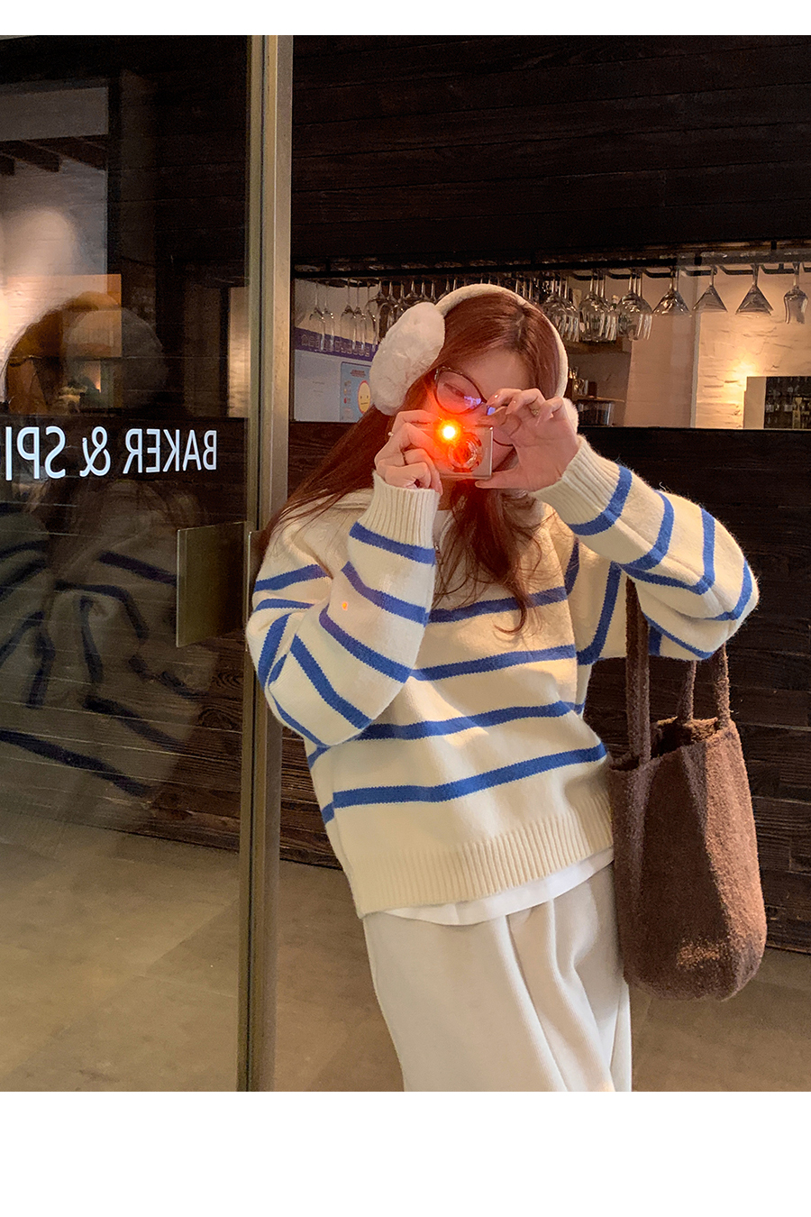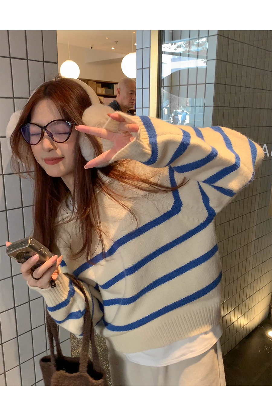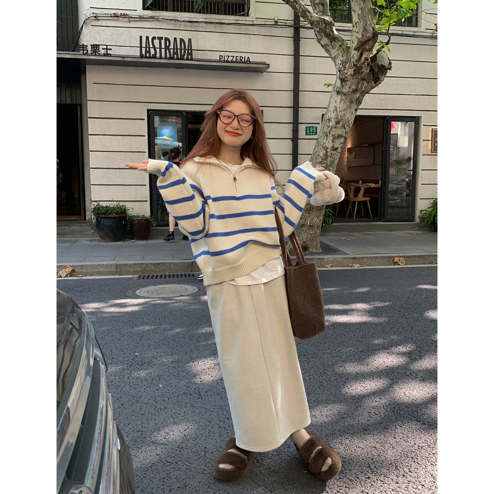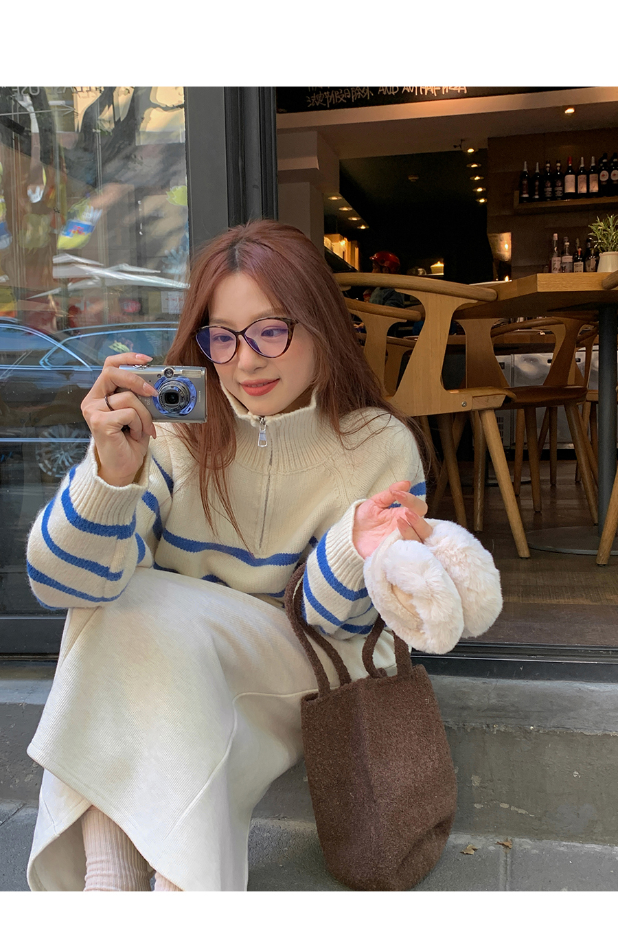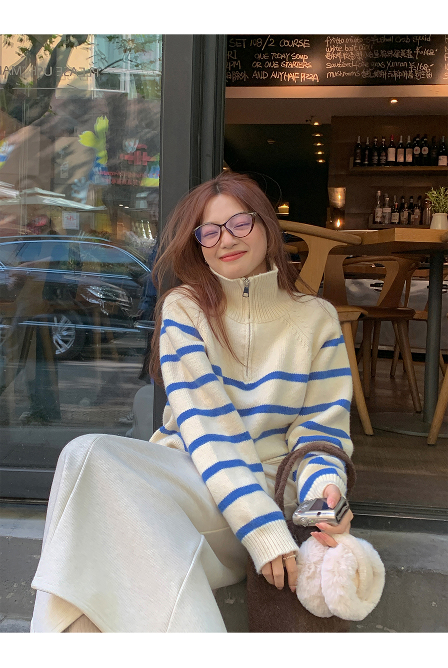 西西裏安 韓系翻領拉鍊撞色條紋毛衣女小個子寬鬆復古慵懶針織衫