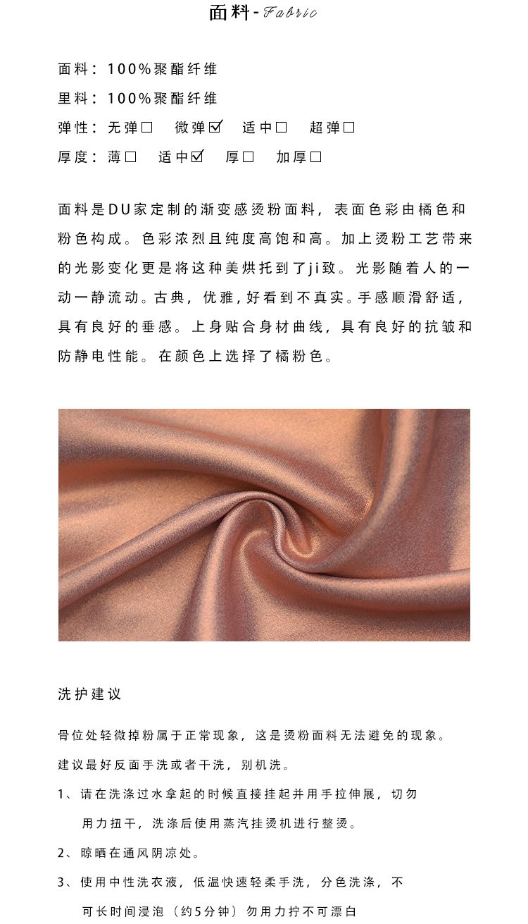 面料采用独特的烫粉工艺赋予裙子DU特的色彩变化
