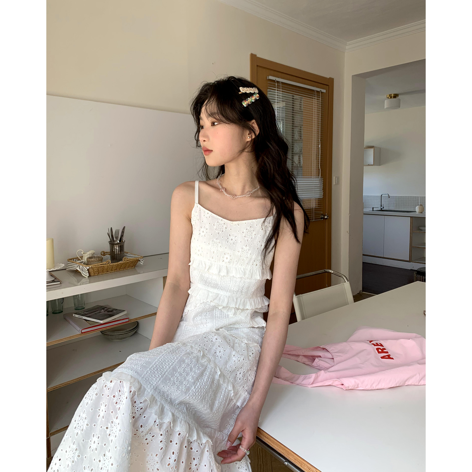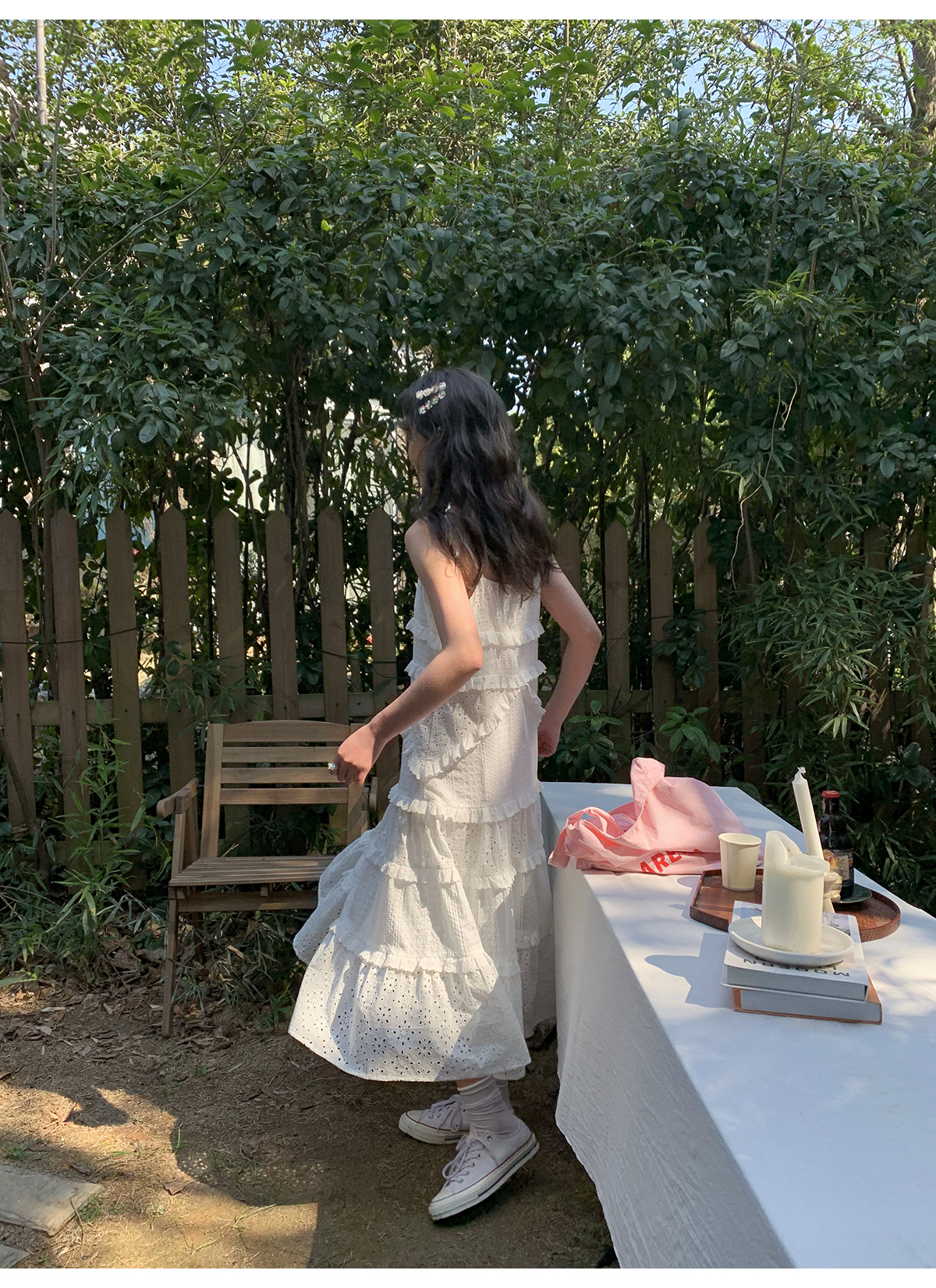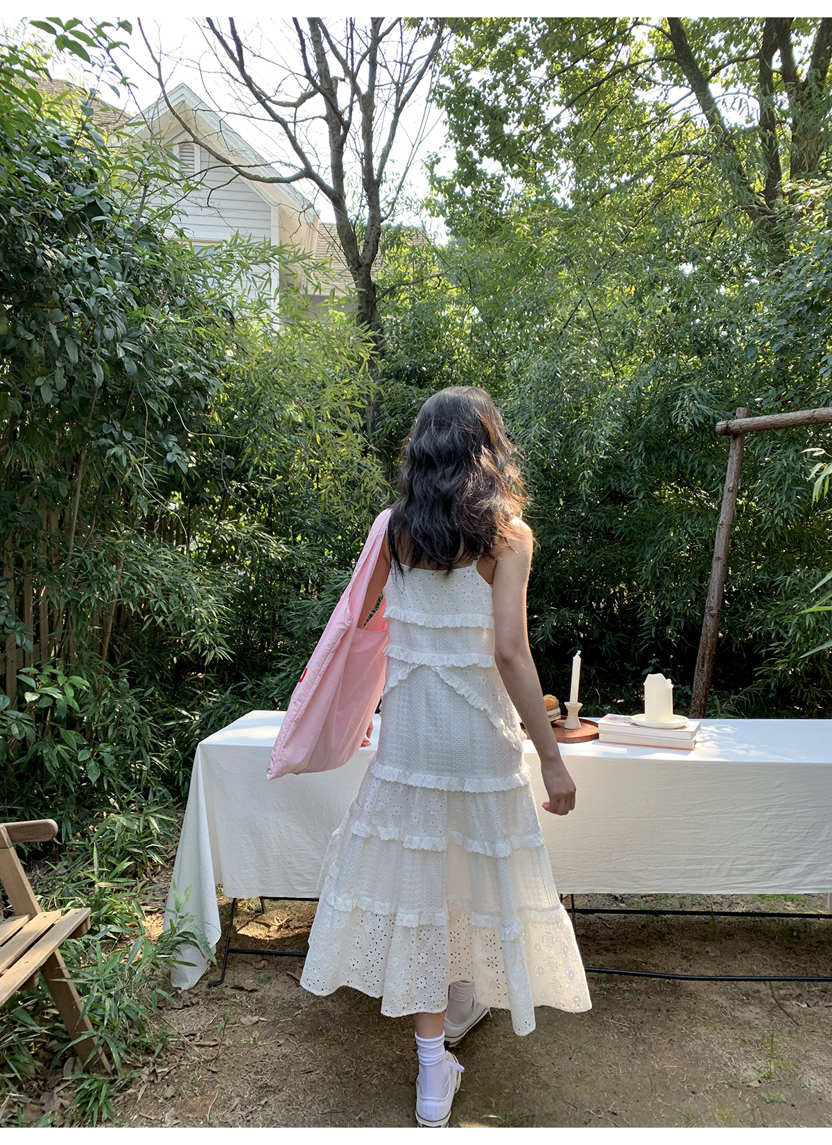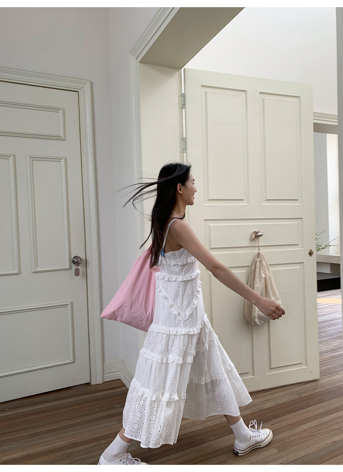 你好卡農 木耳花邊白色連衣裙2023女新款夏小個子a字中長版吊帶裙