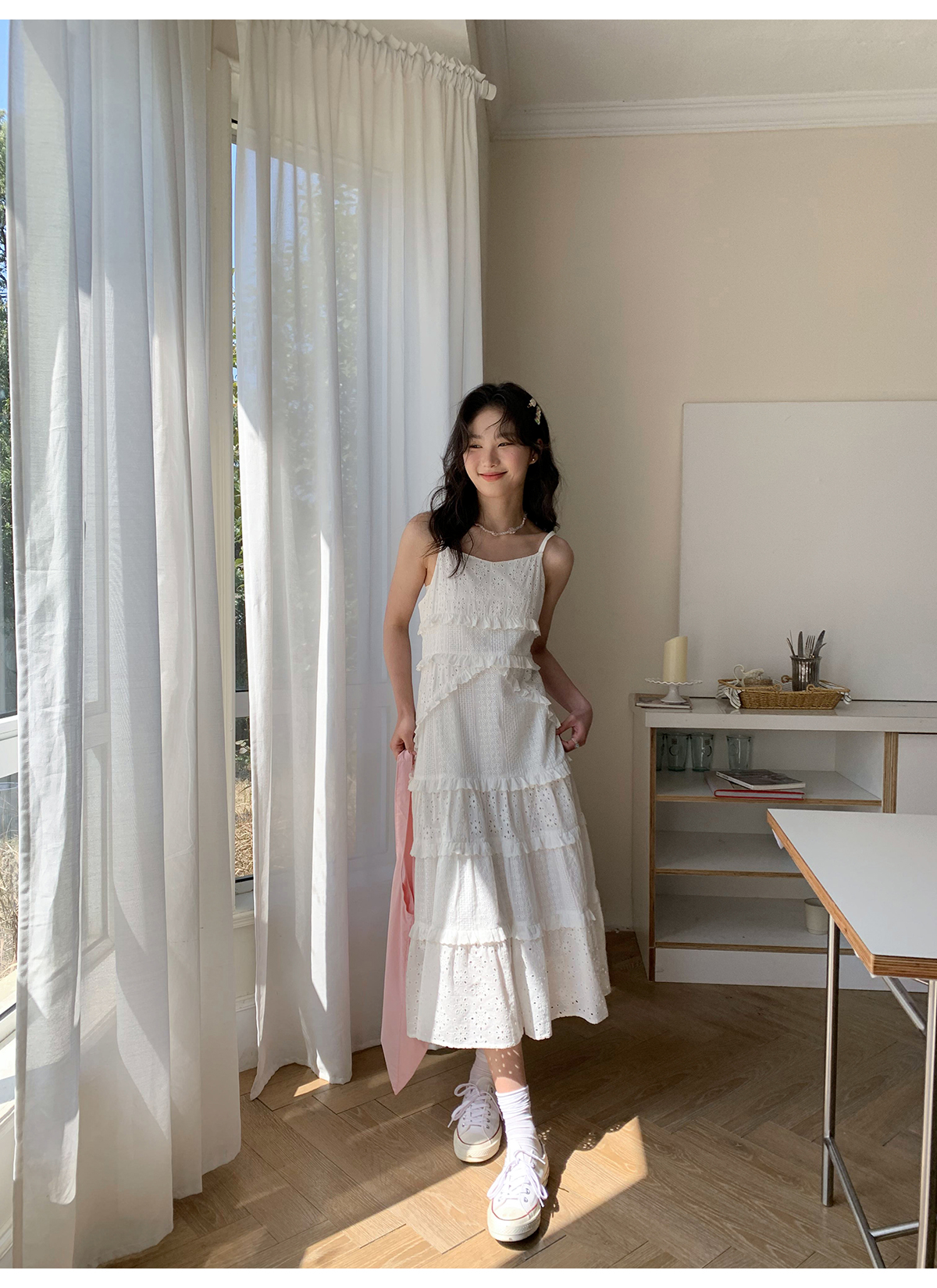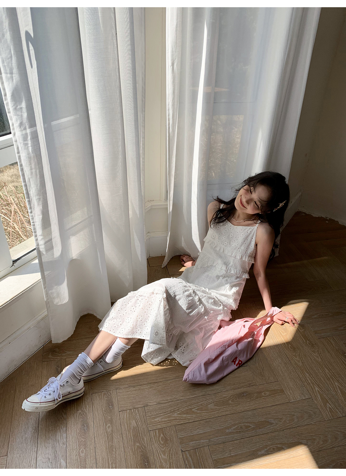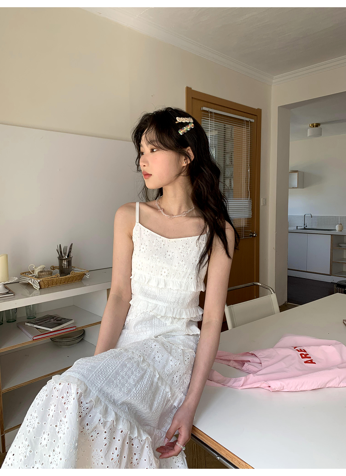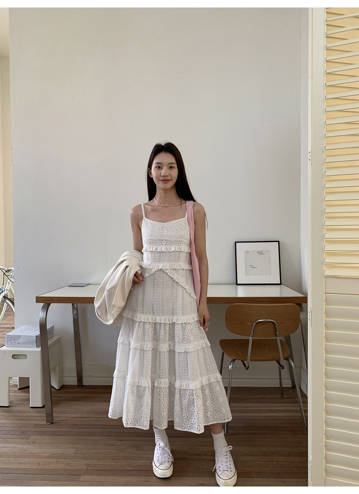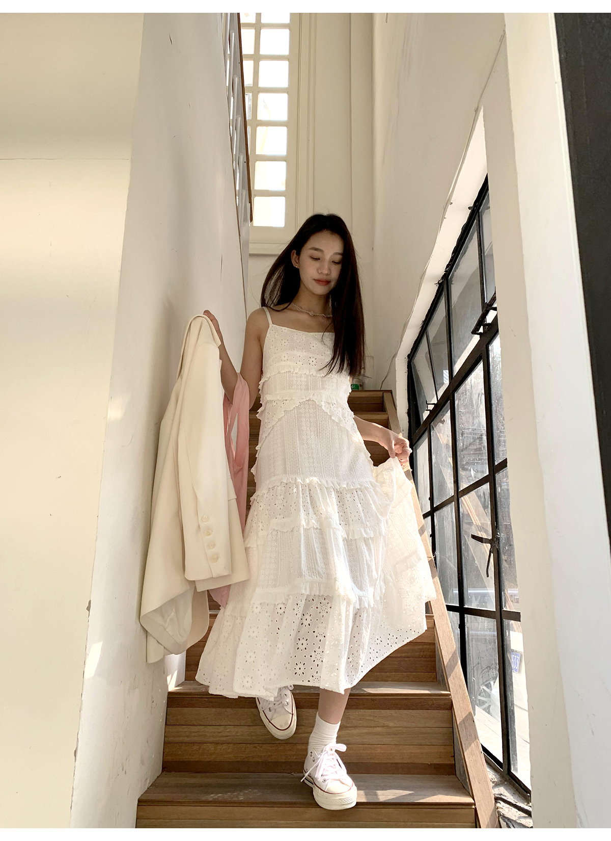 你好卡農 木耳花邊白色連衣裙2023女新款夏小個子a字中長版吊帶裙