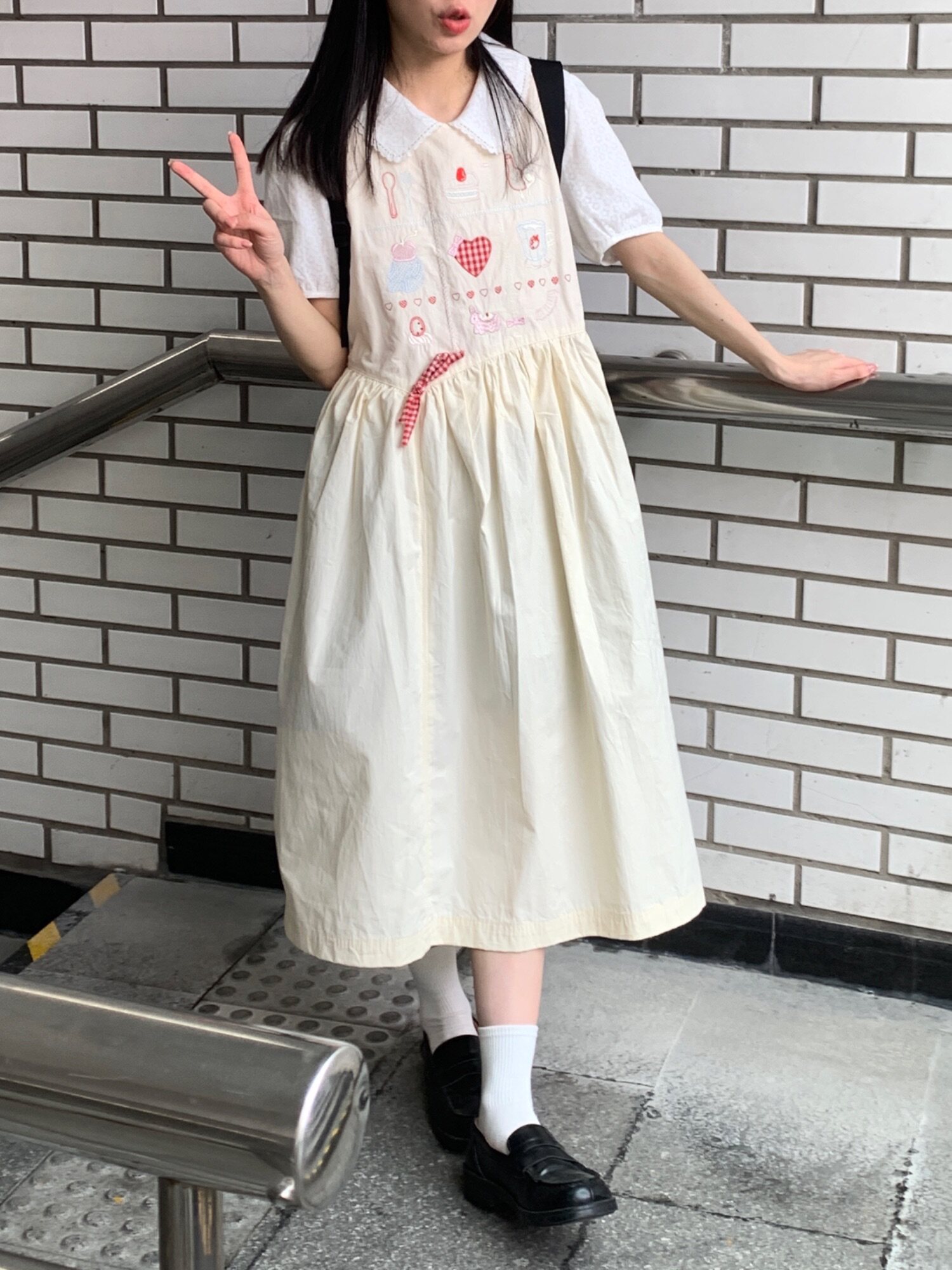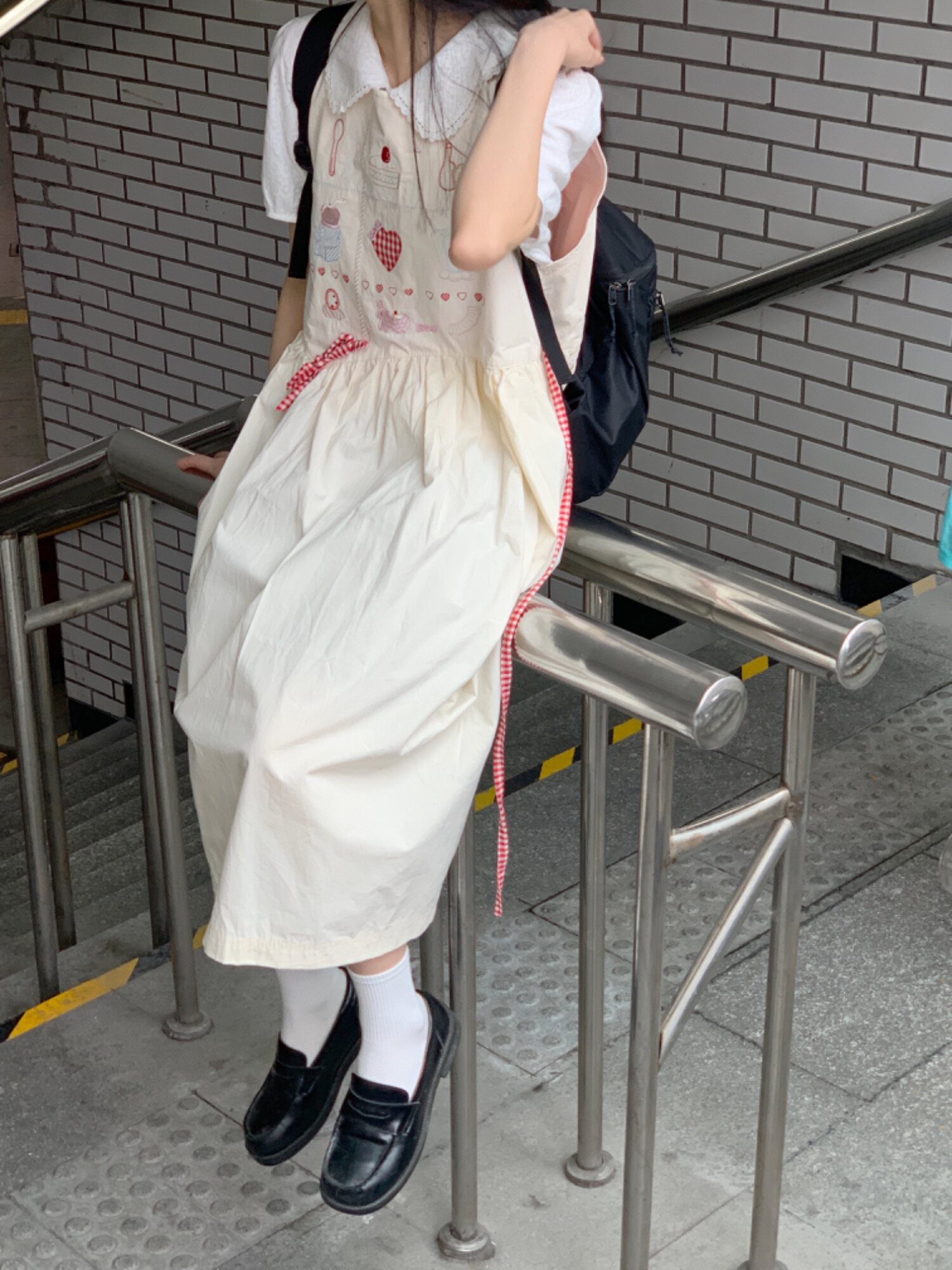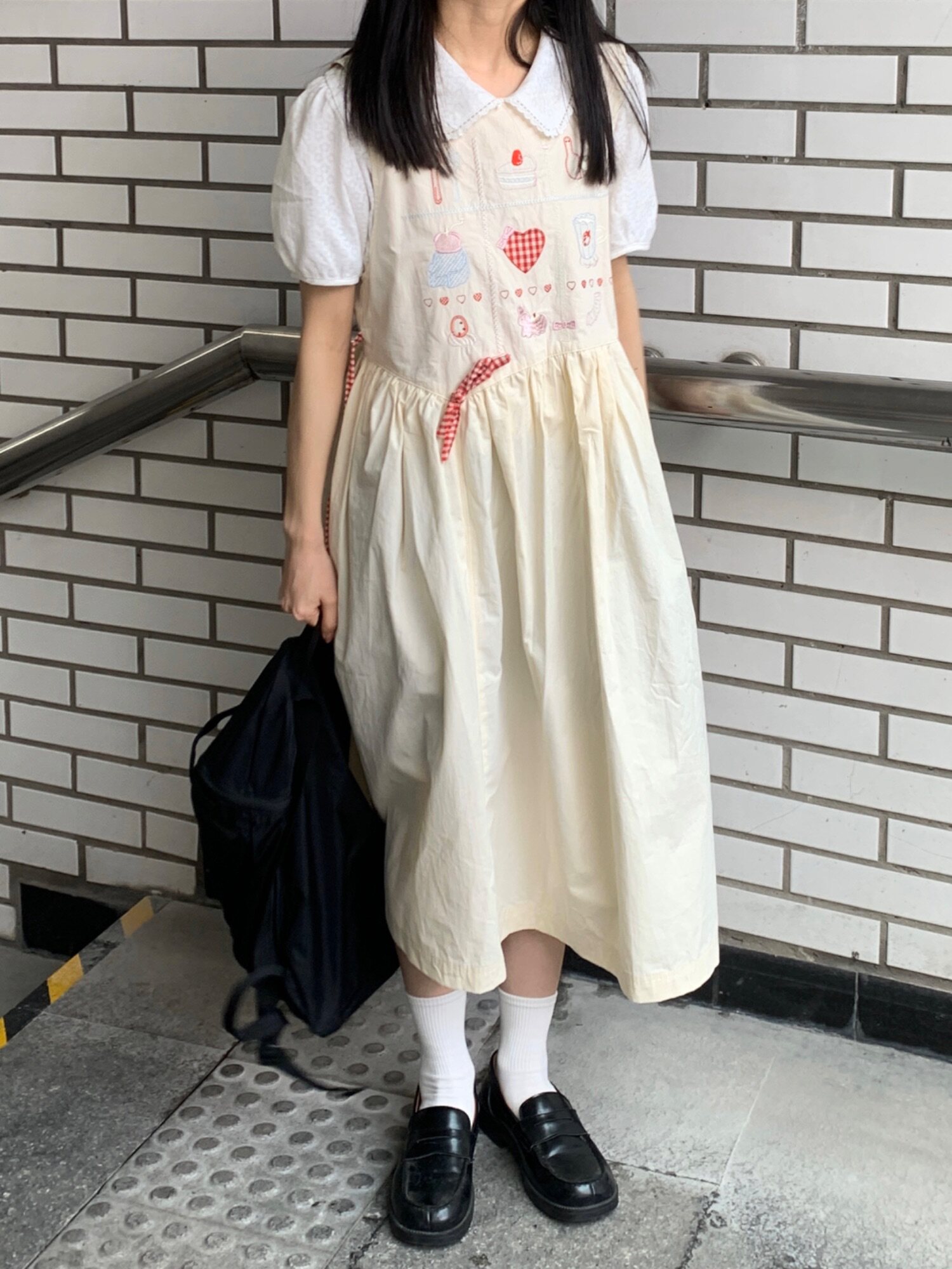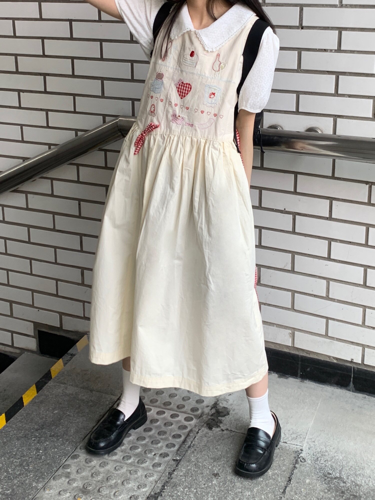 香蕉脫掉了 日系九宮格刺繡洋裝 寬鬆圓領元氣少女無袖背心裙