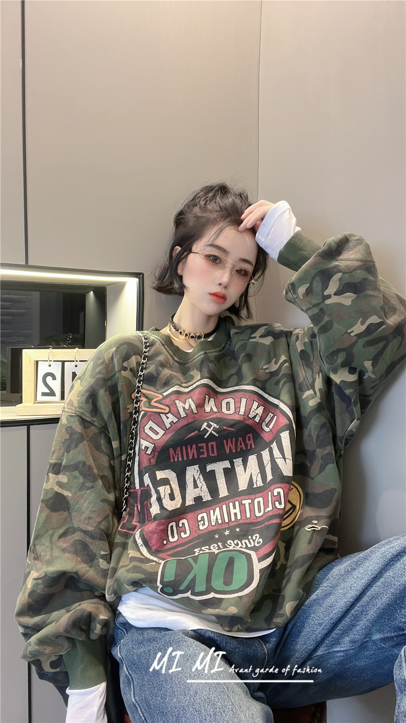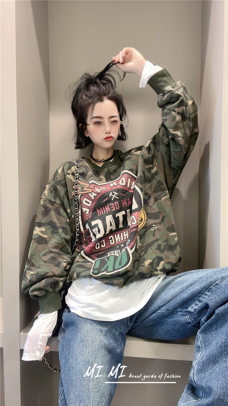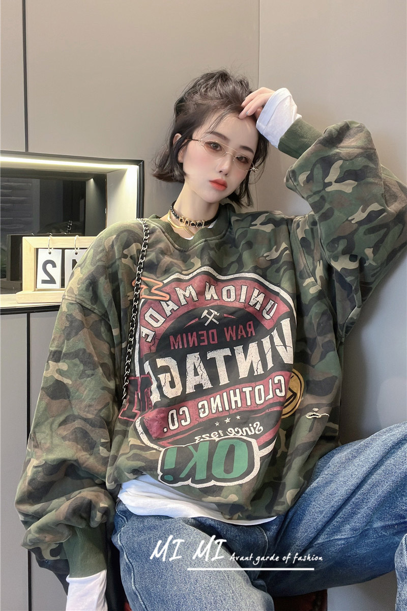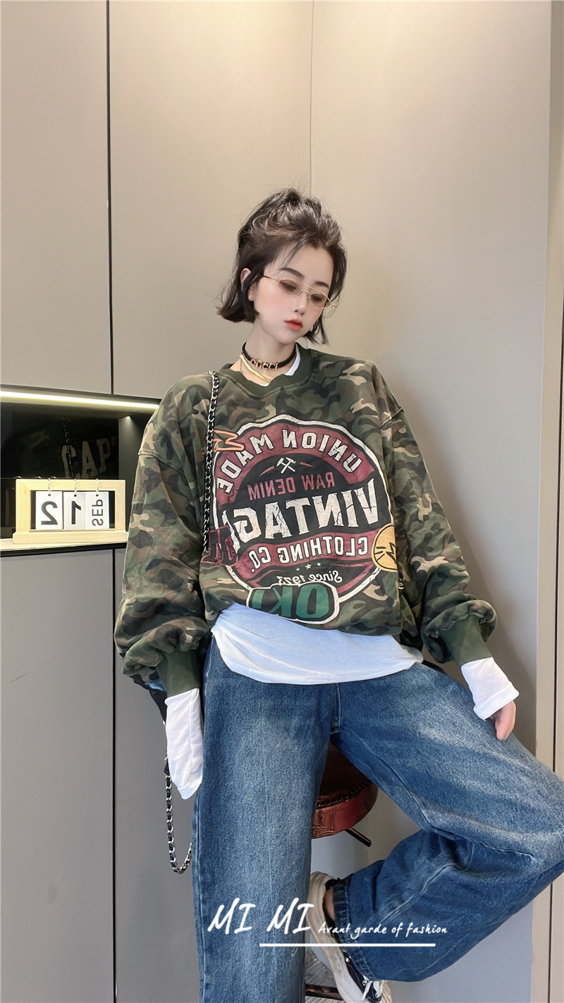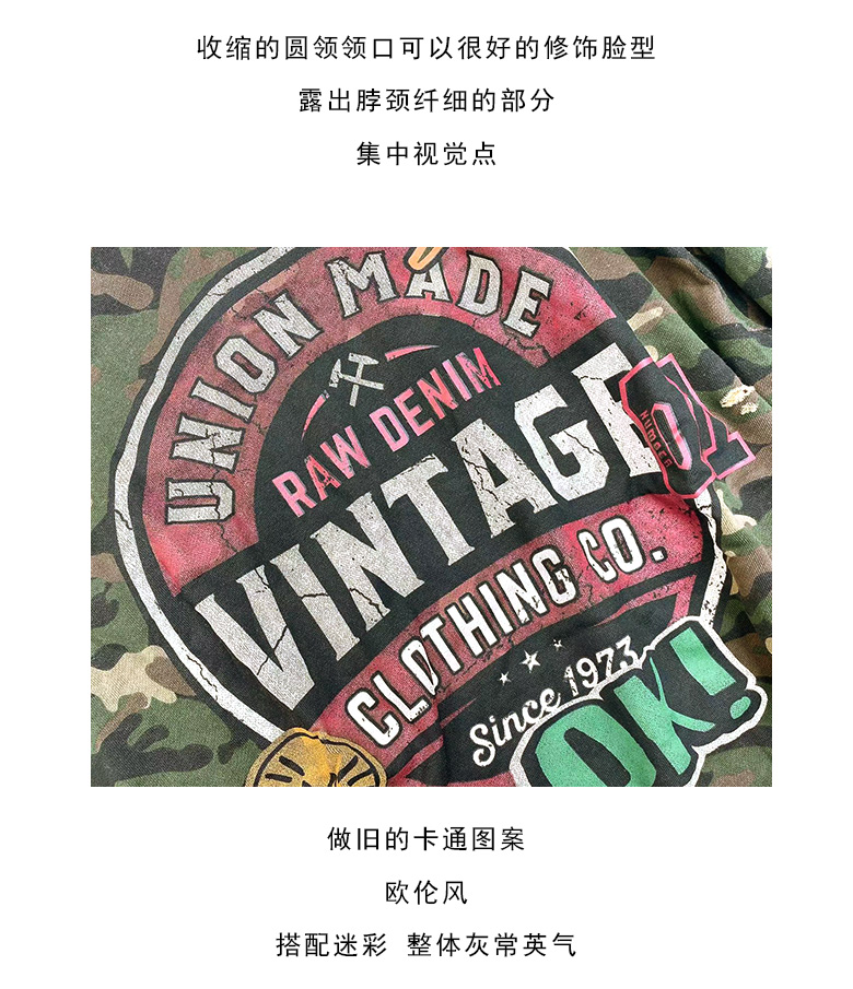 拼色字母迷彩衛衣女2023秋季新款設計感復古寬鬆休閒套頭短上衣