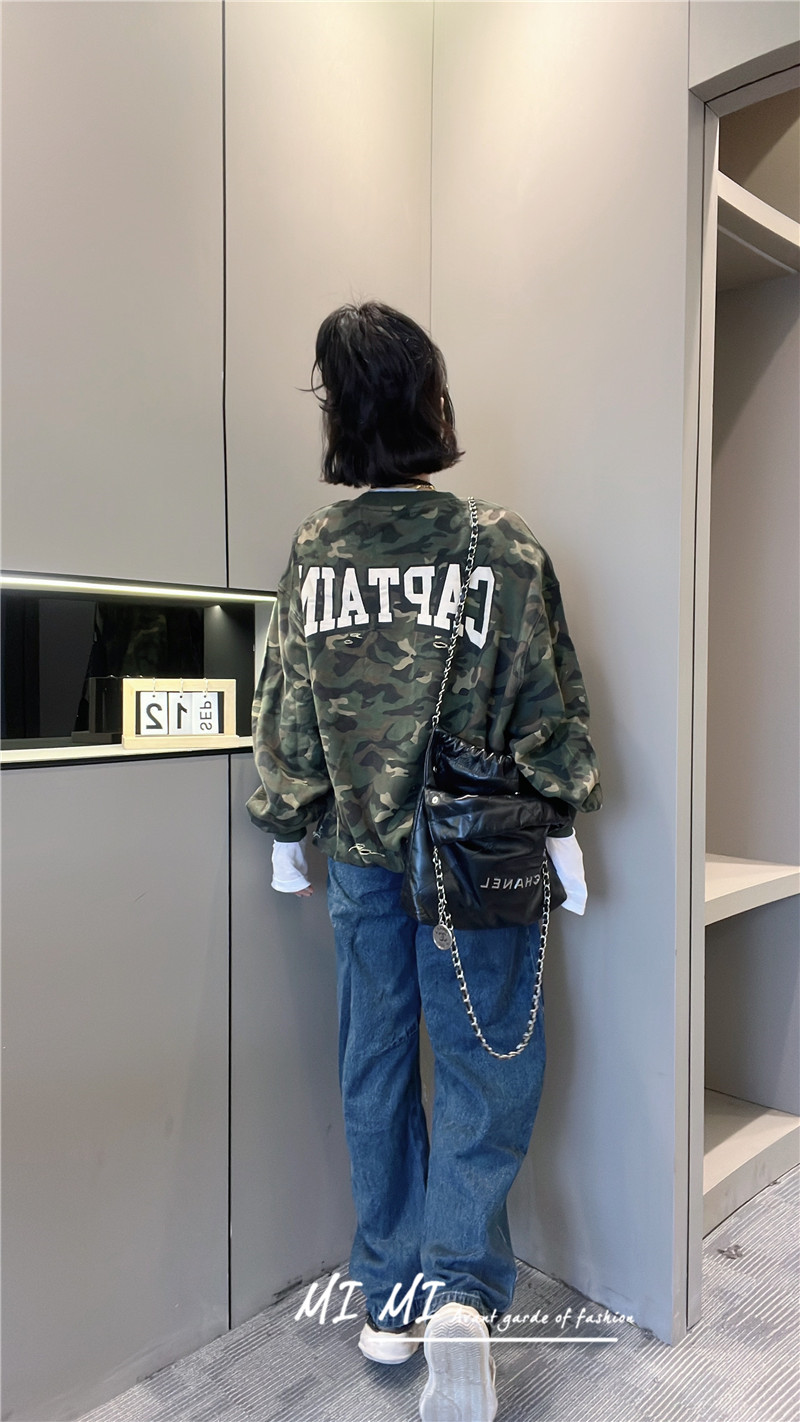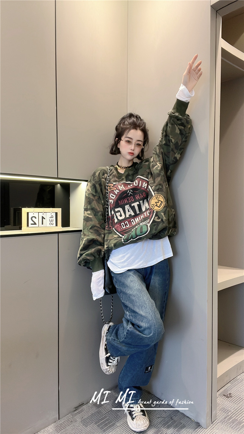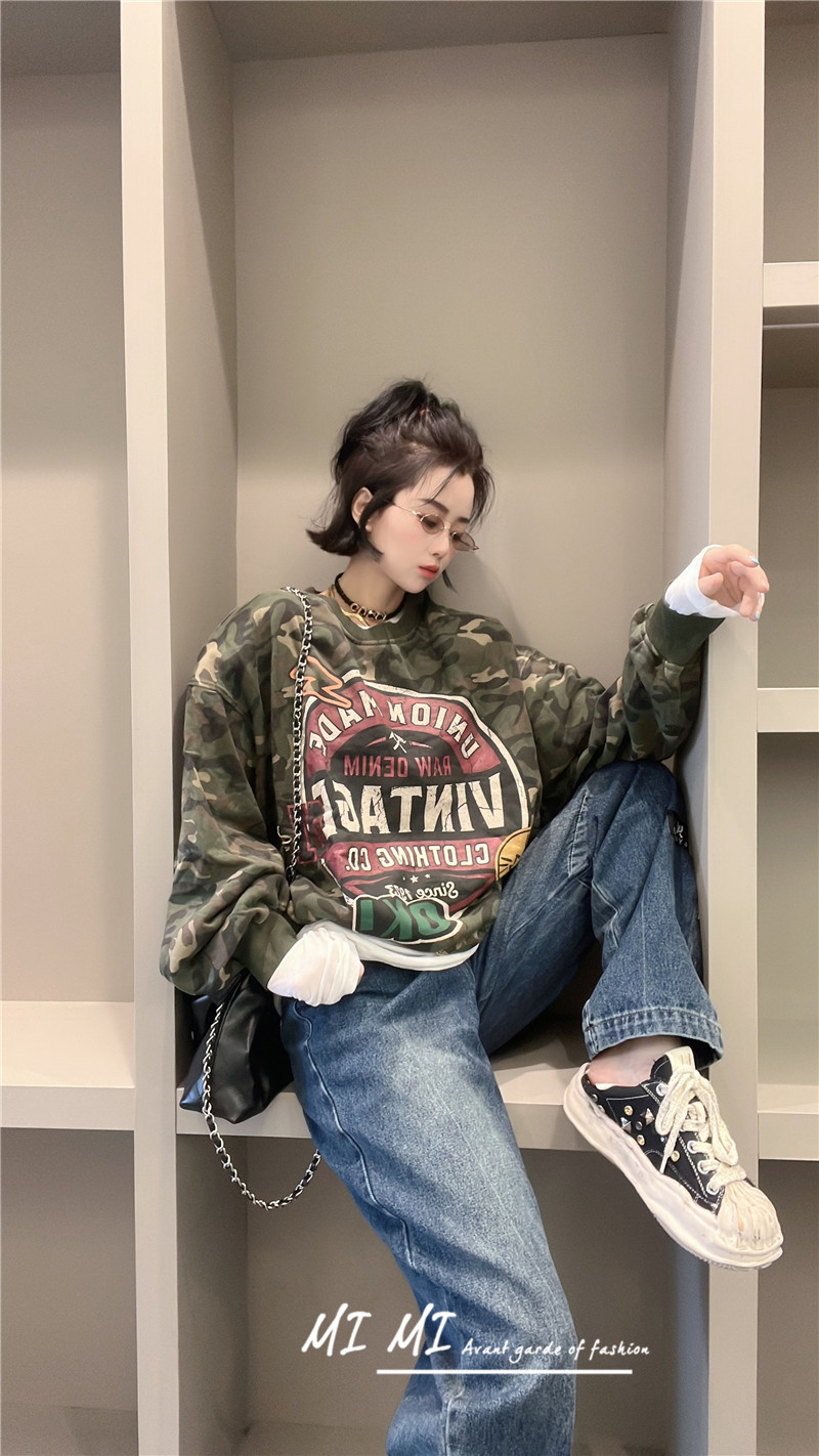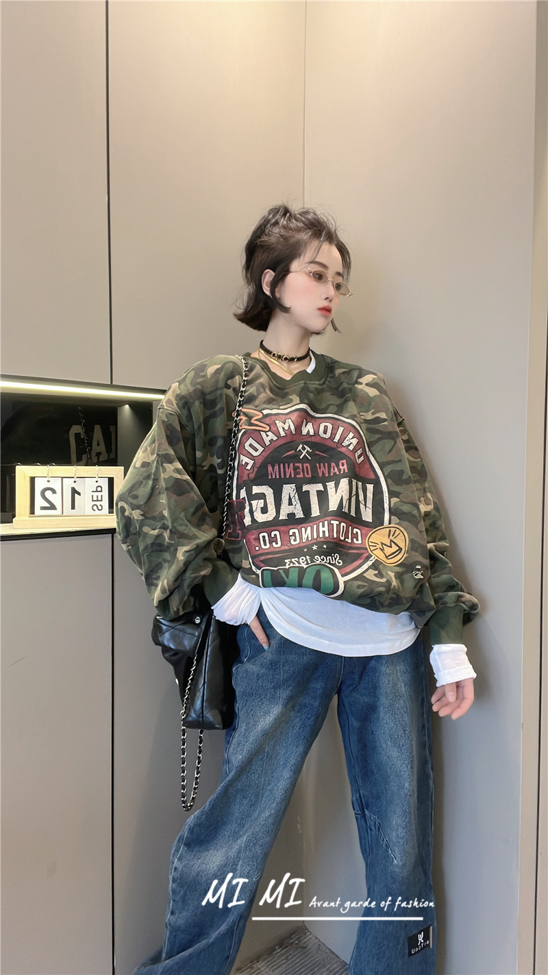 拼色字母迷彩衛衣女2023秋季新款設計感復古寬鬆休閒套頭短上衣