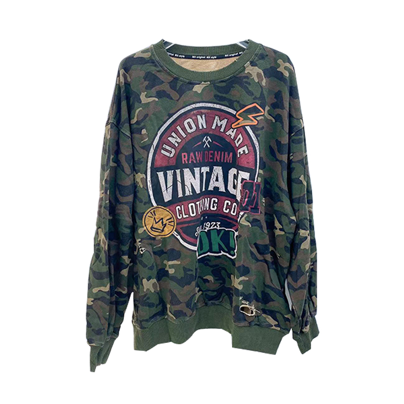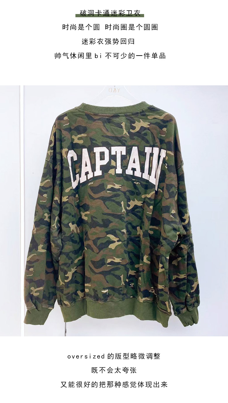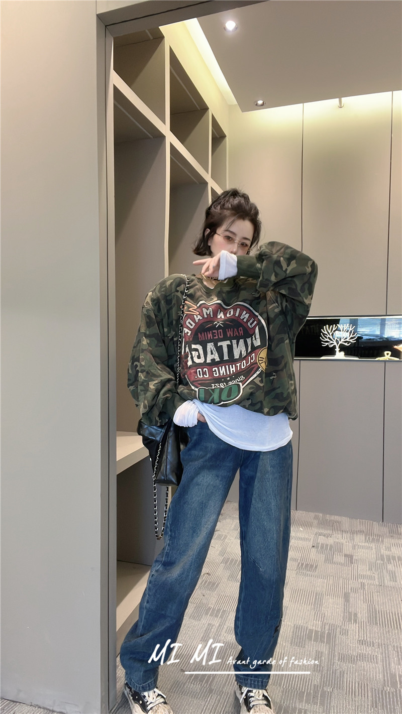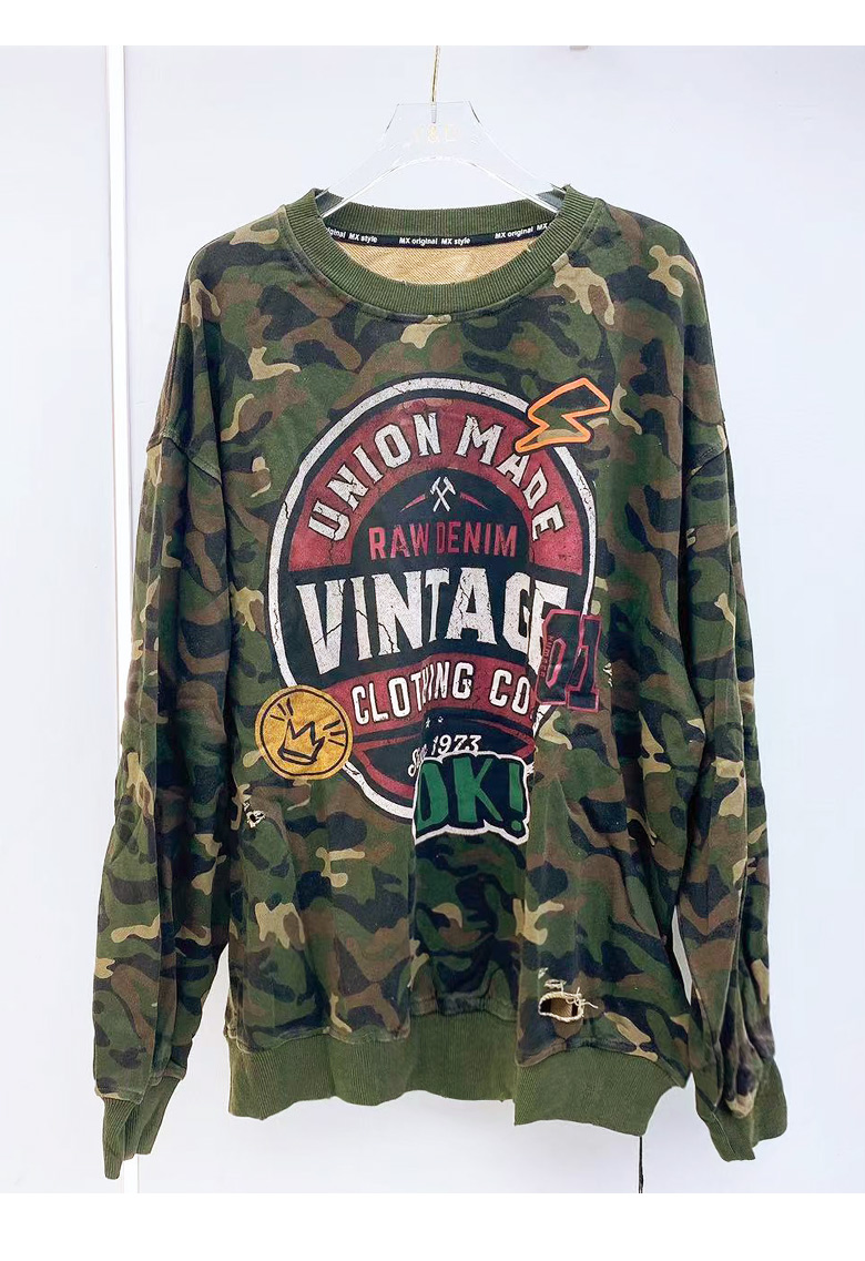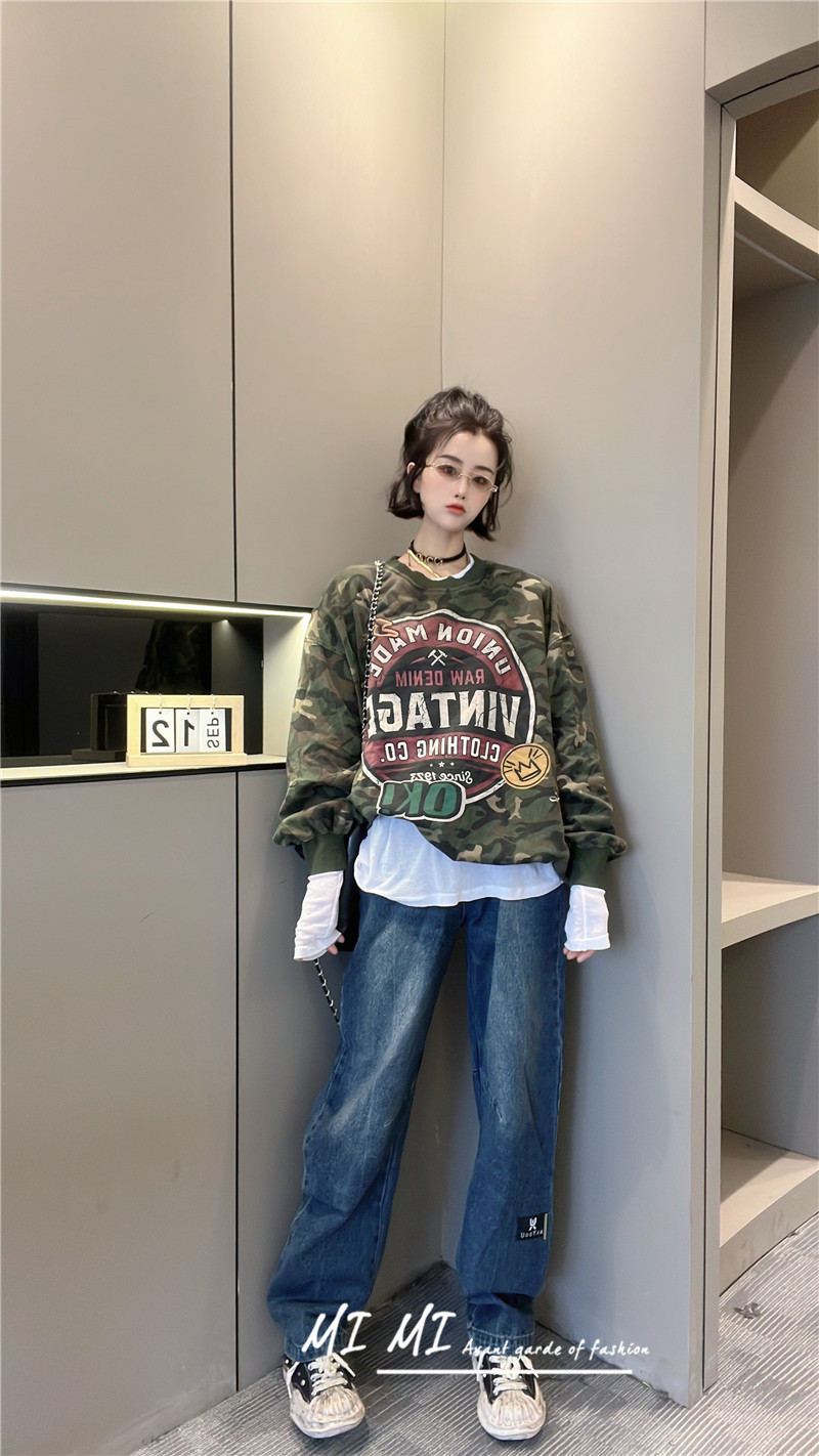 拼色字母迷彩衛衣女2023秋季新款設計感復古寬鬆休閒套頭短上衣