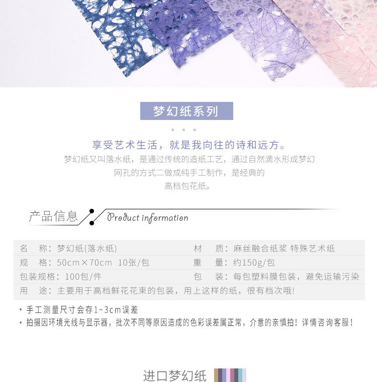材质:麻丝融合纸浆 特殊艺术纸 规格:50cm×70cm 10张/包