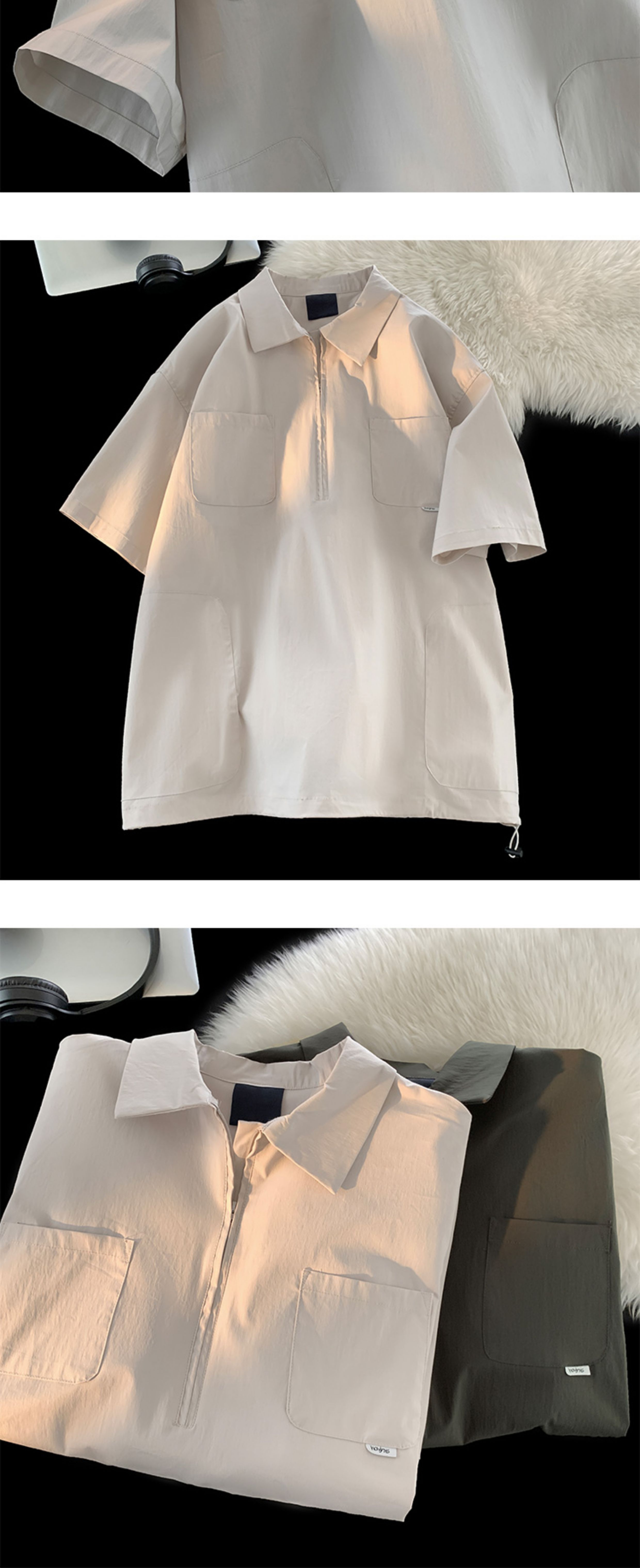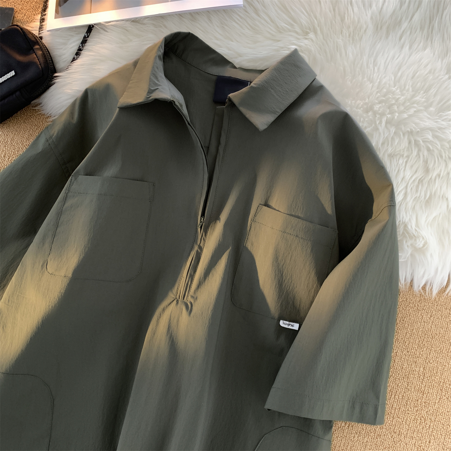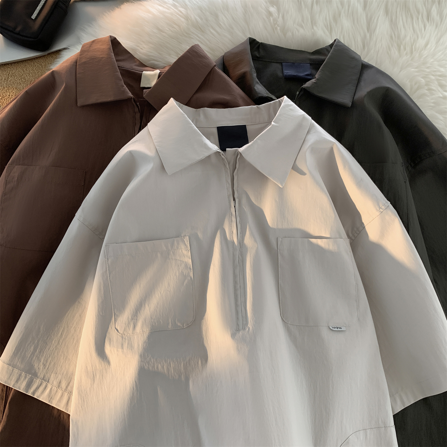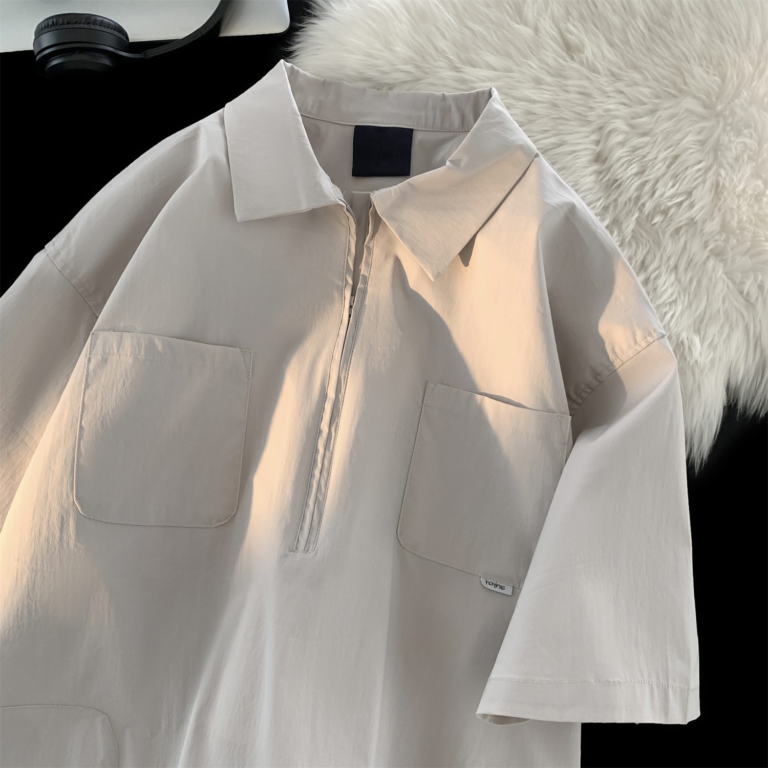 日系半拉鍊polo衫男夏季潮牌翻領短袖t恤ins潮流簡約寬鬆百搭襯衫
