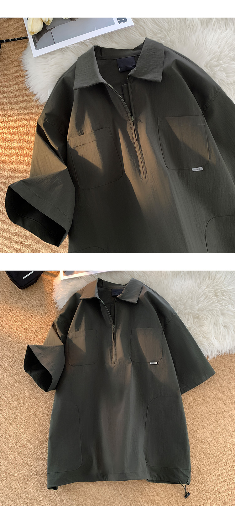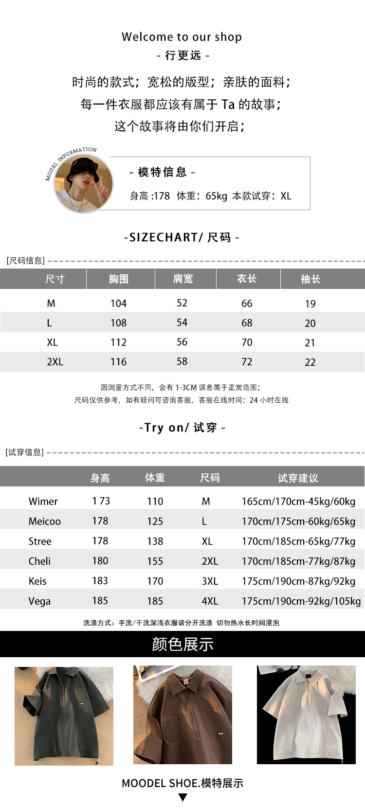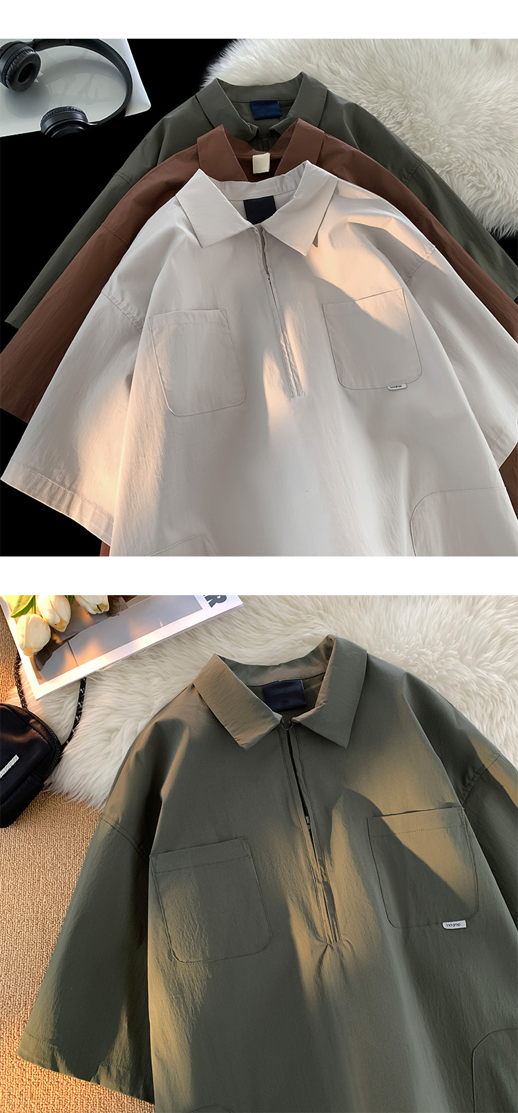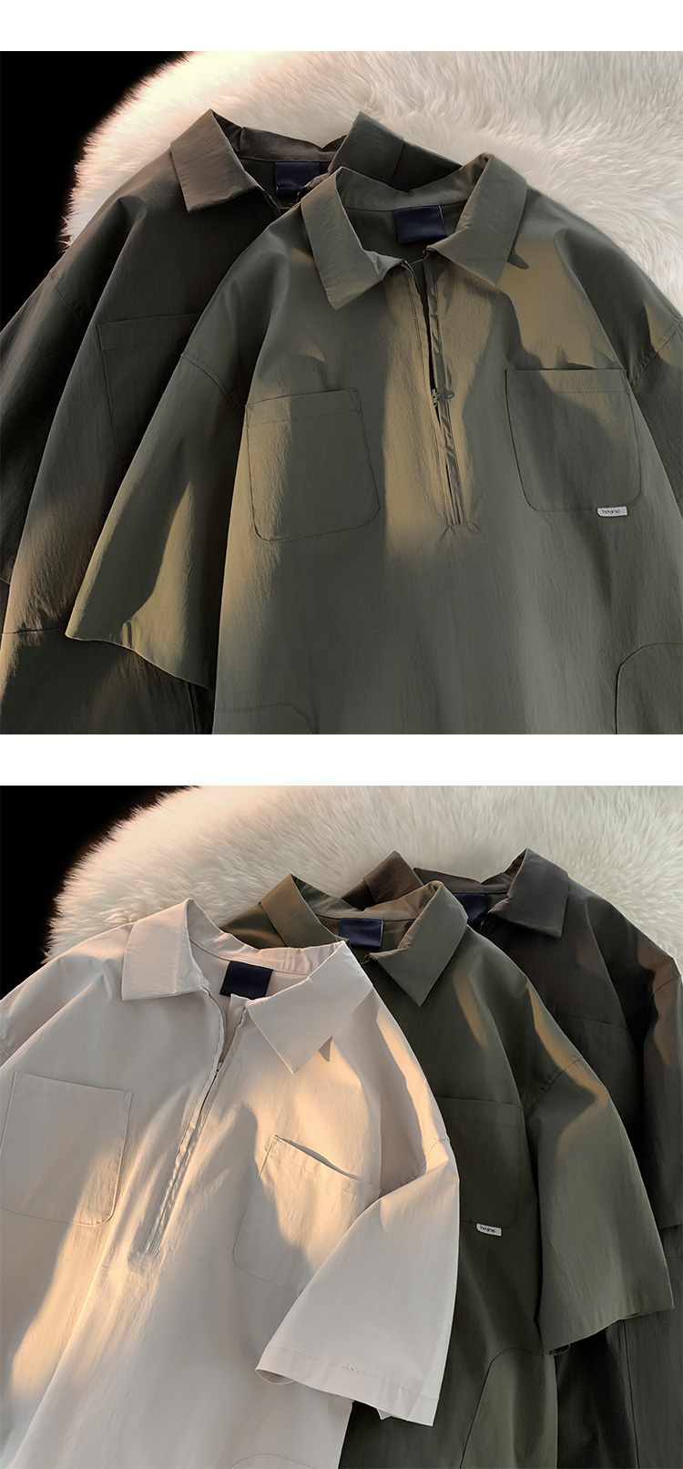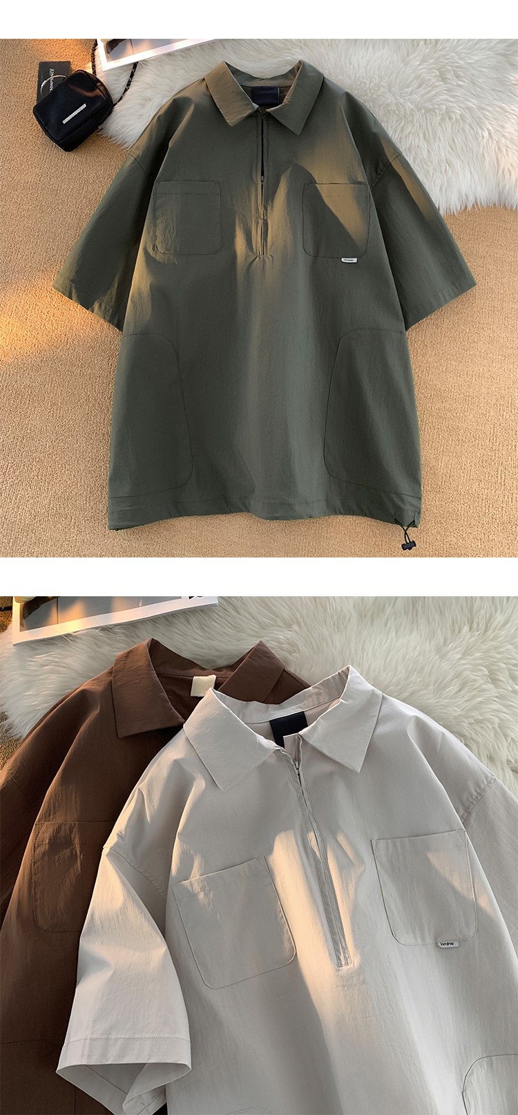 日系半拉鍊polo衫男夏季潮牌翻領短袖t恤ins潮流簡約寬鬆百搭襯衫