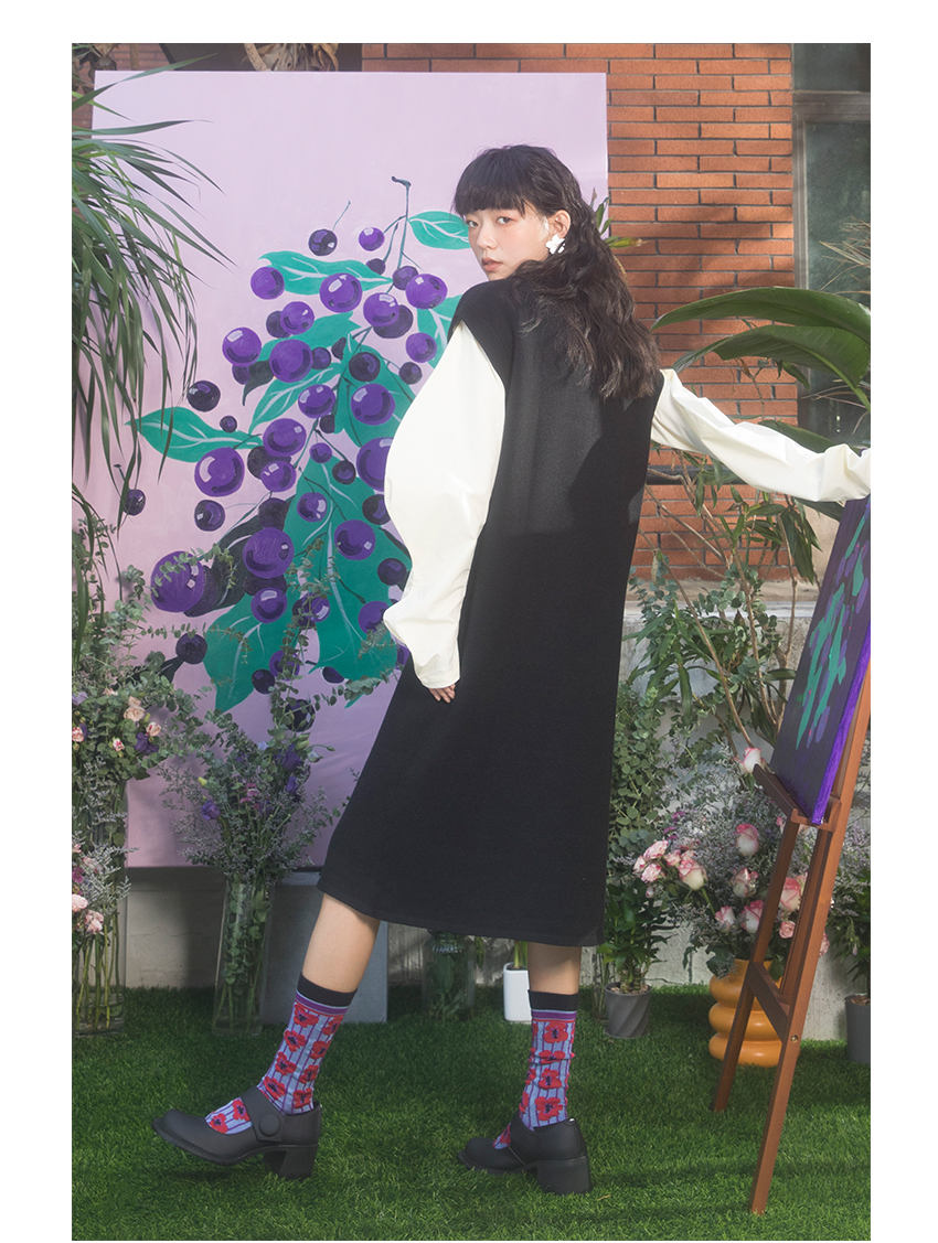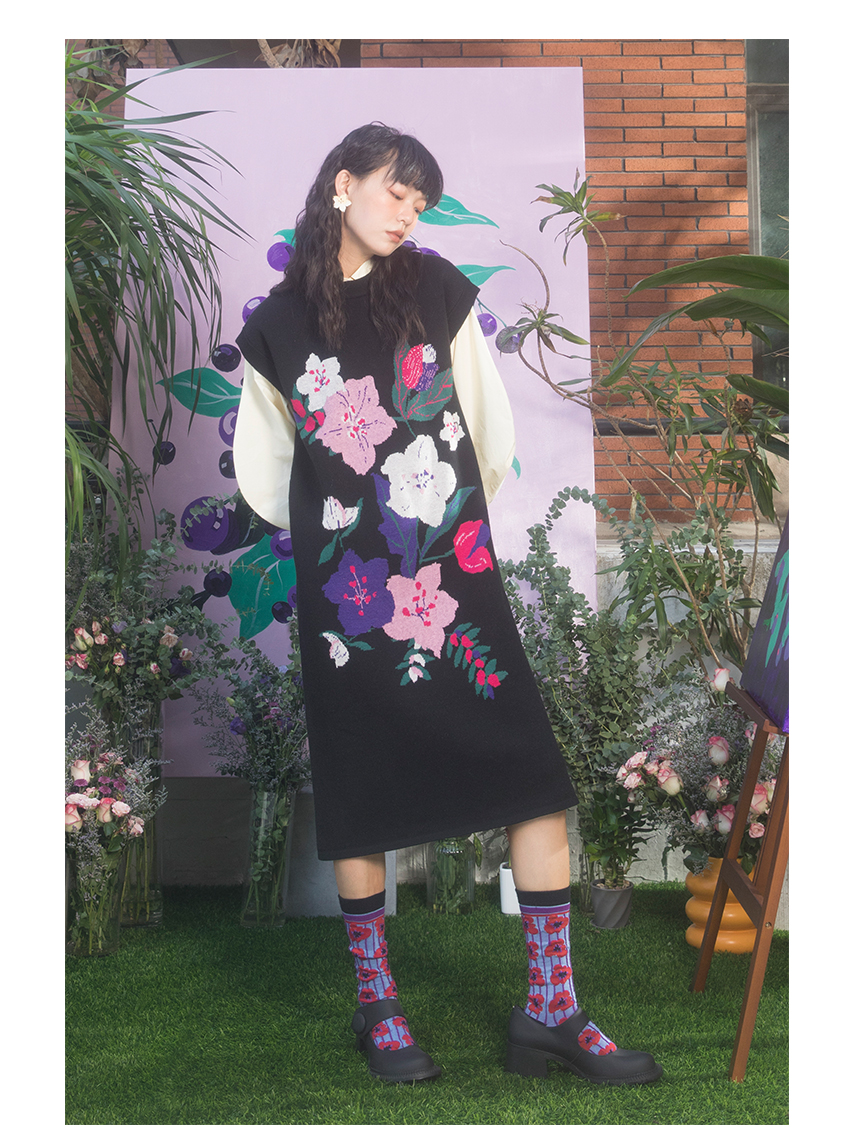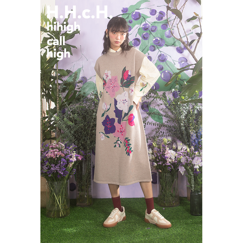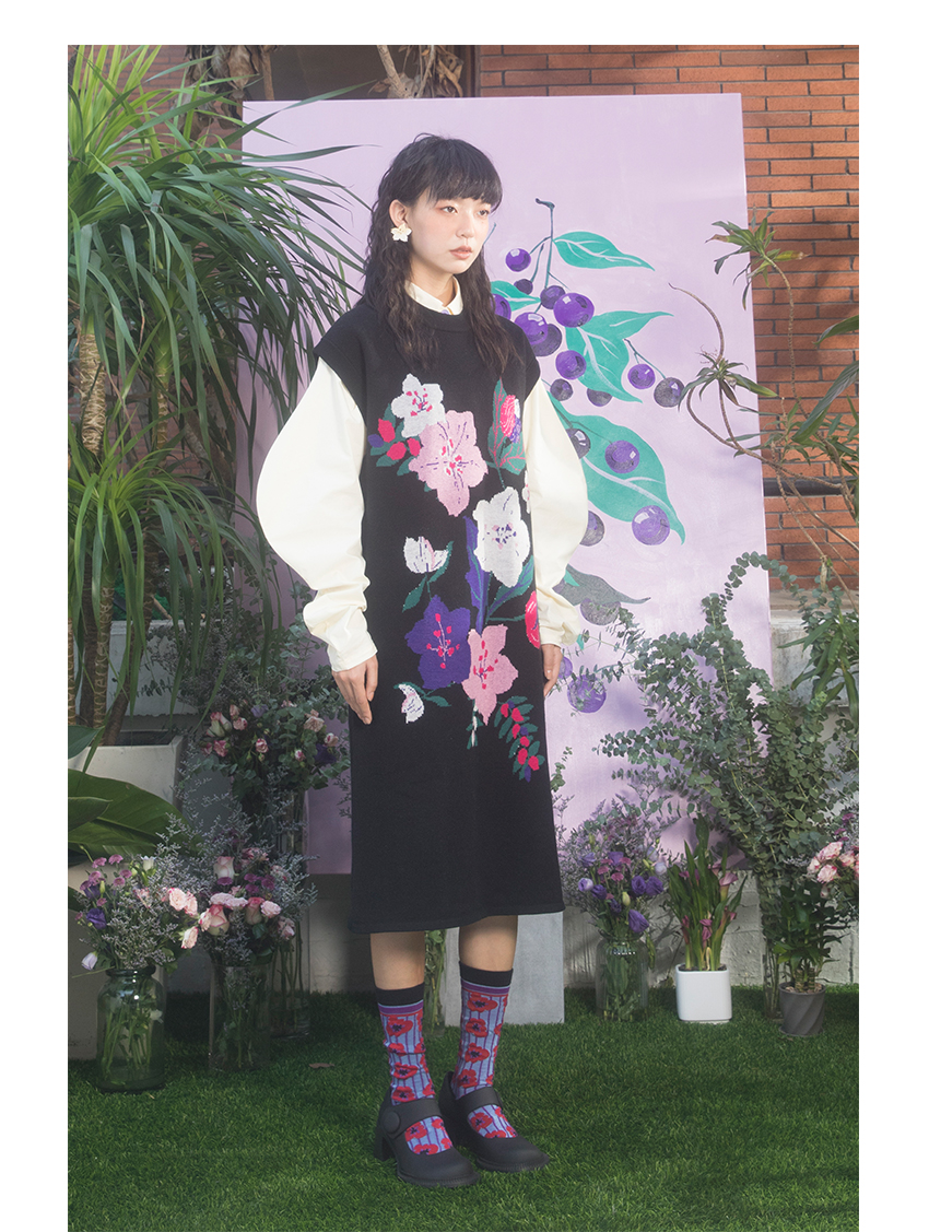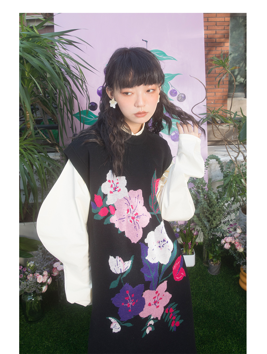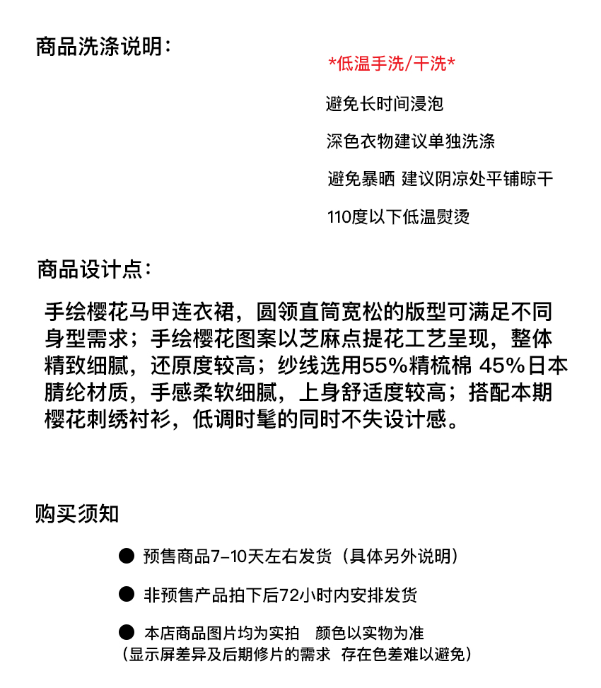 HHCH口海 日系復古少女手繪櫻花圖案寬鬆馬甲背心針織無袖洋裝