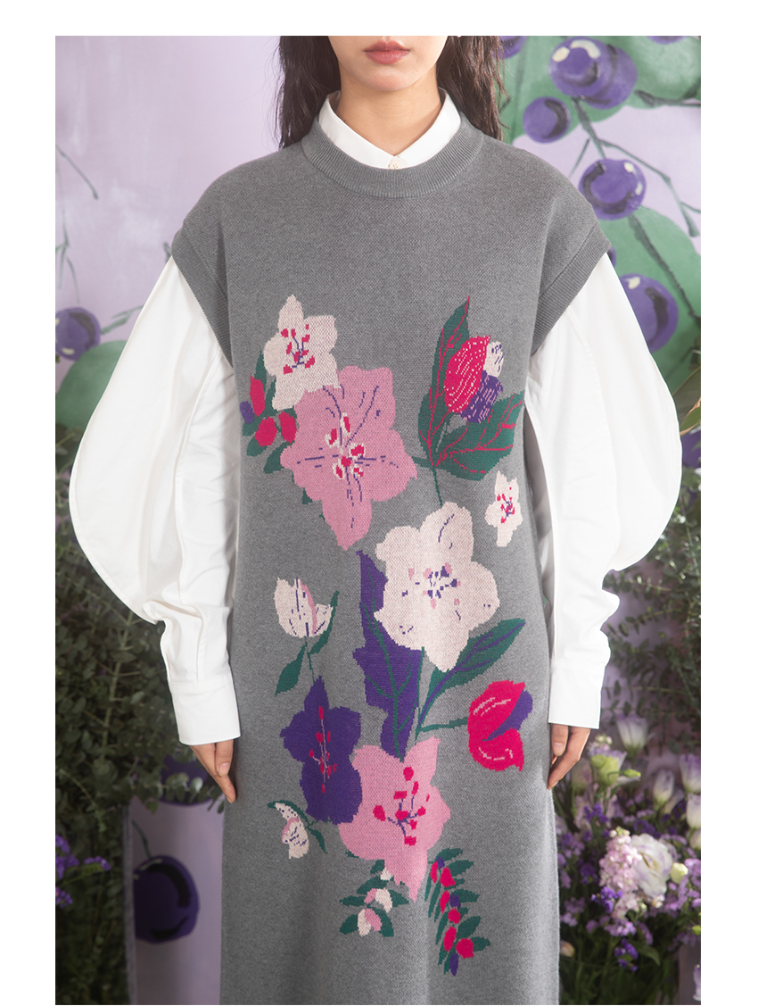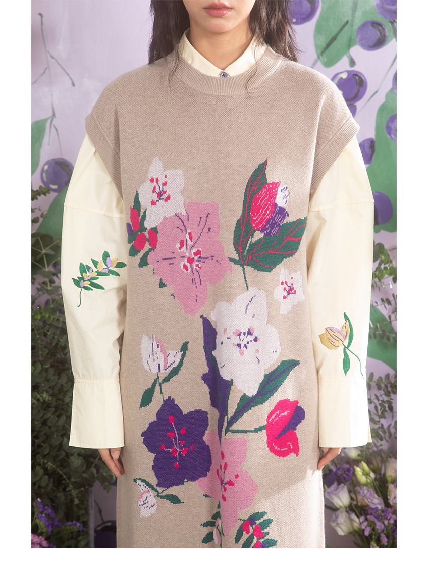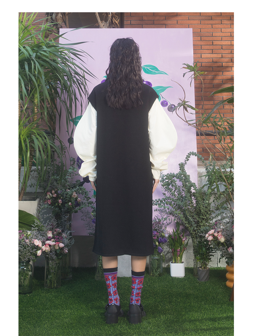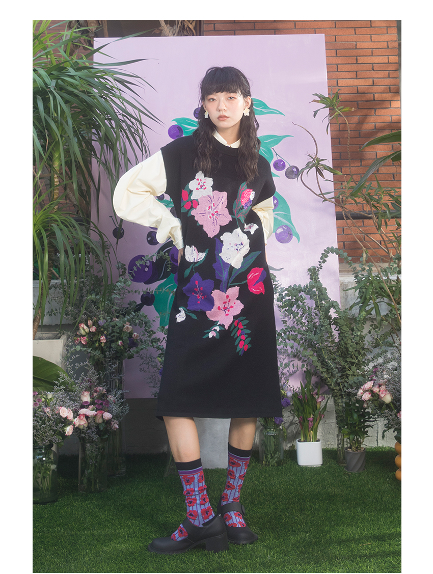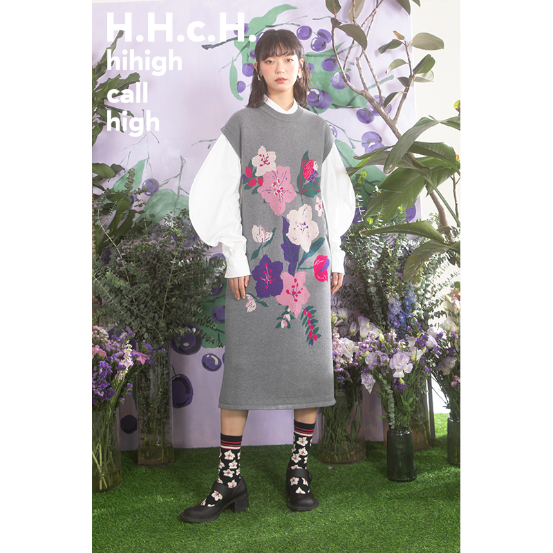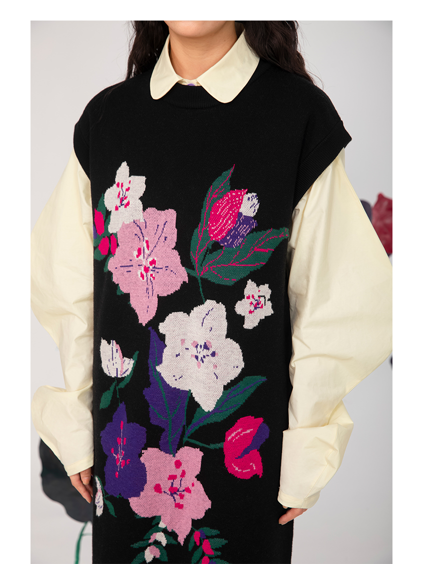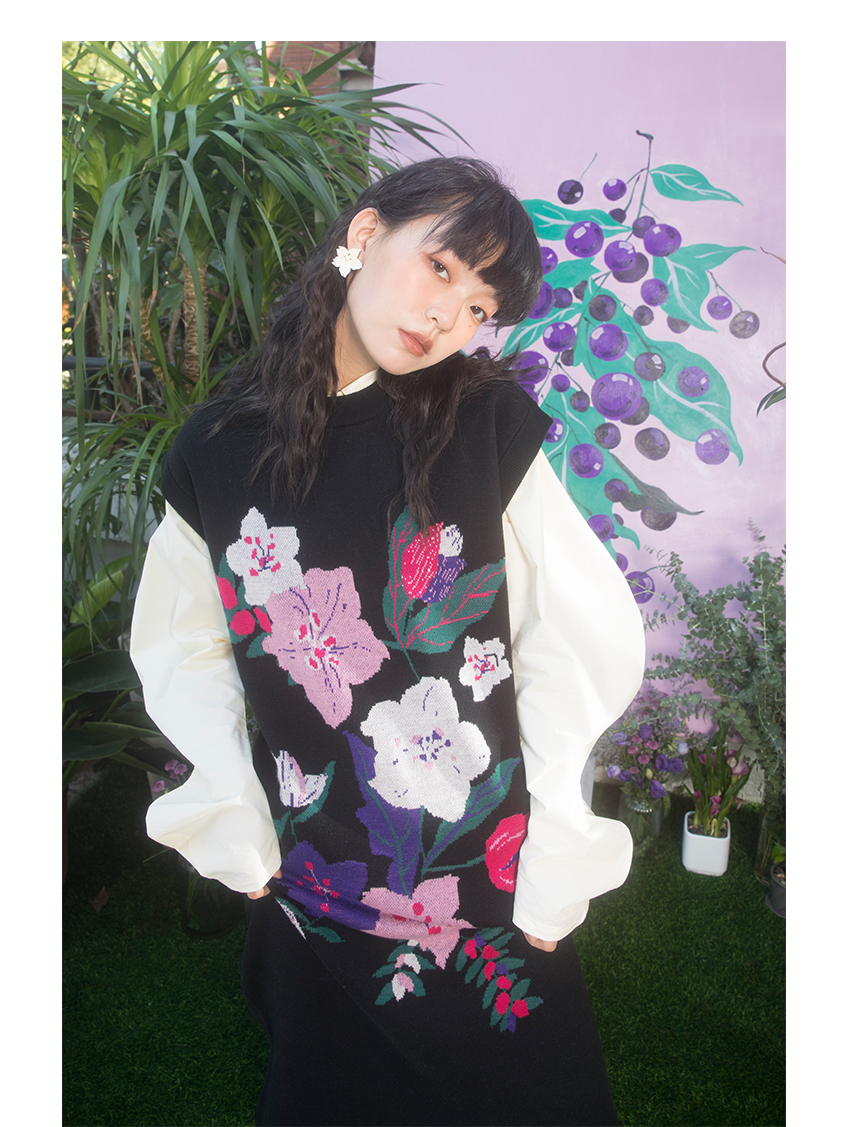 HHCH口海 日系復古少女手繪櫻花圖案寬鬆馬甲背心針織無袖洋裝