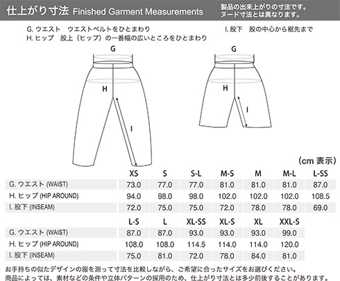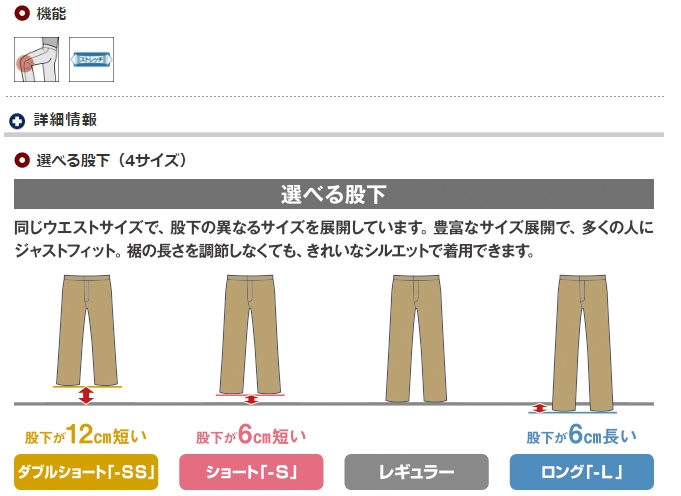 同じウエストサイズで、股下が6cm長い「ロング(-L)」モデル、股下が6cm短い「ショート(-S)」モデル、股下が12cm短い「ダブルショート(-SS)」モデルを展開しています。裾の長さを調節しなくても、きれいなシルエットで着用できます。
